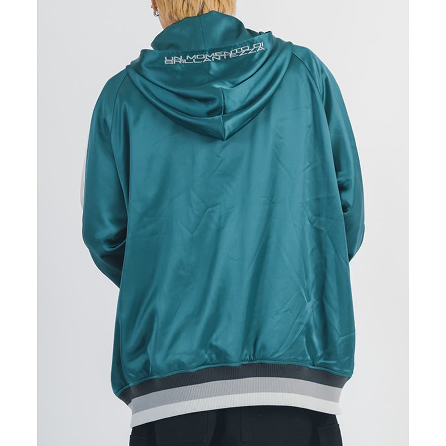 フロントファスナーは上まで閉めると顎まで覆え、裏地も装備したアウター仕様。胸とフードトップにはワンポイントの刺繍があり、袖は幅広のラインを配置したスポーティーなデザインで、袖口と裾のリブは3色のグラデーションが可愛い。