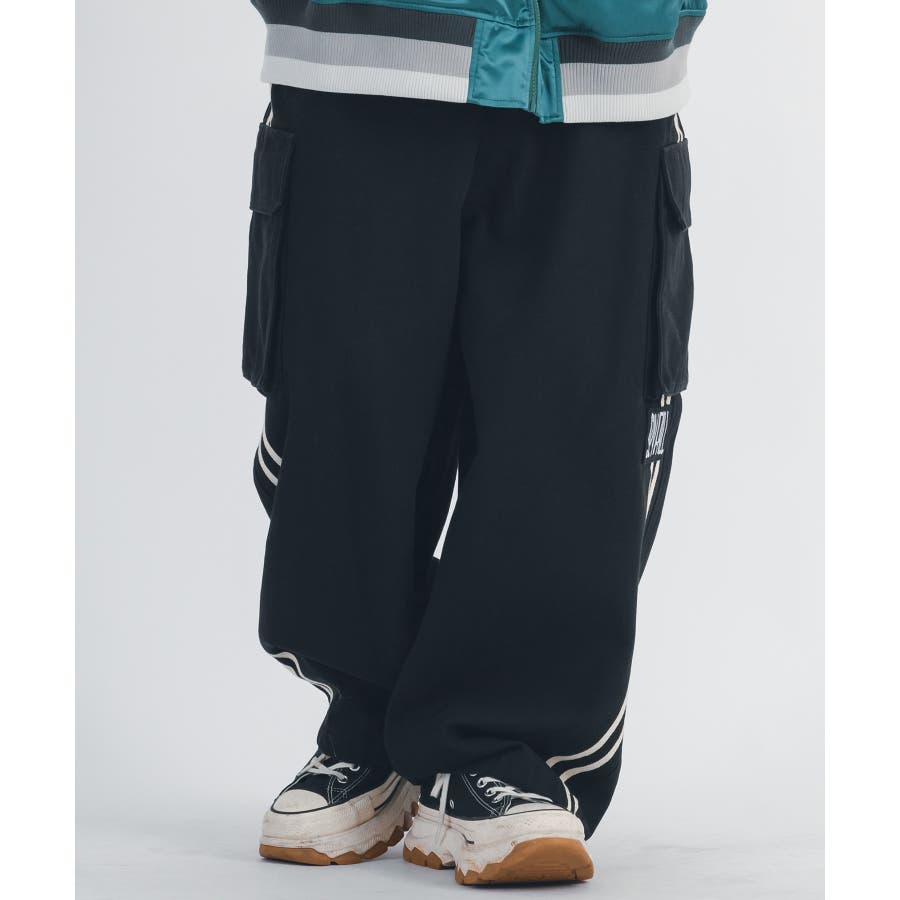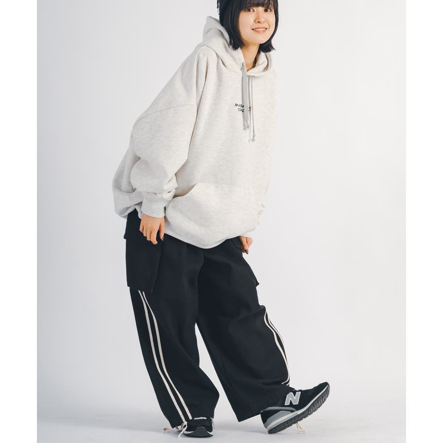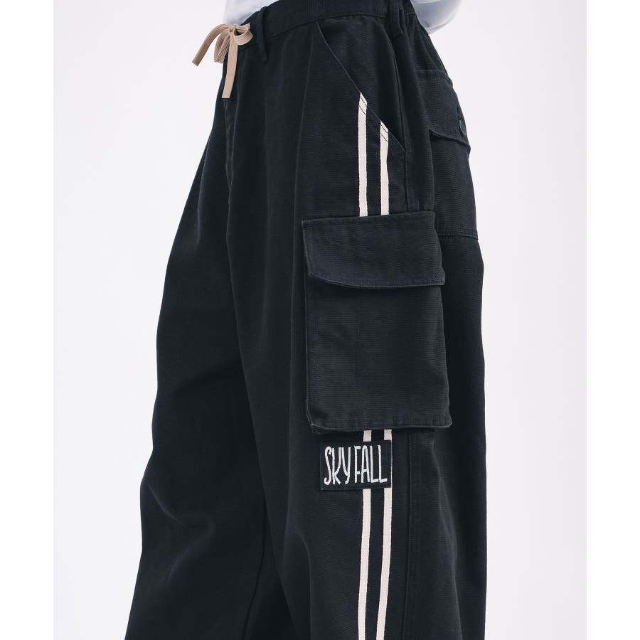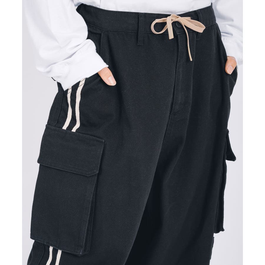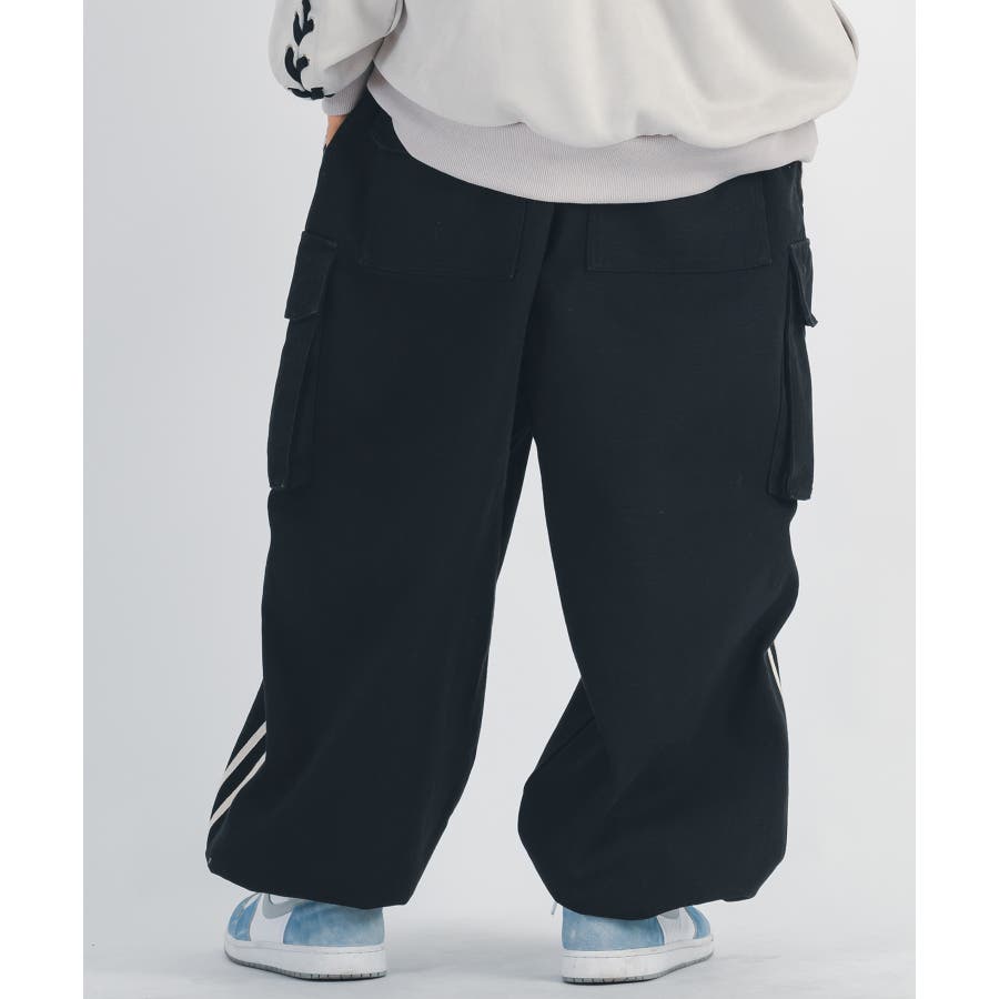 太腿から膝にかけて緩く、裾を絞った提灯型のシルエットはよりワイド感がクールなデザイン。カーゴポケットを配置しワーク感も演出しつつ、サイドはテープによる2本ラインがアクセント。ウエストシャーリングと裾にもドローコードを備えたイージー仕様で女性でも履ける。