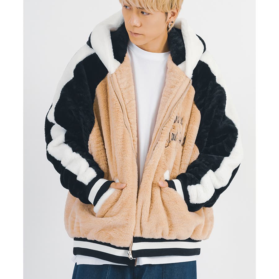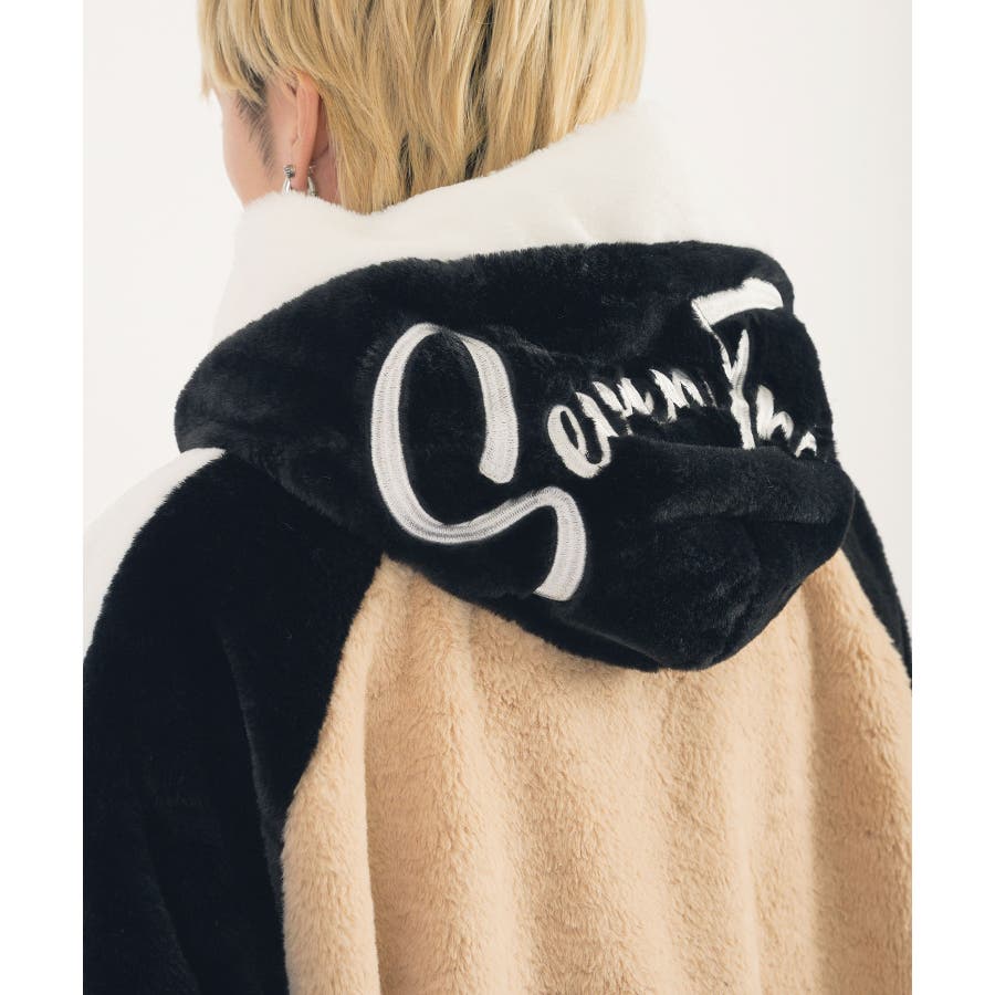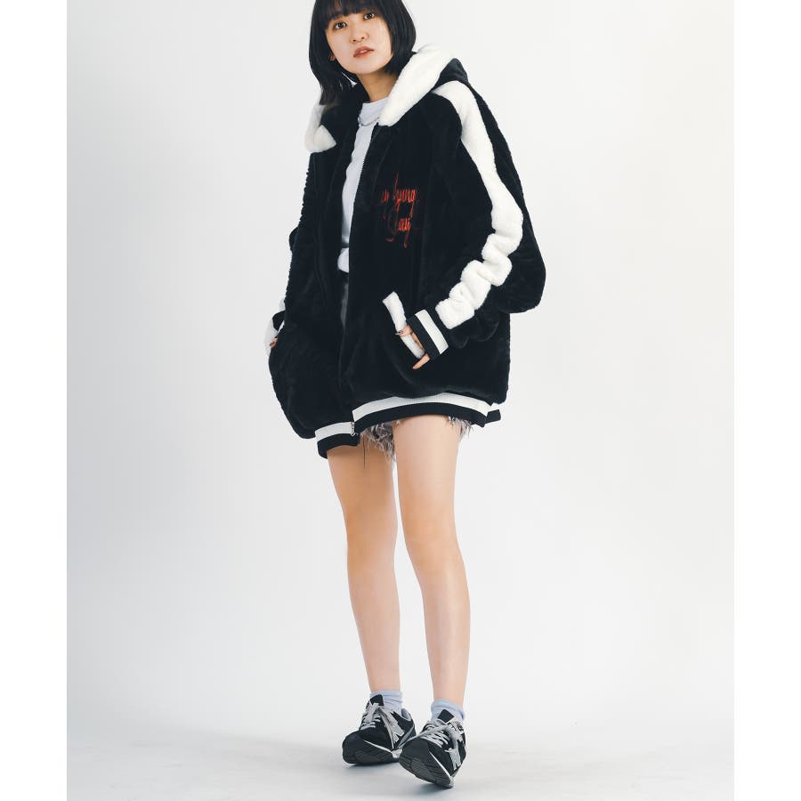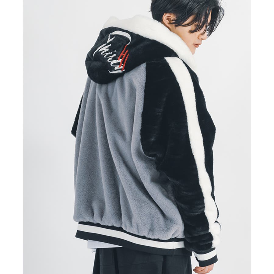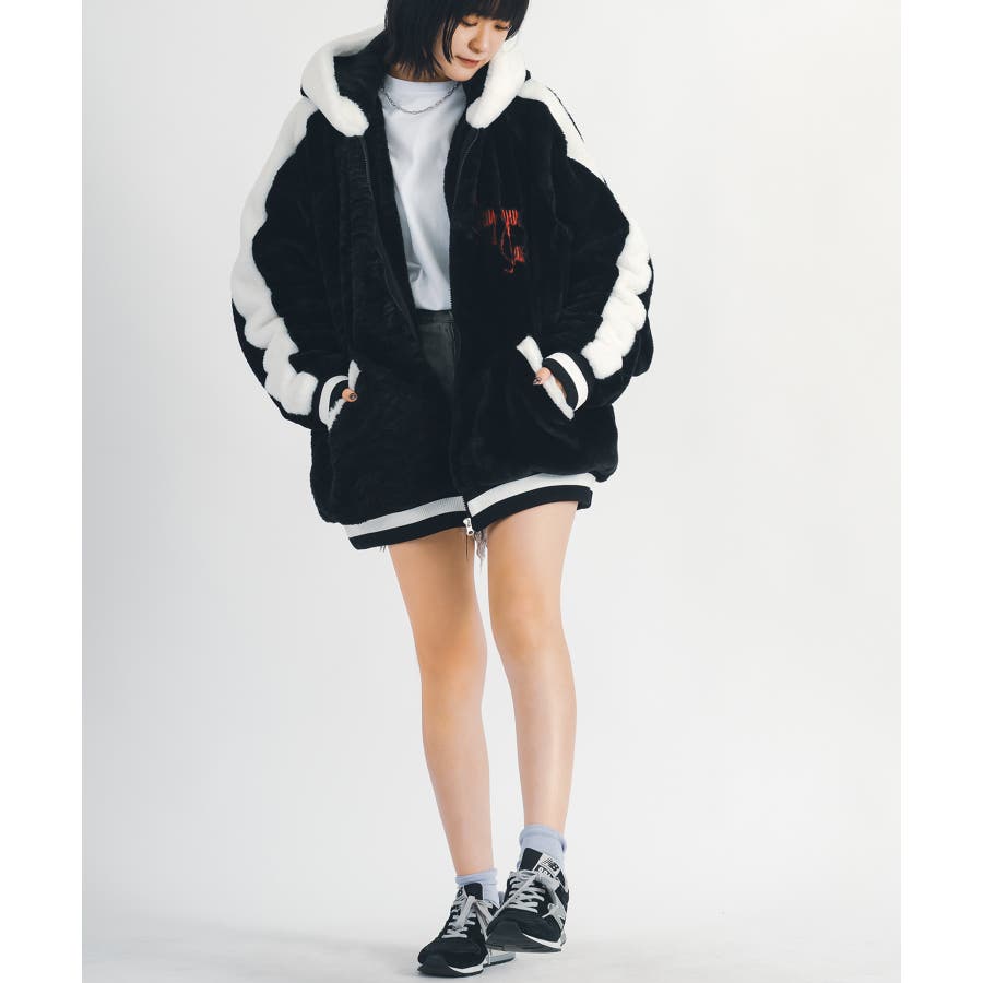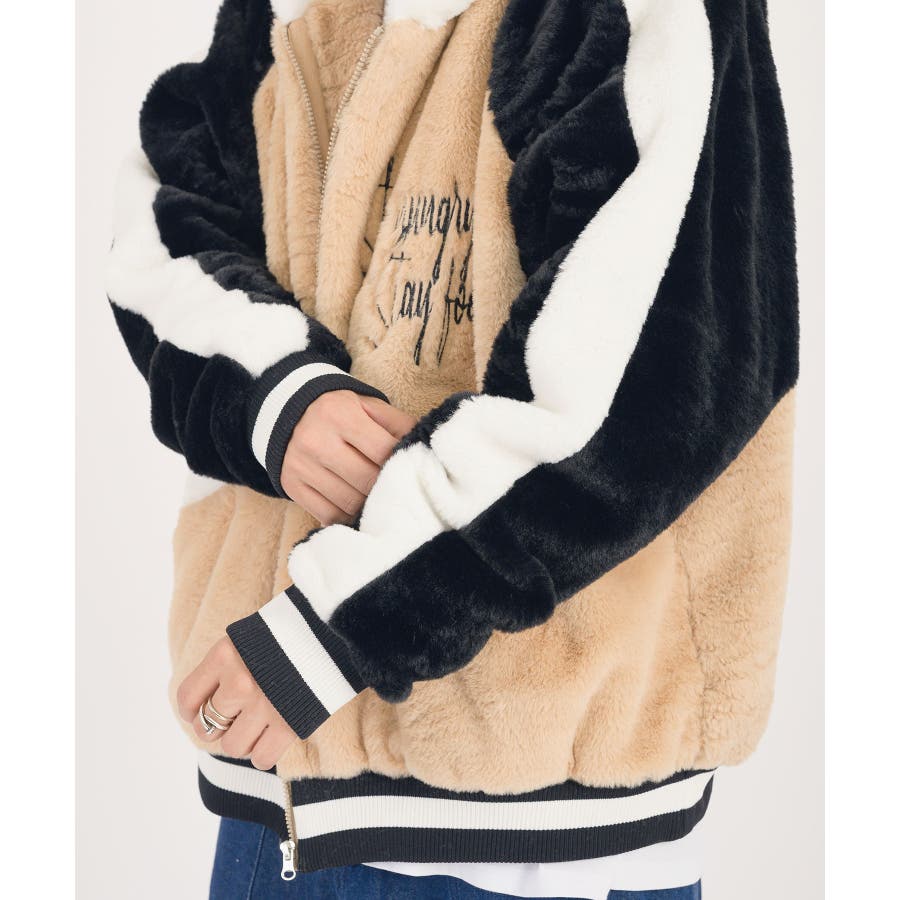 袖を配色切替したフード付きのオーバーサイズに着られるファーブルゾン。