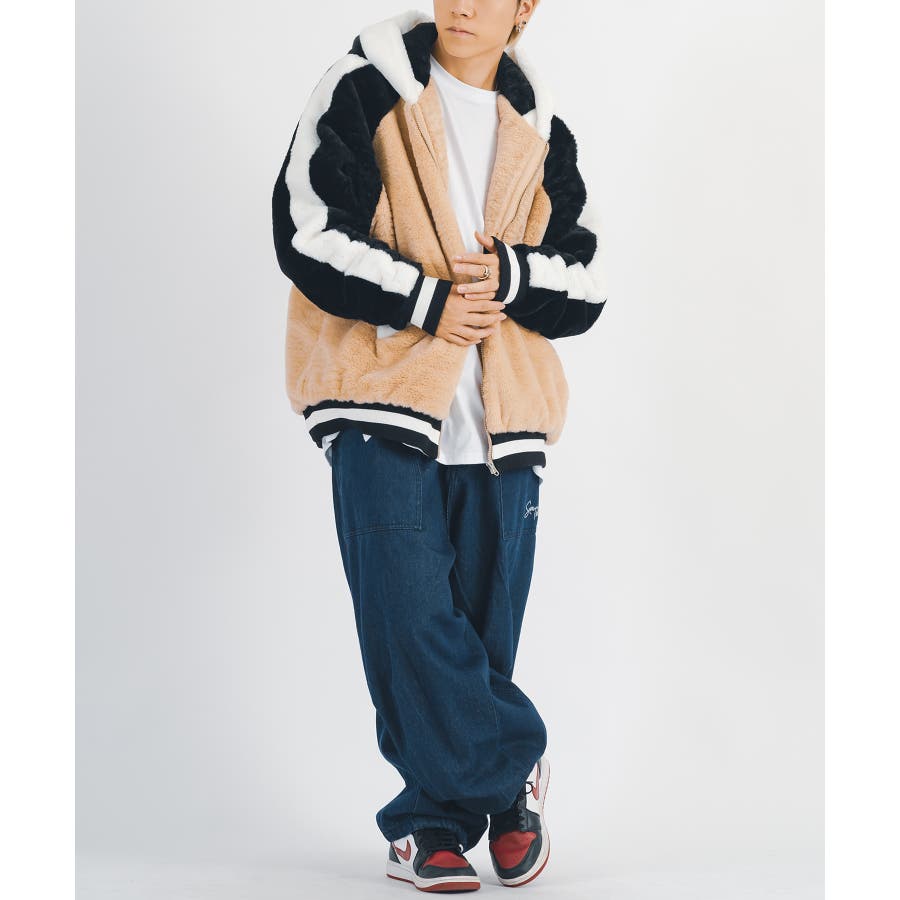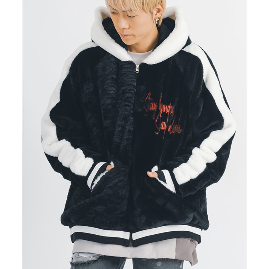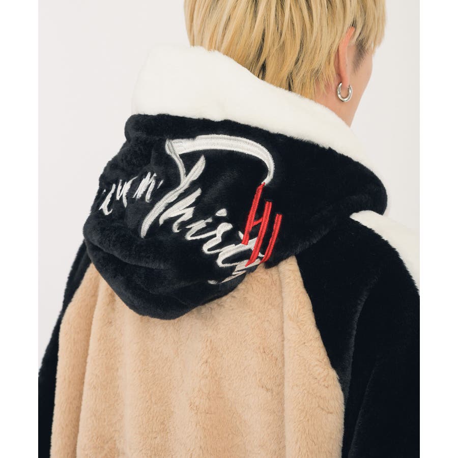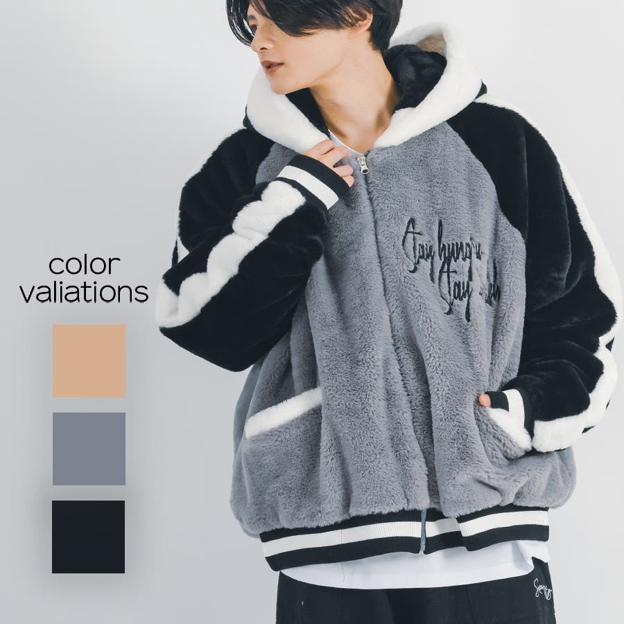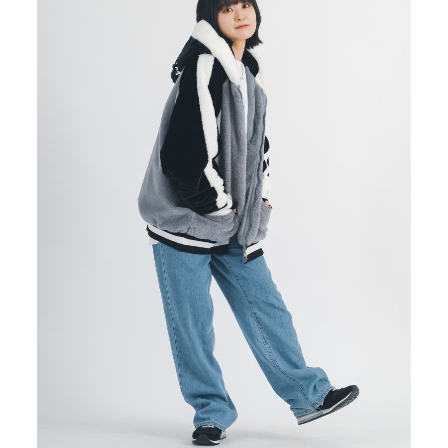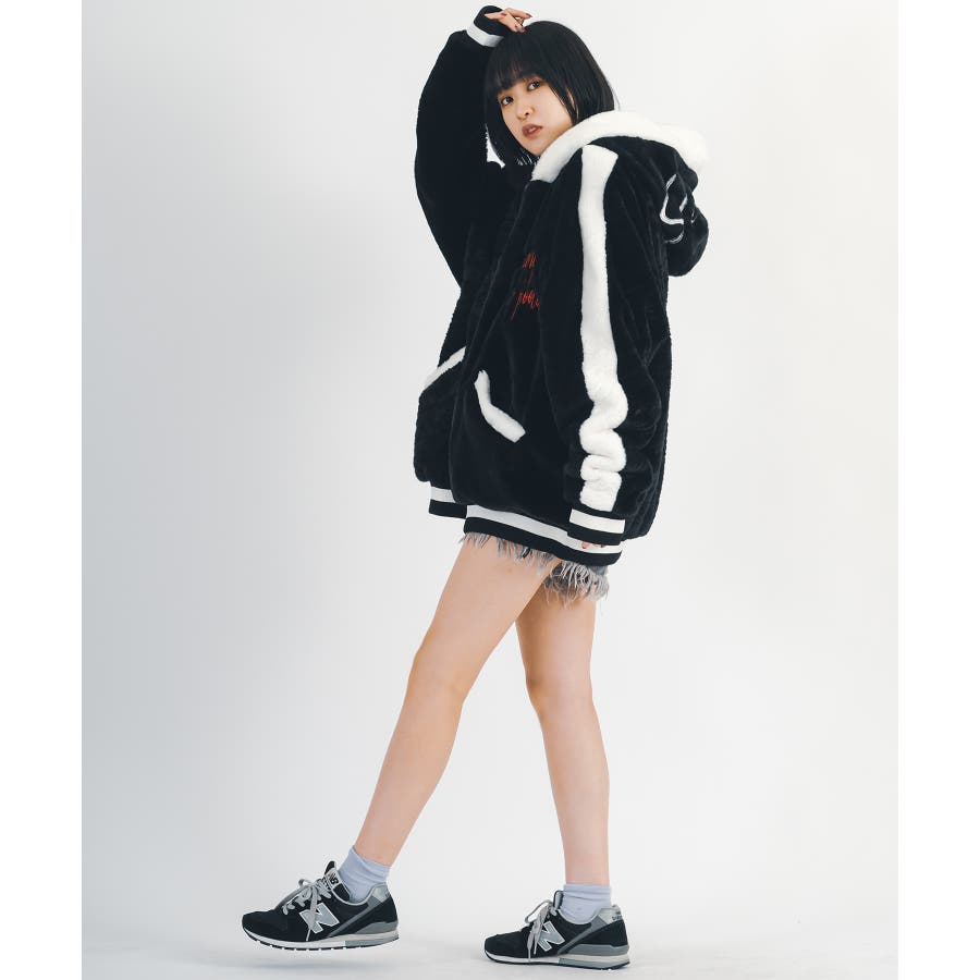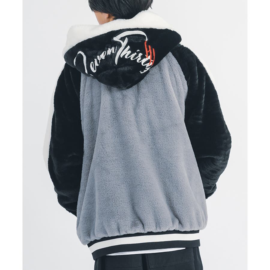 袖を配色切替したフード付きのオーバーサイズに着られるファーブルゾン。
