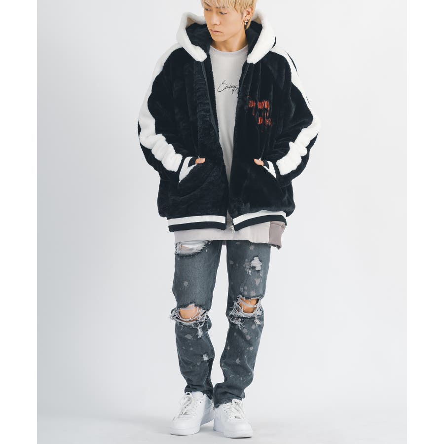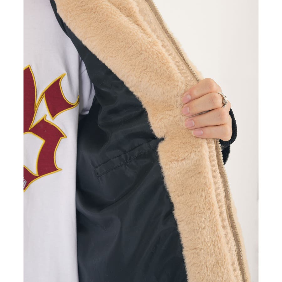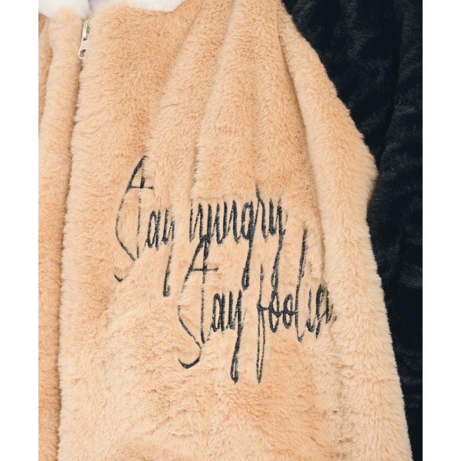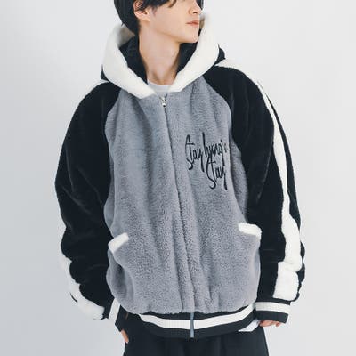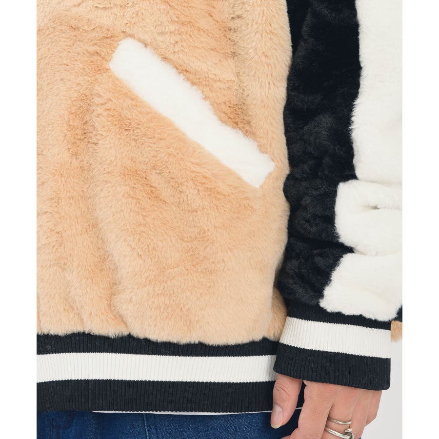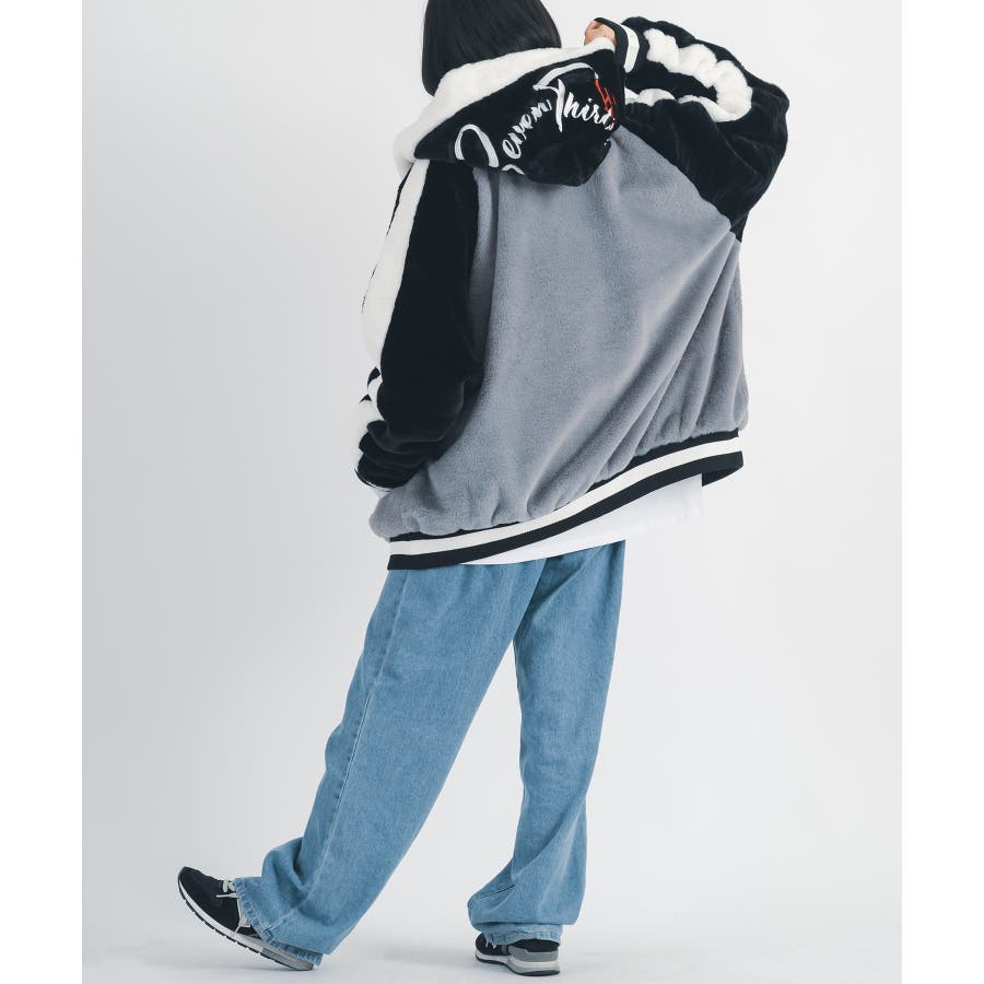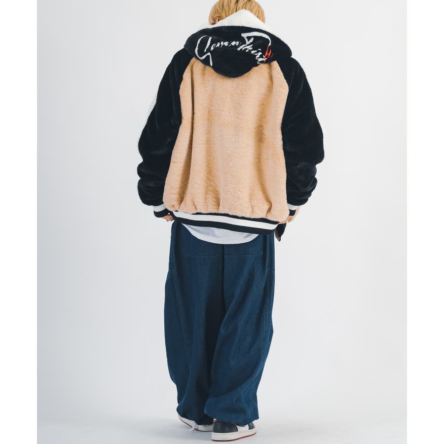 袖を配色切替したフード付きのオーバーサイズに着られるファーブルゾン。