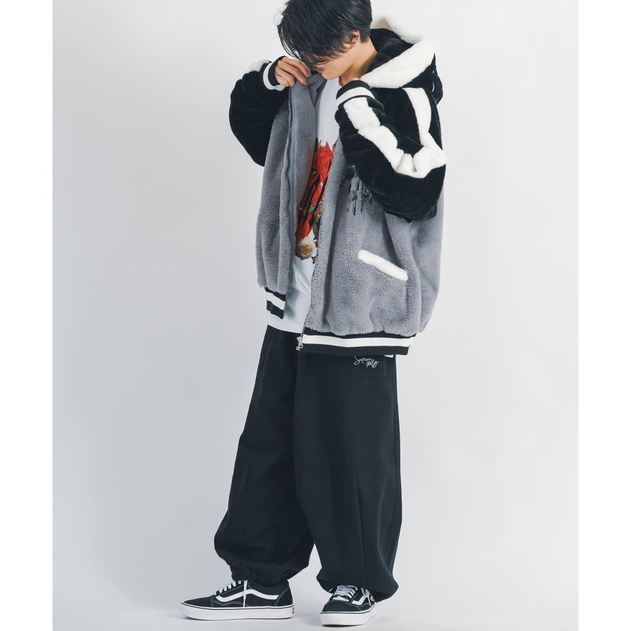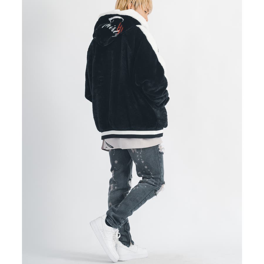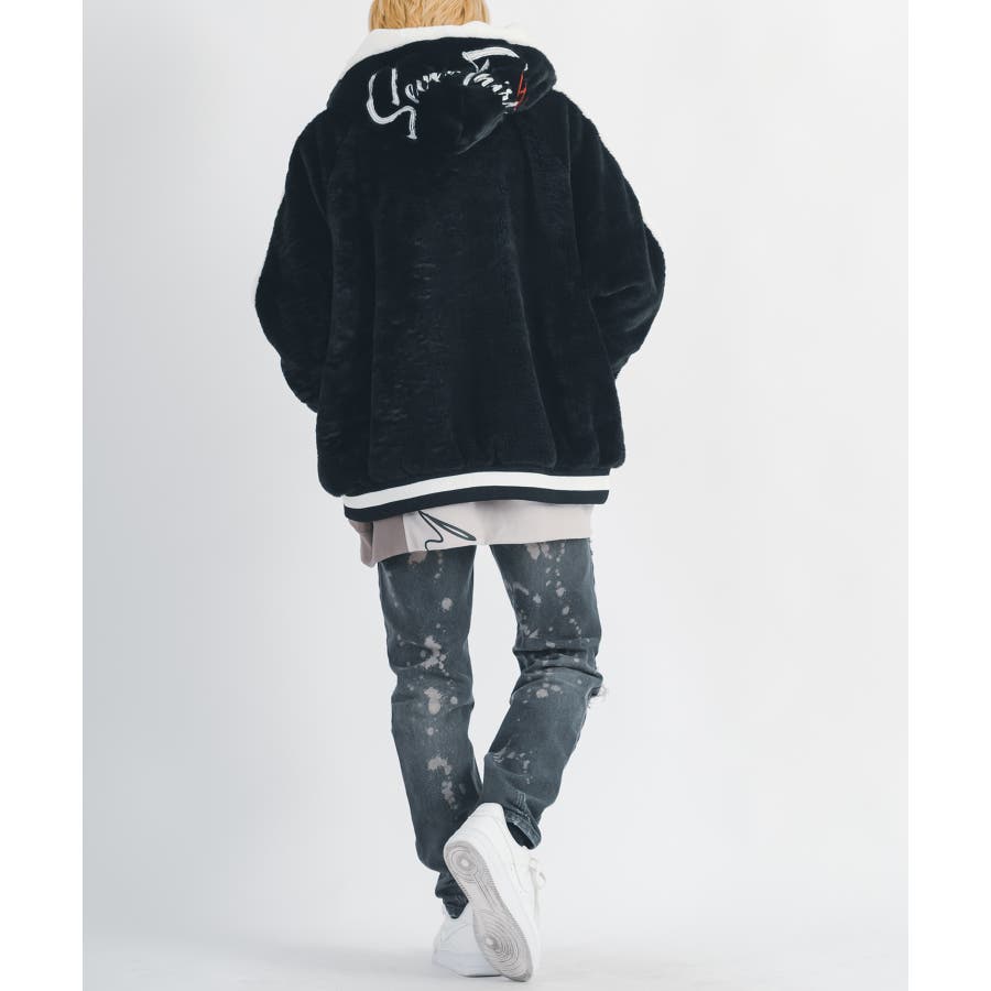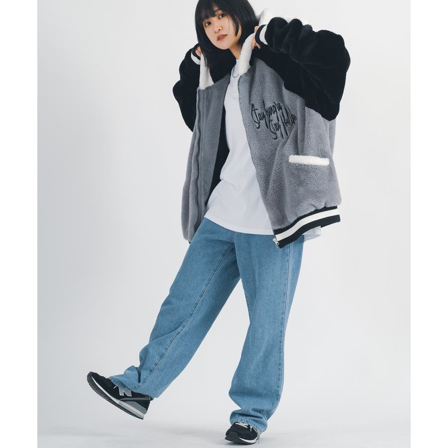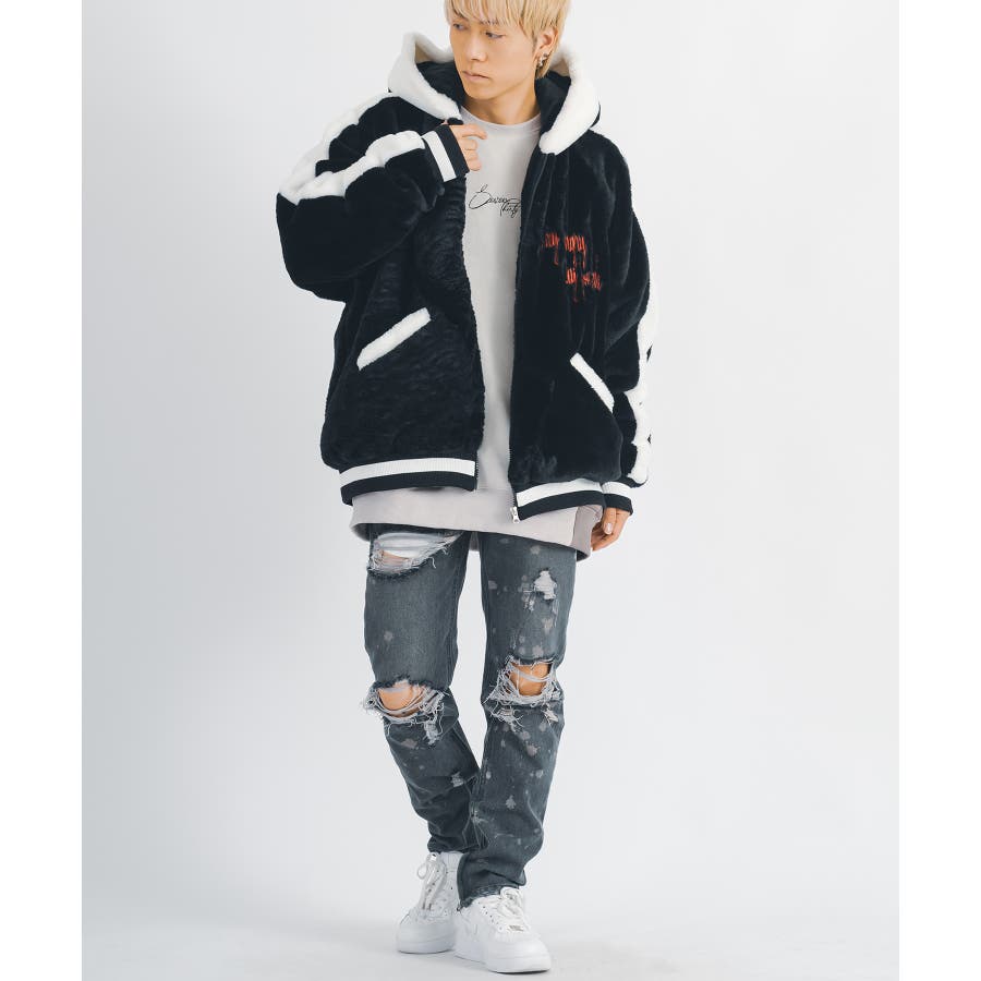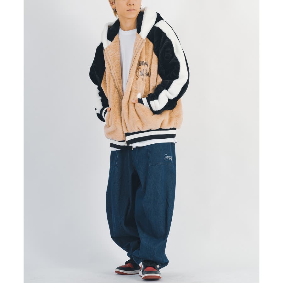 袖を配色切替したフード付きのオーバーサイズに着られるファーブルゾン。