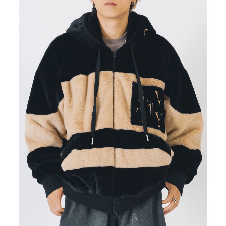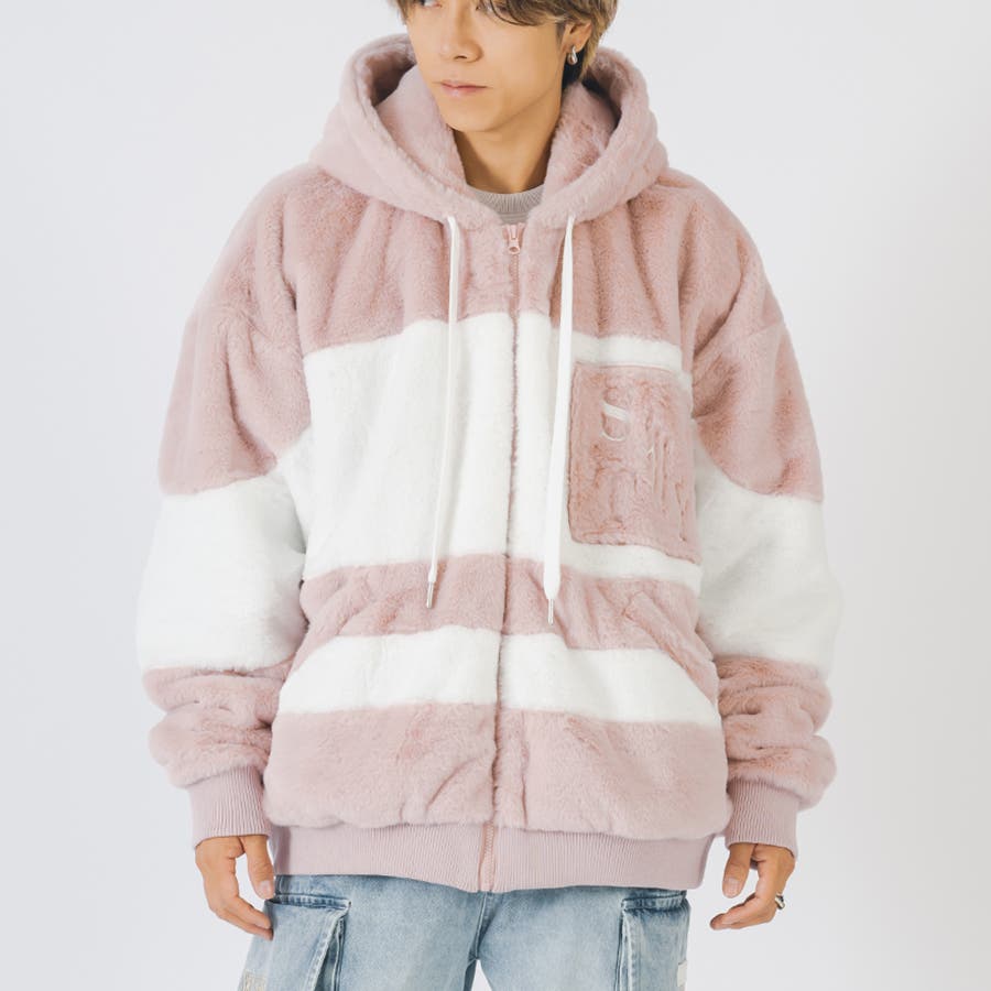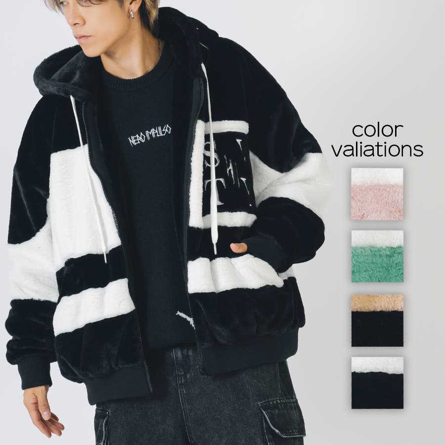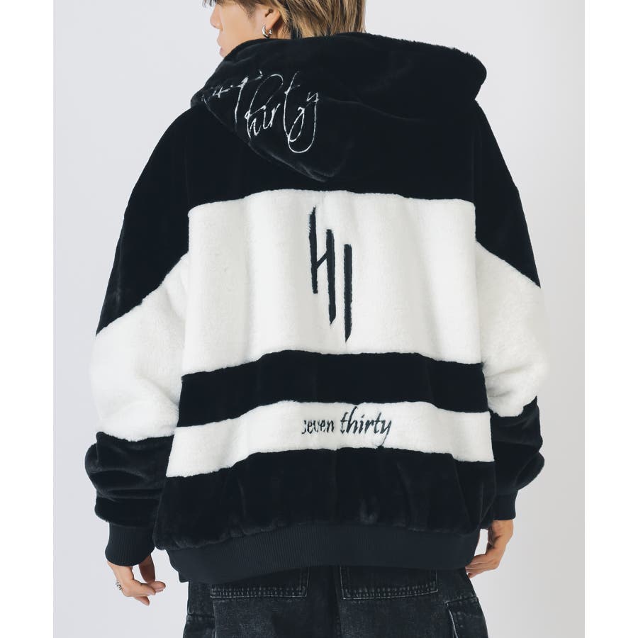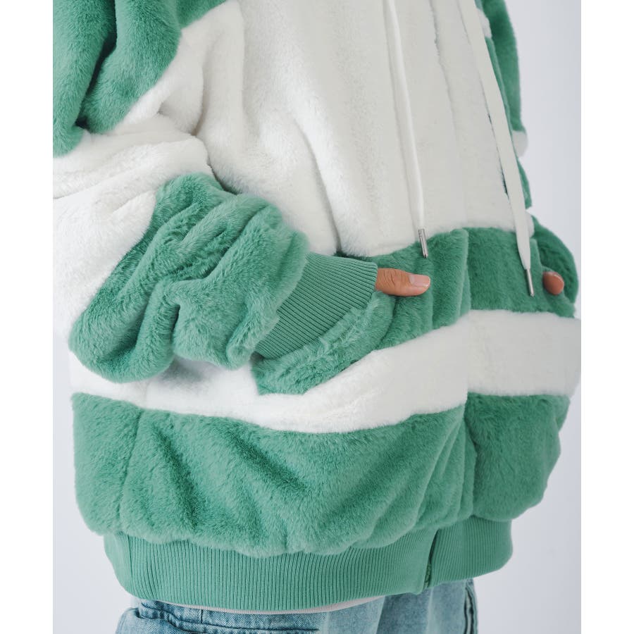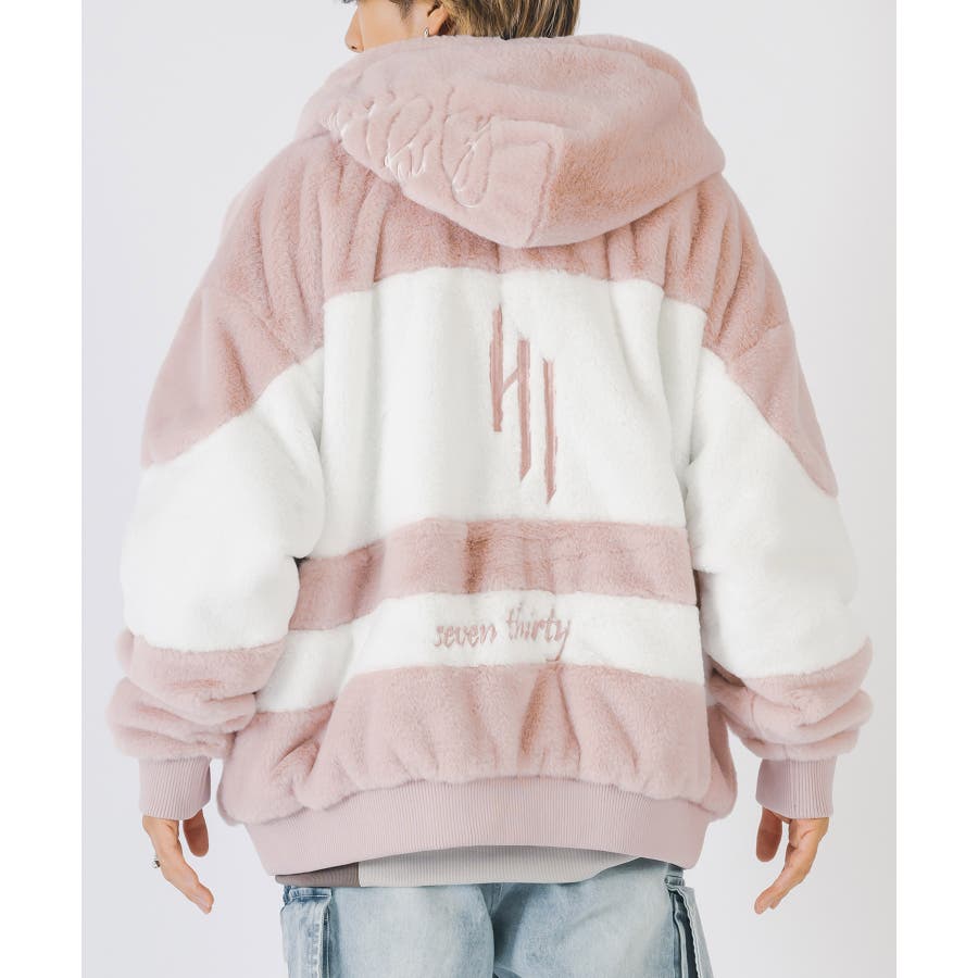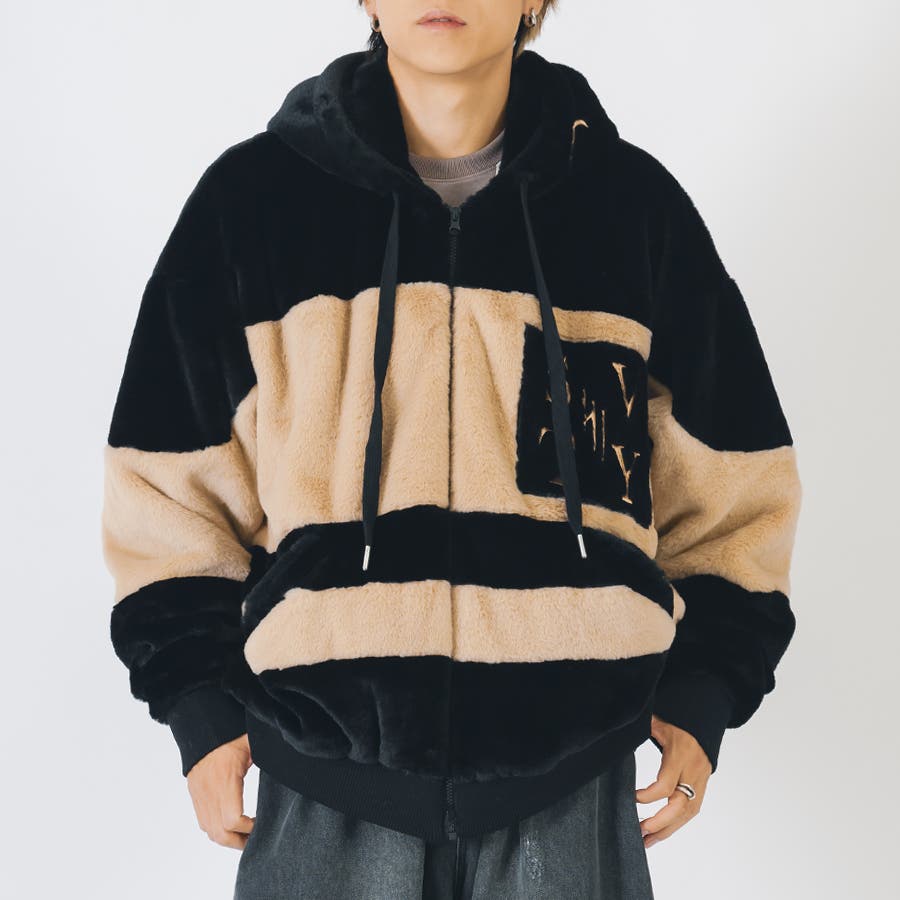 ランダムなボーダー状に切り替えたフード付きのオーバーサイズに着られるファーブルゾン。