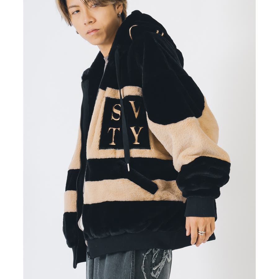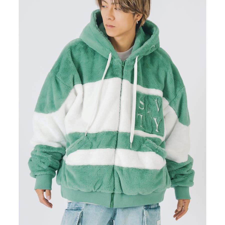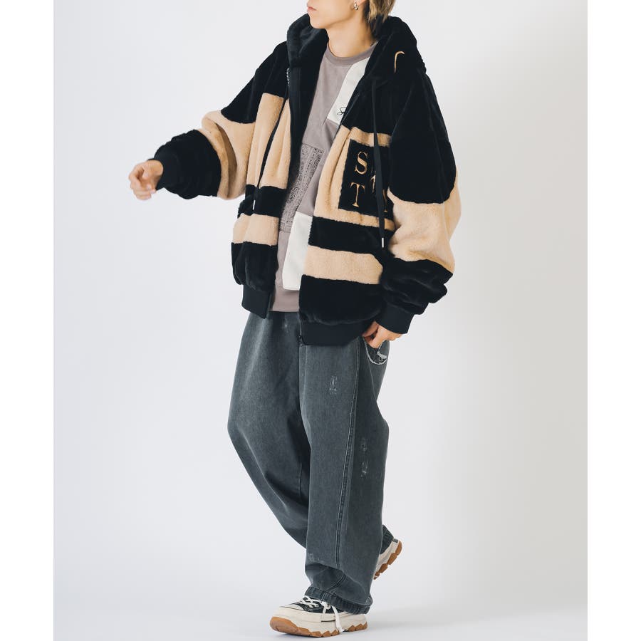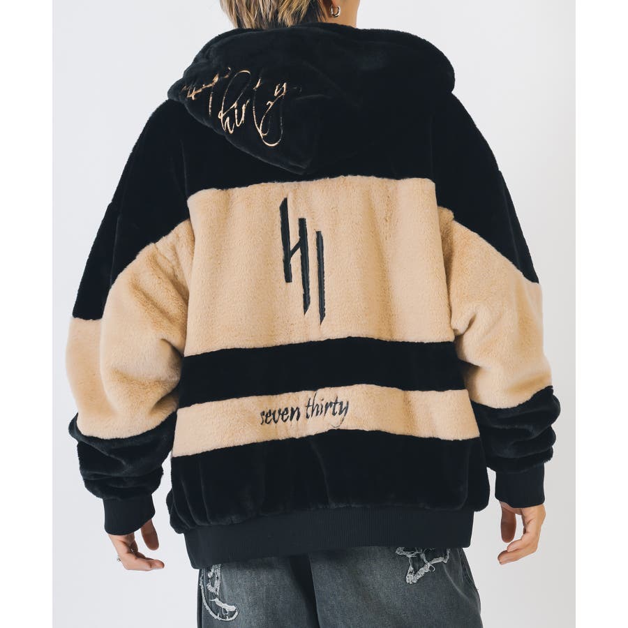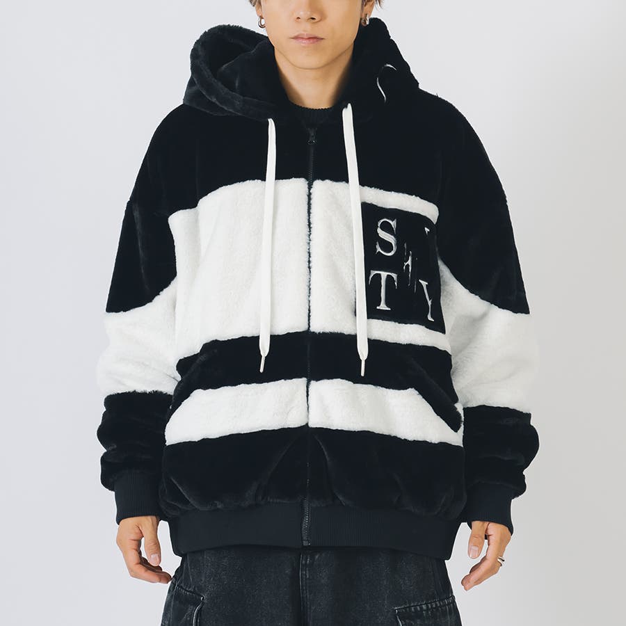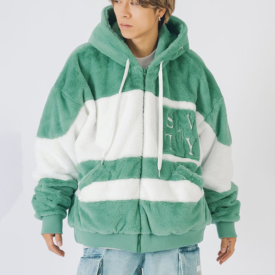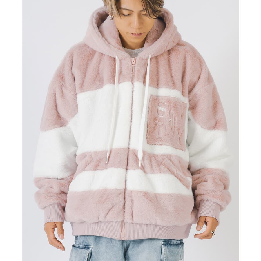 ランダムなボーダー状に切り替えたフード付きのオーバーサイズに着られるファーブルゾン。