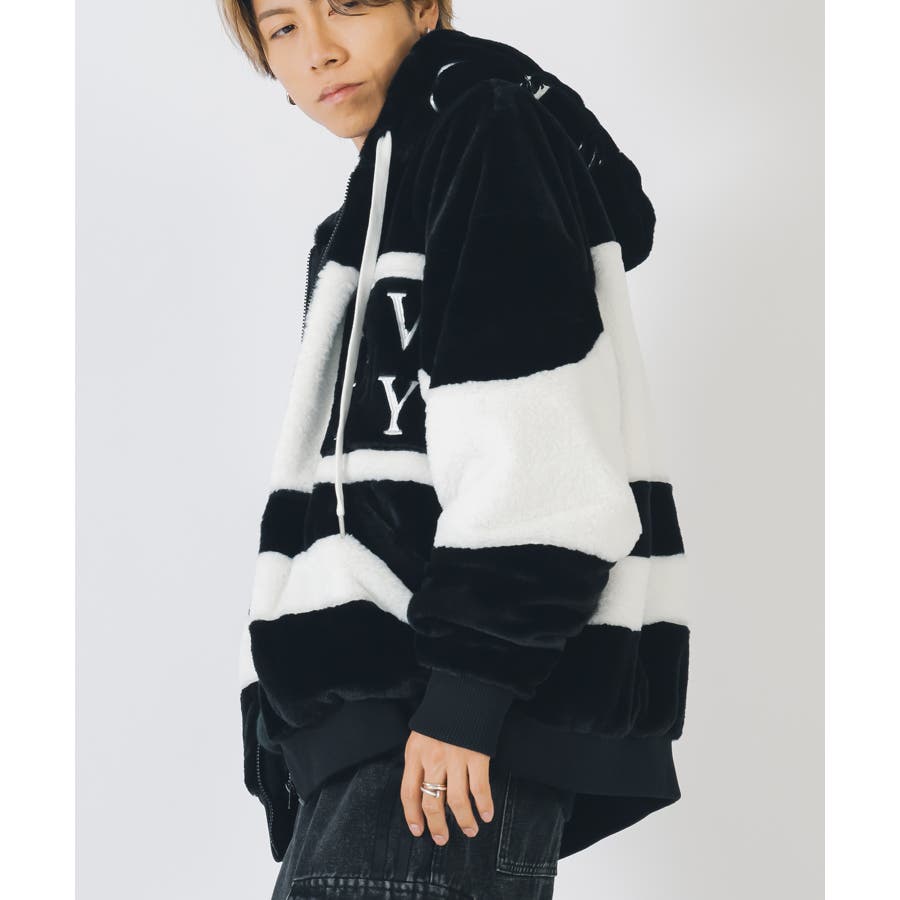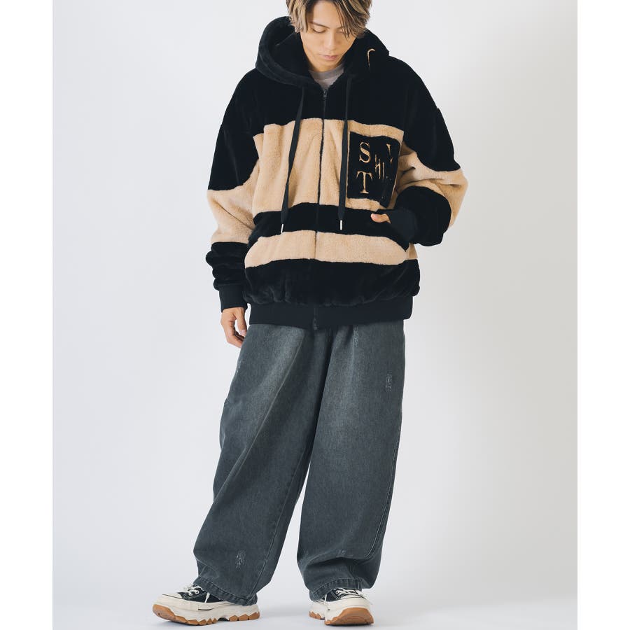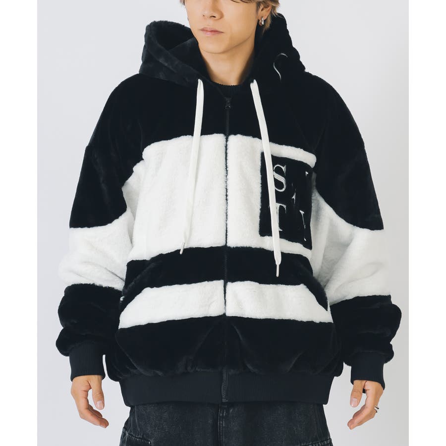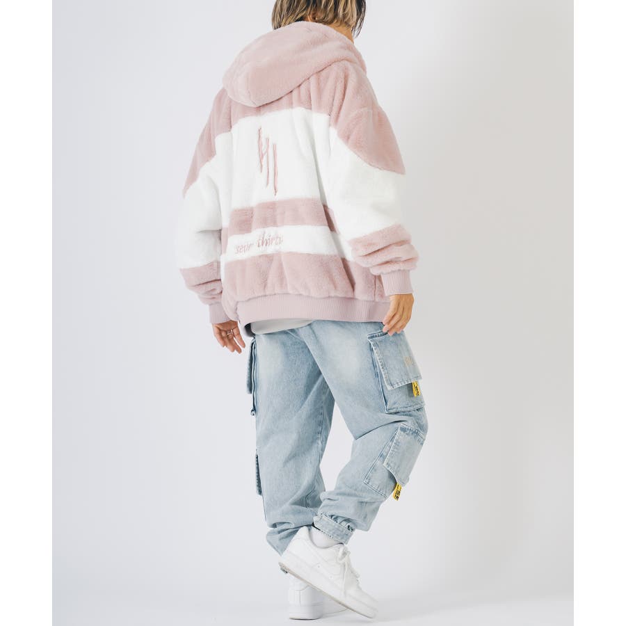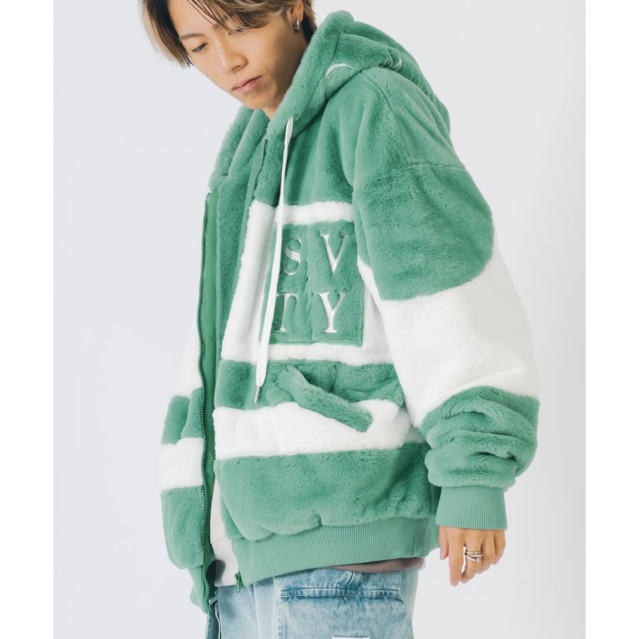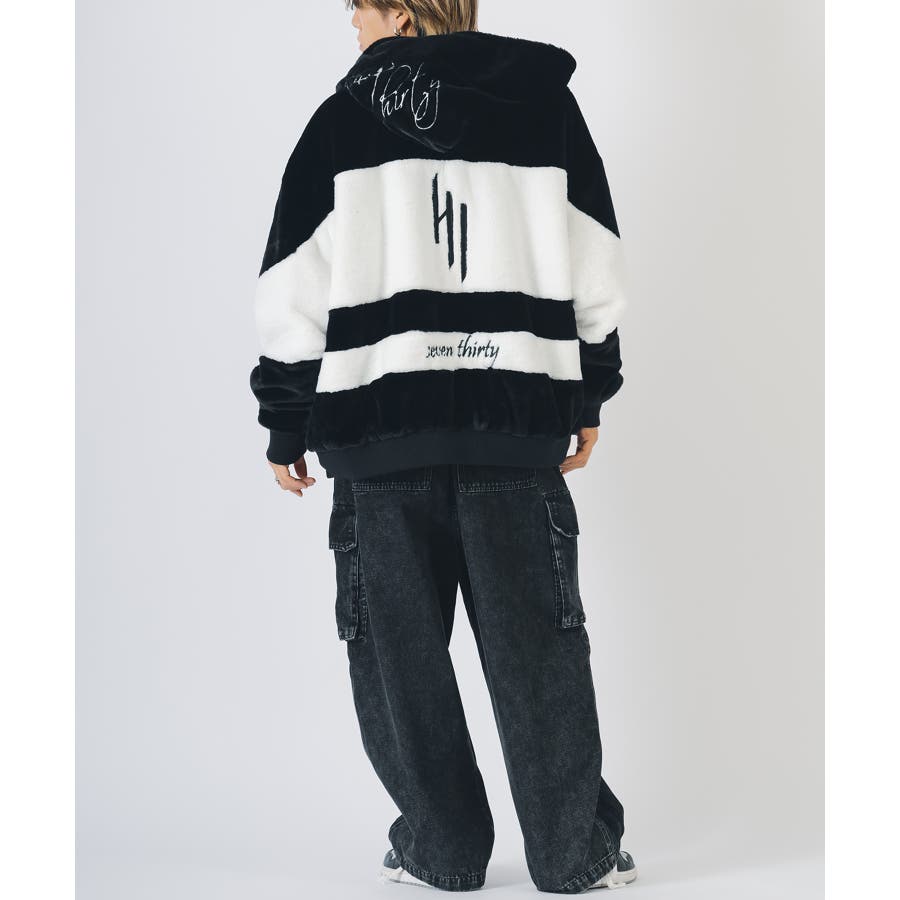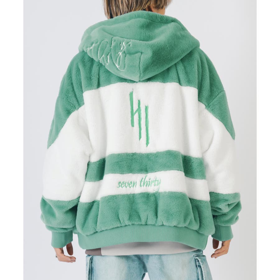 ランダムなボーダー状に切り替えたフード付きのオーバーサイズに着られるファーブルゾン。