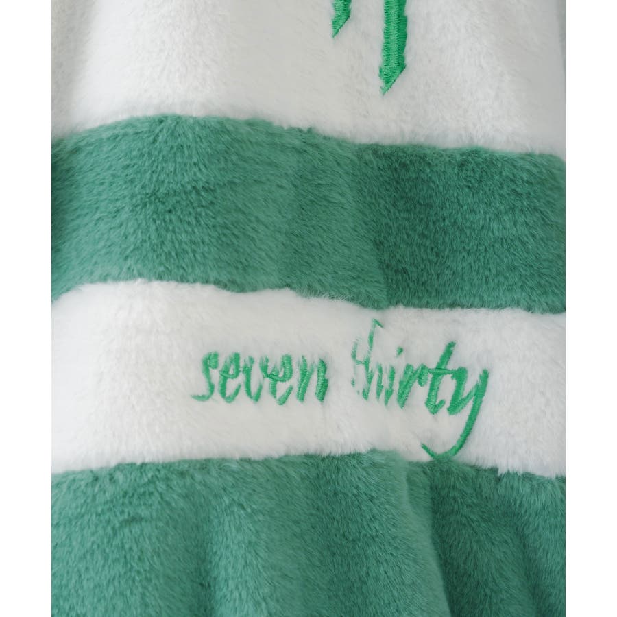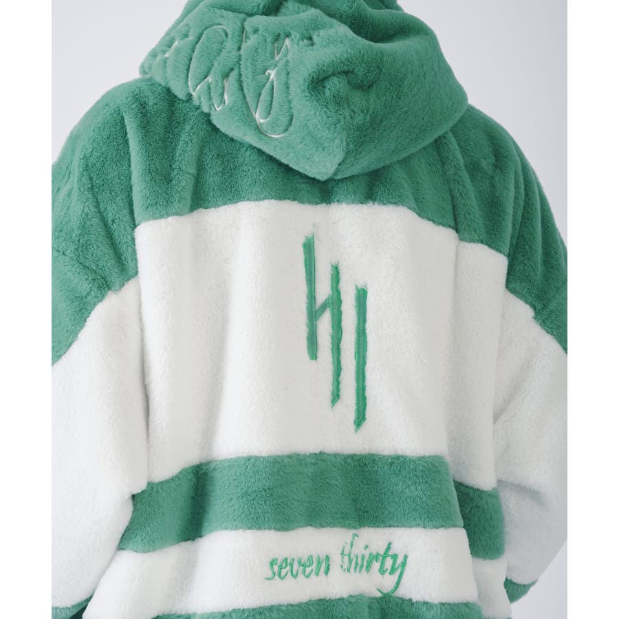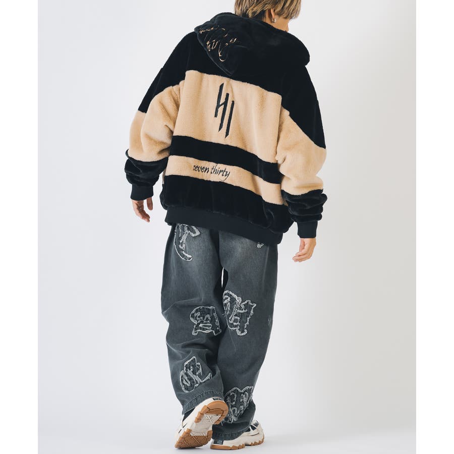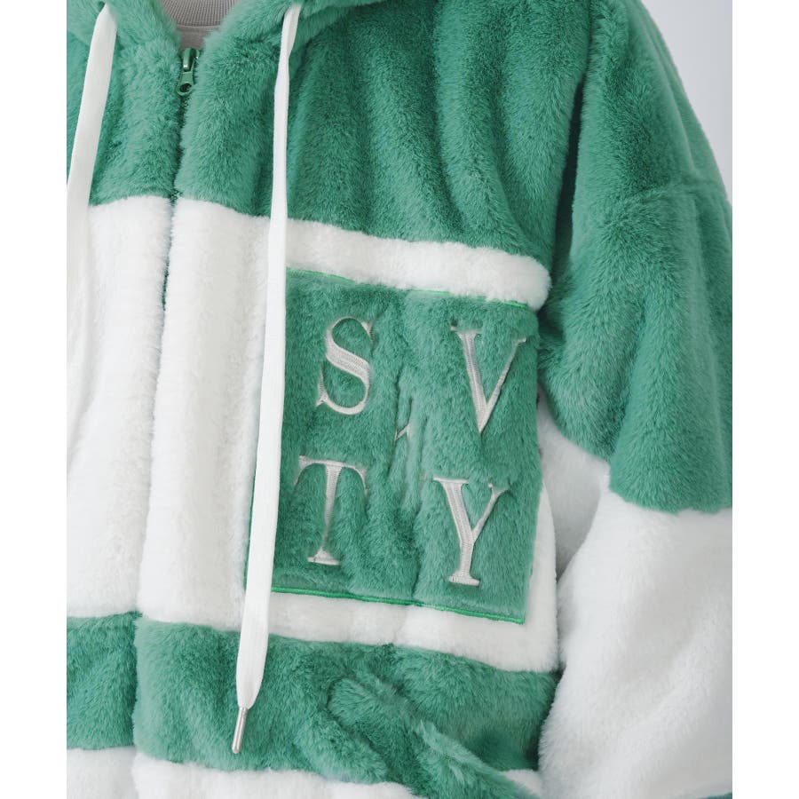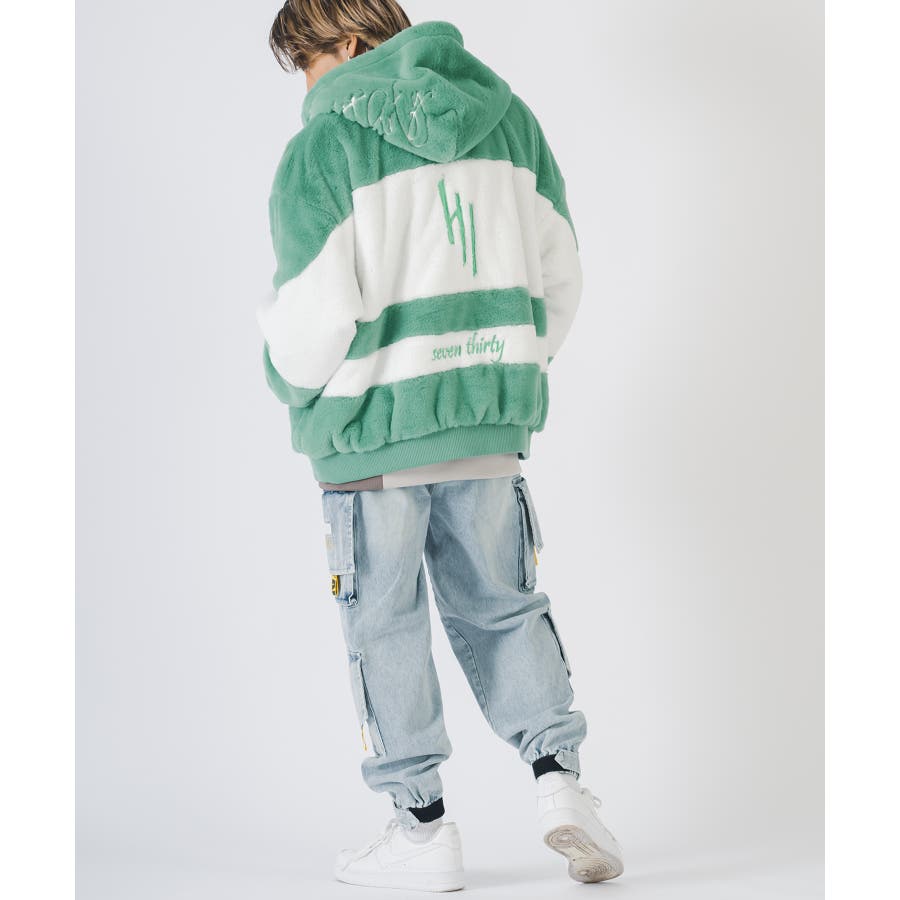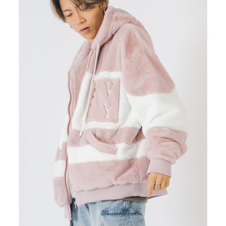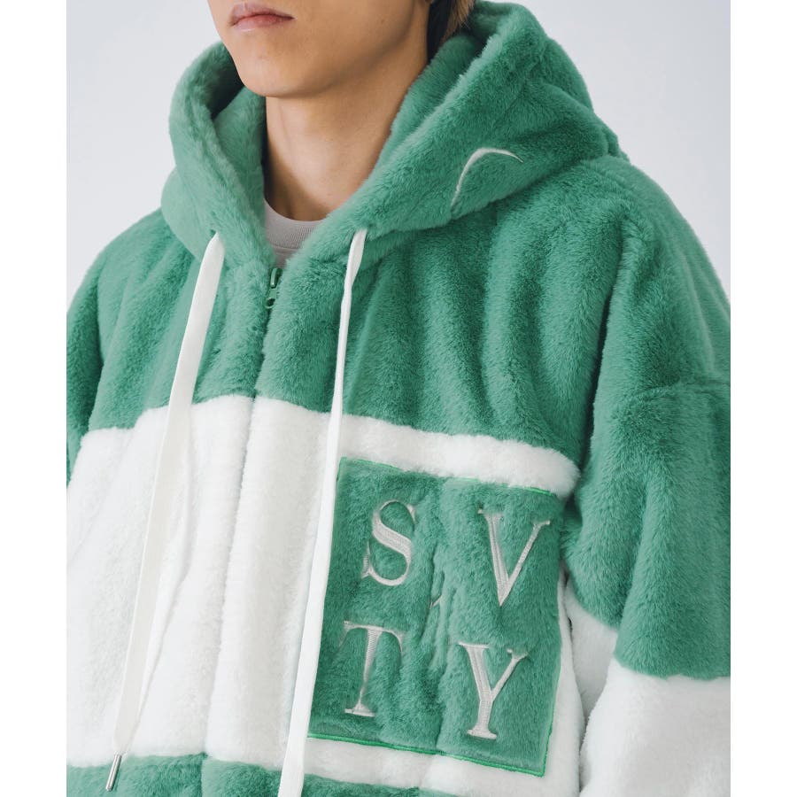 ランダムなボーダー状に切り替えたフード付きのオーバーサイズに着られるファーブルゾン。