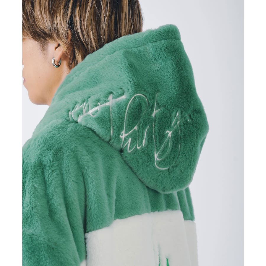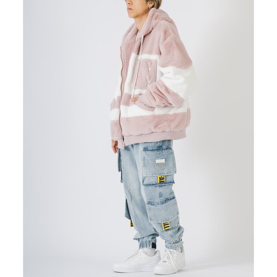 大胆な切り替えだけでなく、胸のワッペン状のデザインや、バックの爪の様なデザインもファー素材の切替で表現しており、カラーもPOPな配色でより印象的なアイテム。