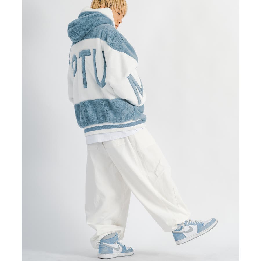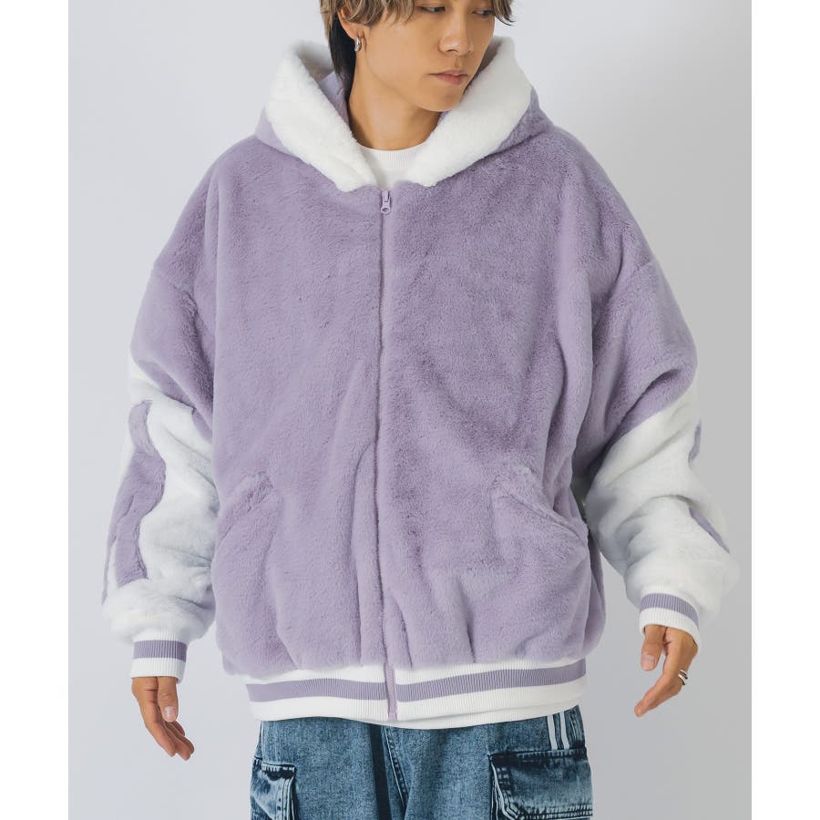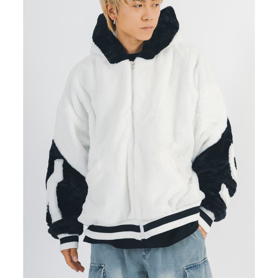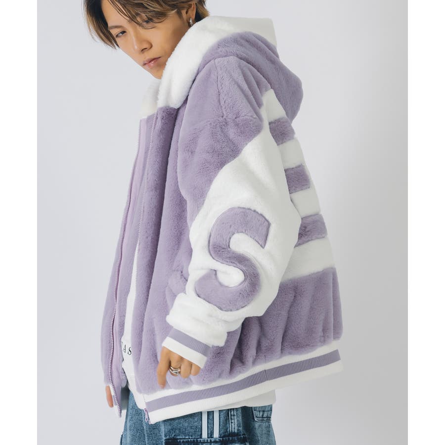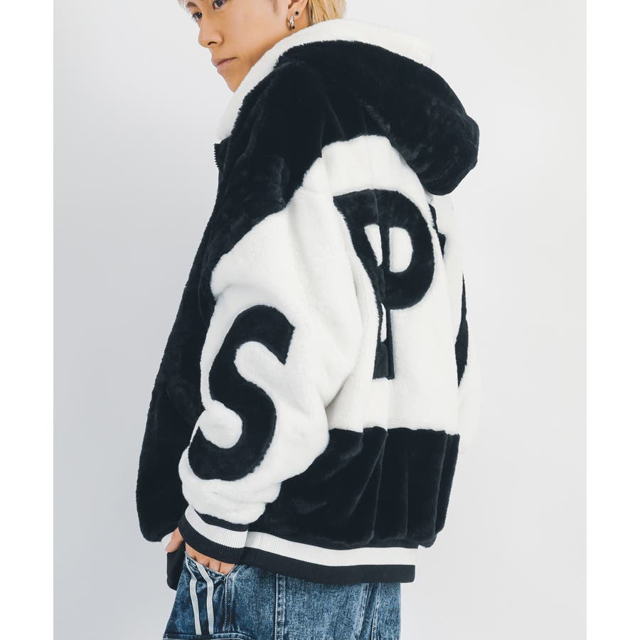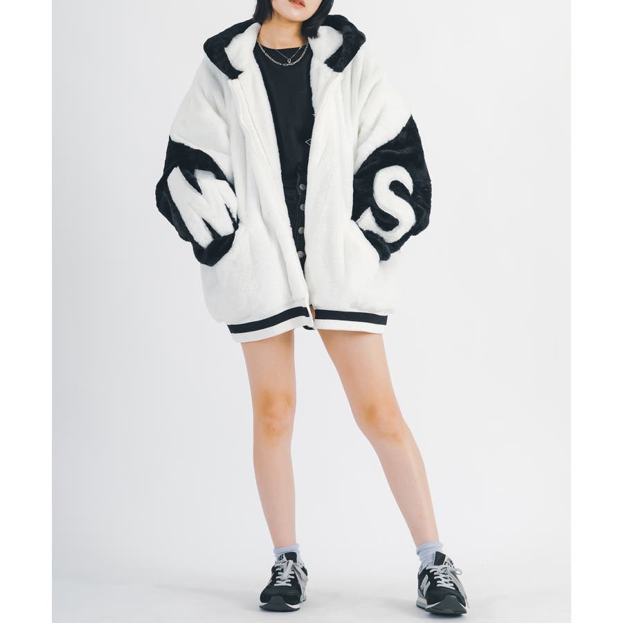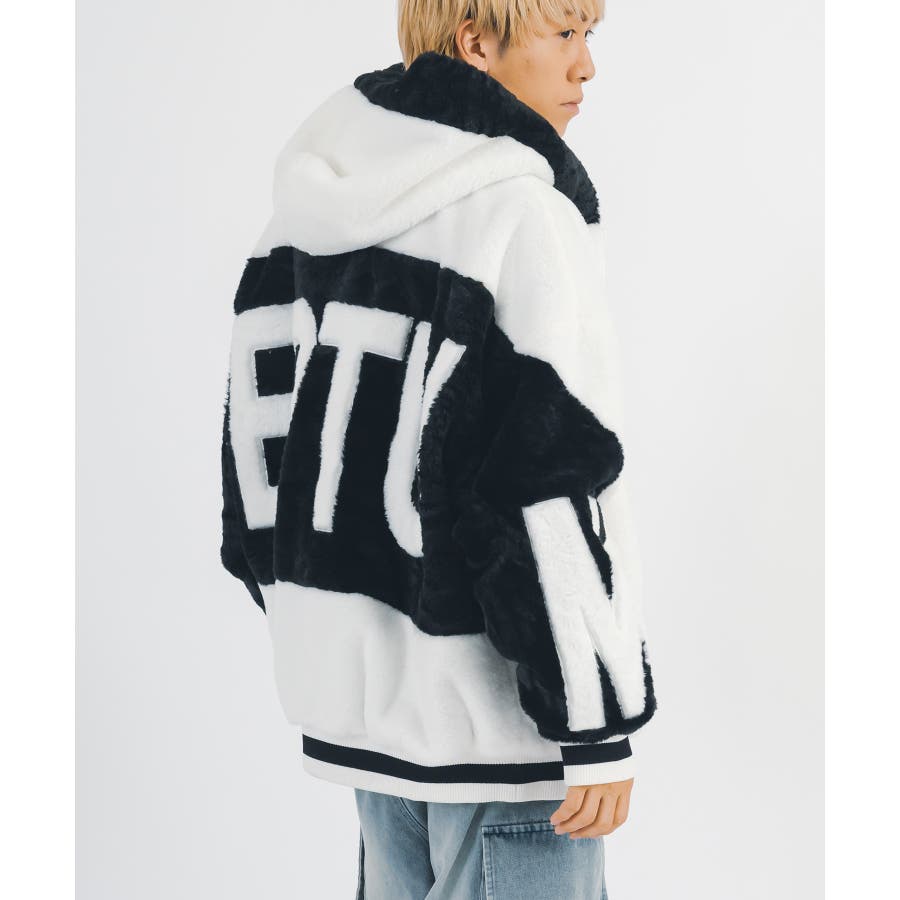 バックにビッグなロゴを配置したフード付きのオーバーサイズに着られるファーブルゾン。