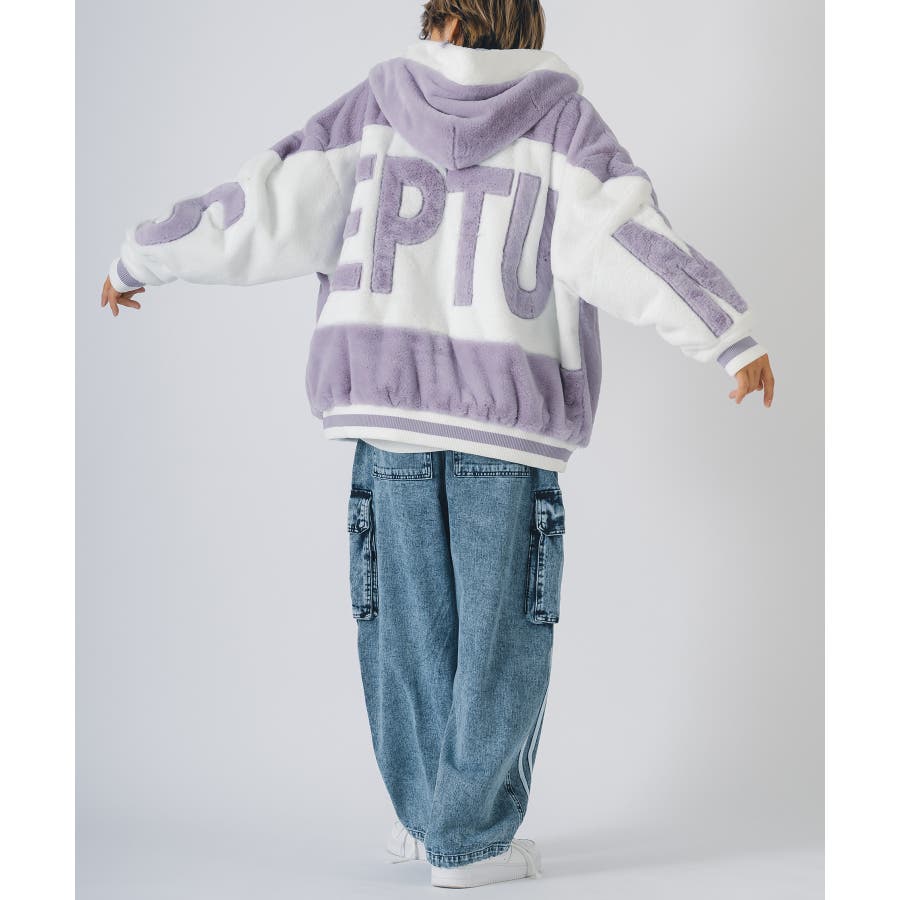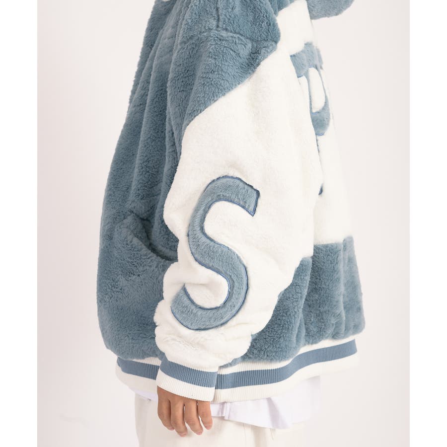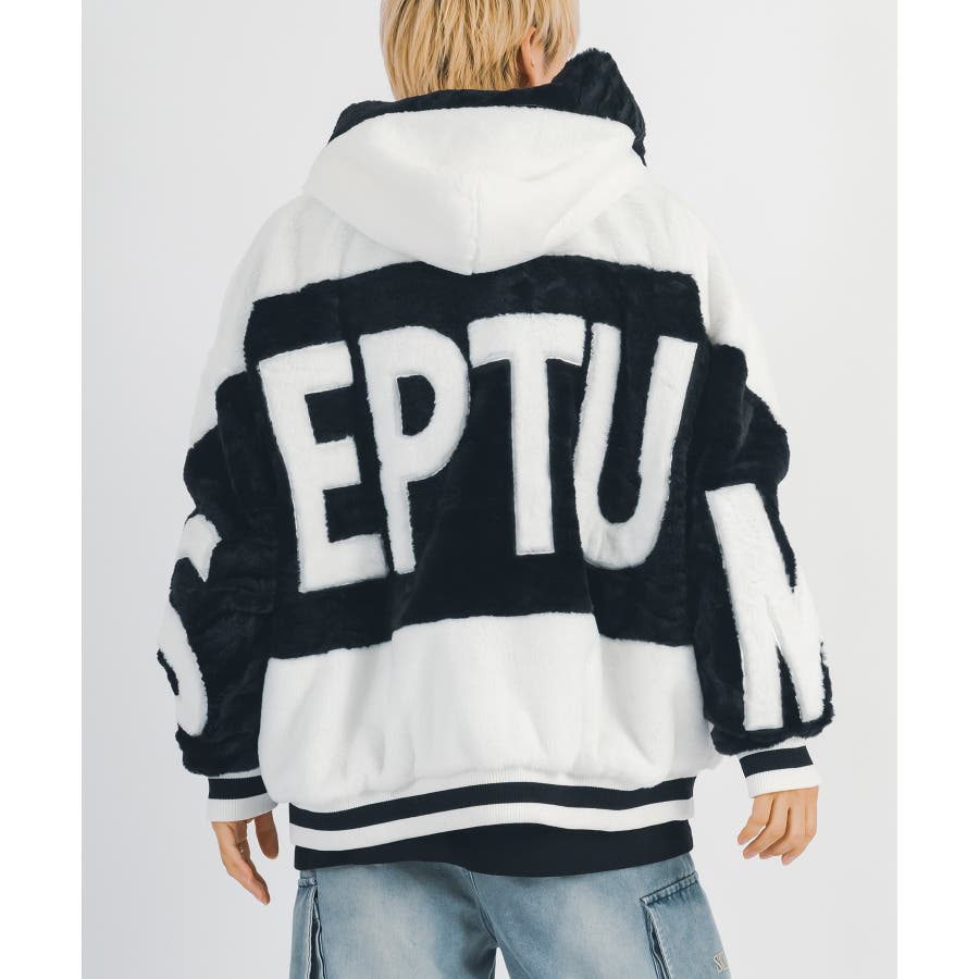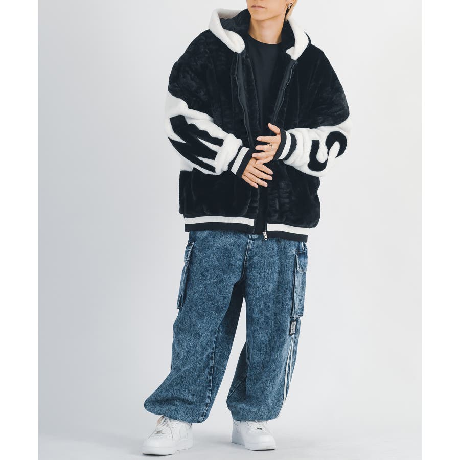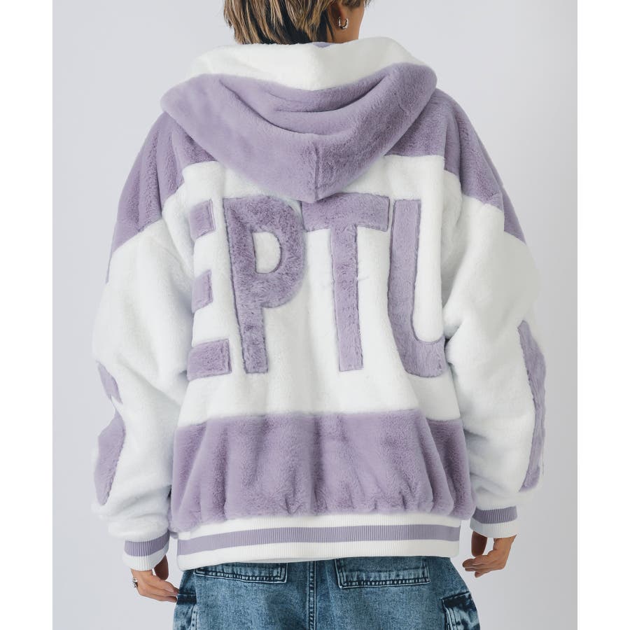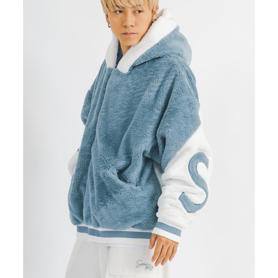 バックにビッグなロゴを配置したフード付きのオーバーサイズに着られるファーブルゾン。