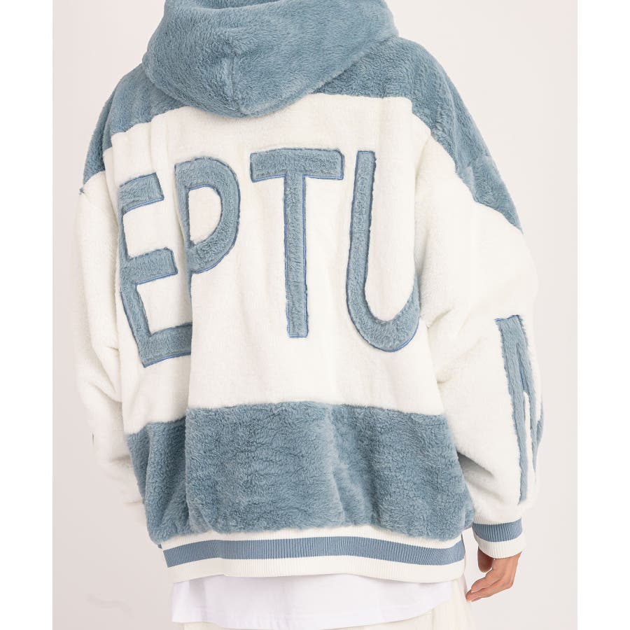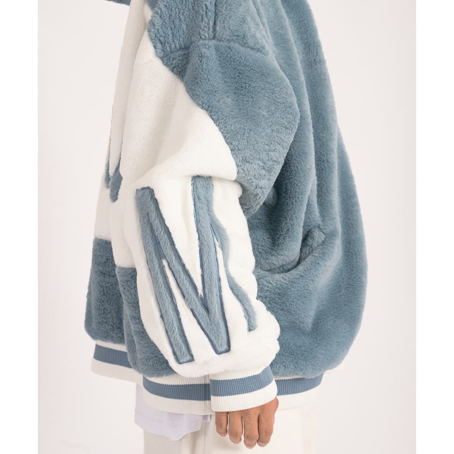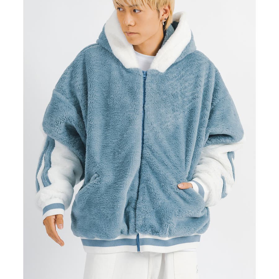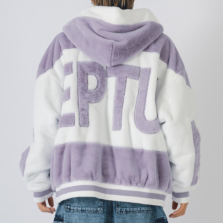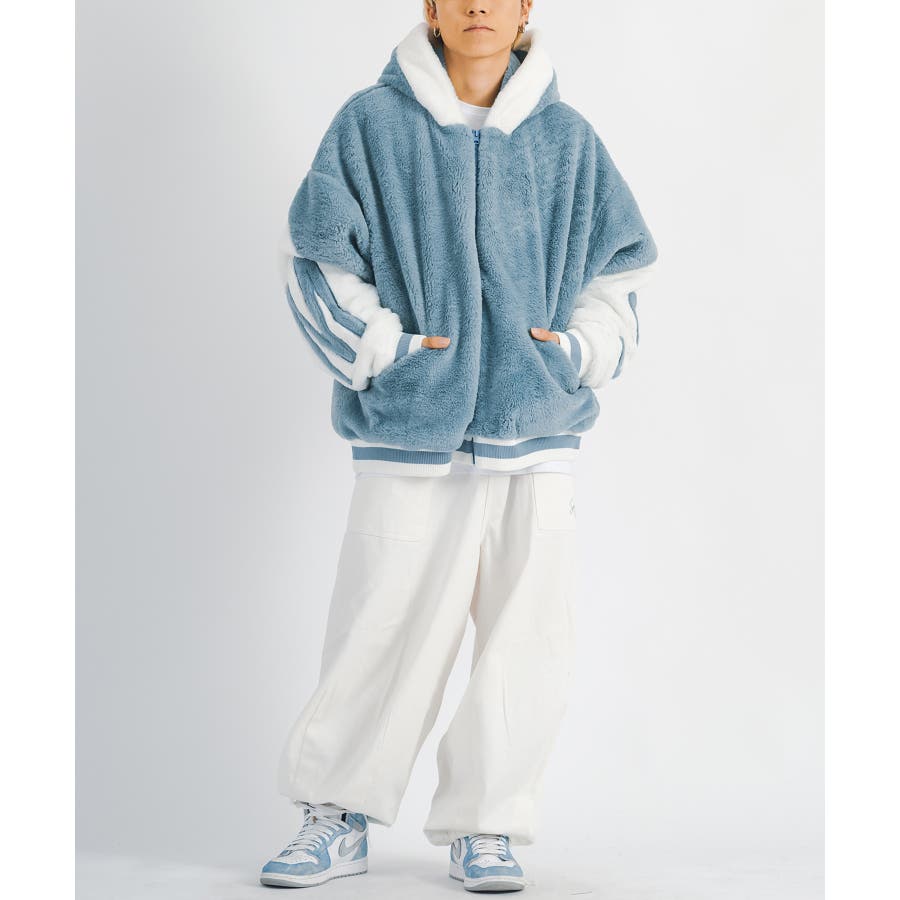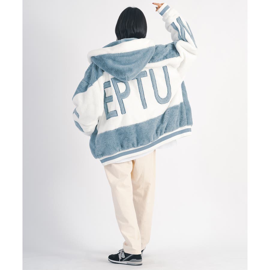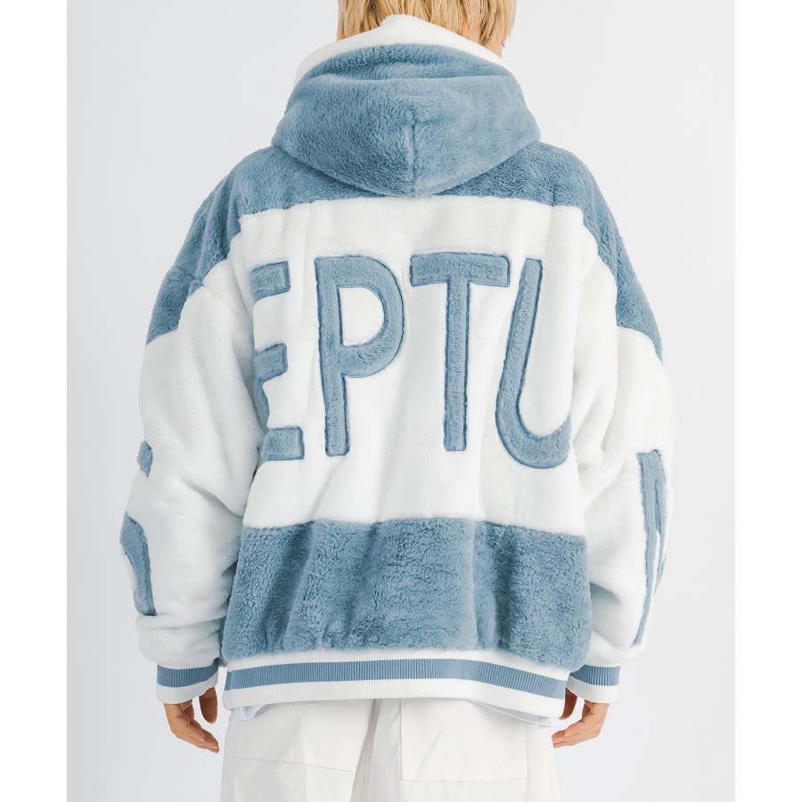 バックにビッグなロゴを配置したフード付きのオーバーサイズに着られるファーブルゾン。