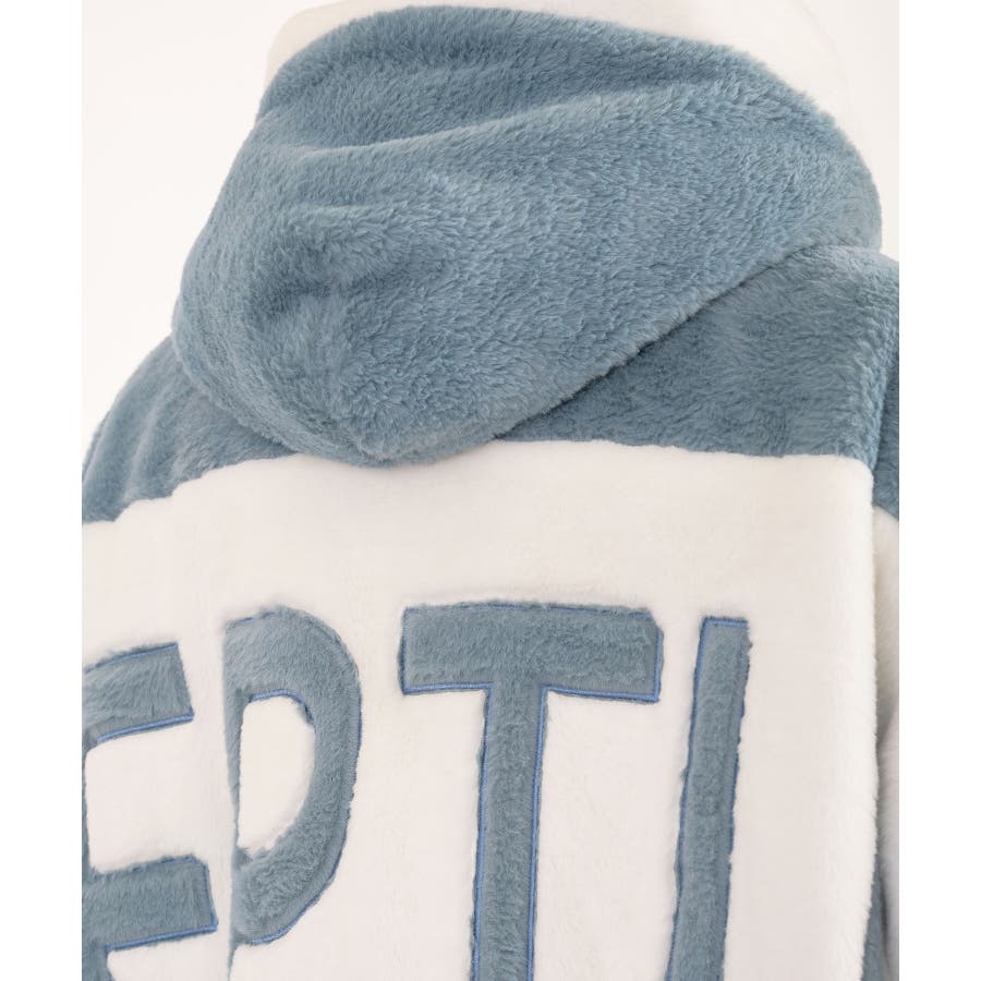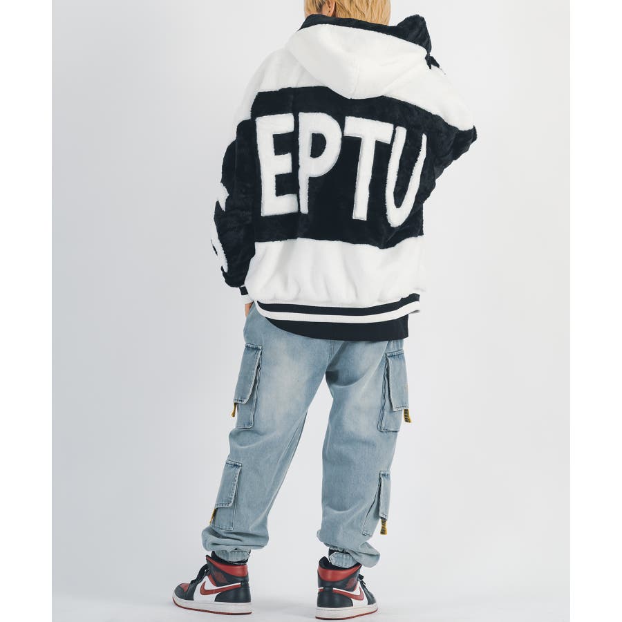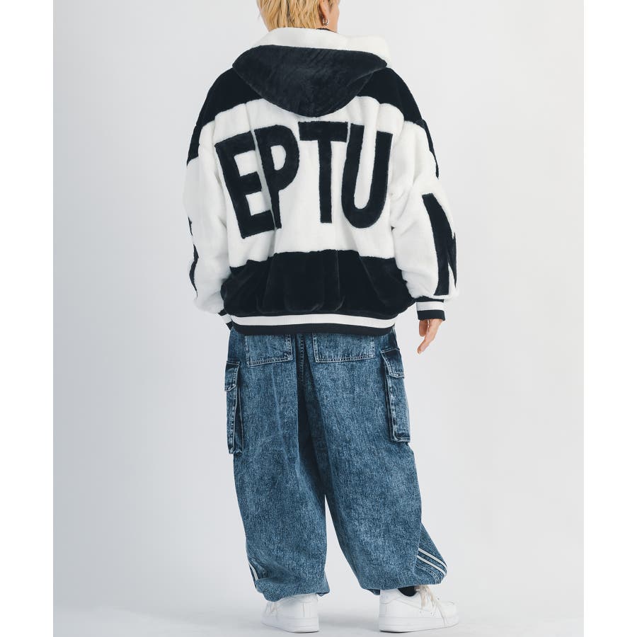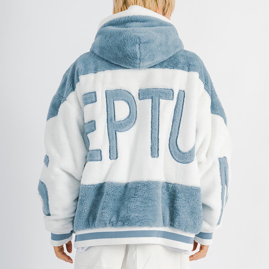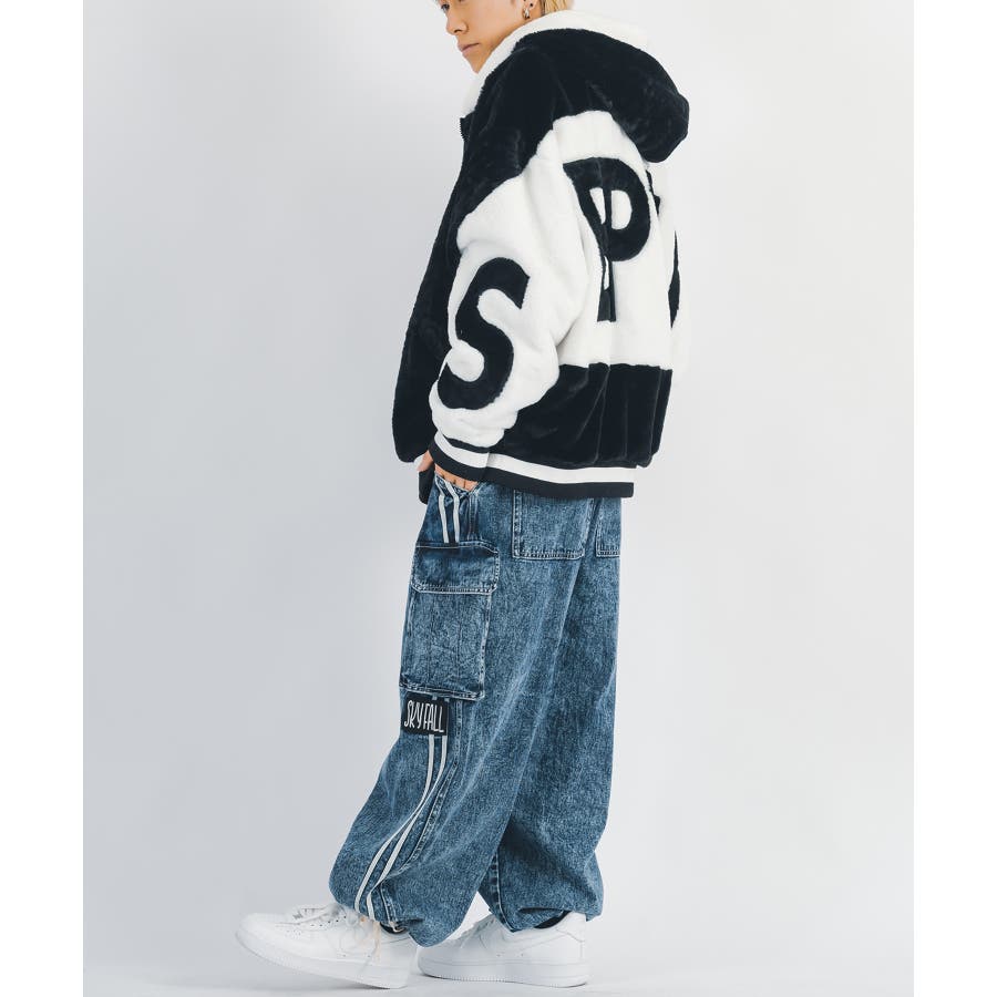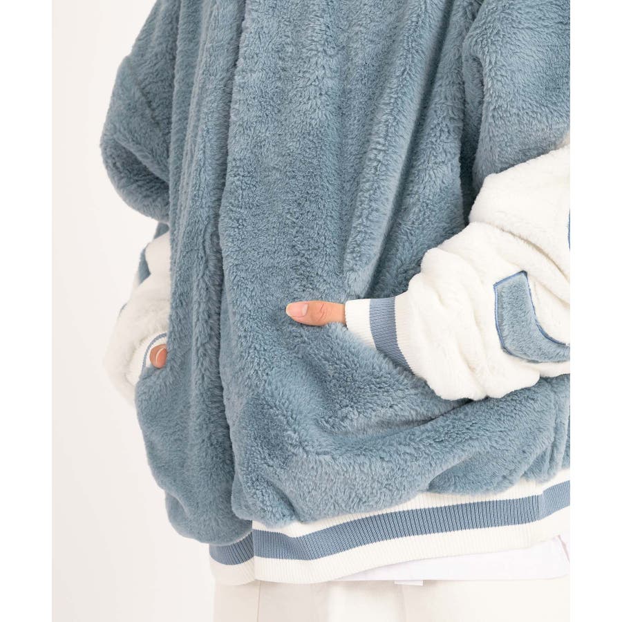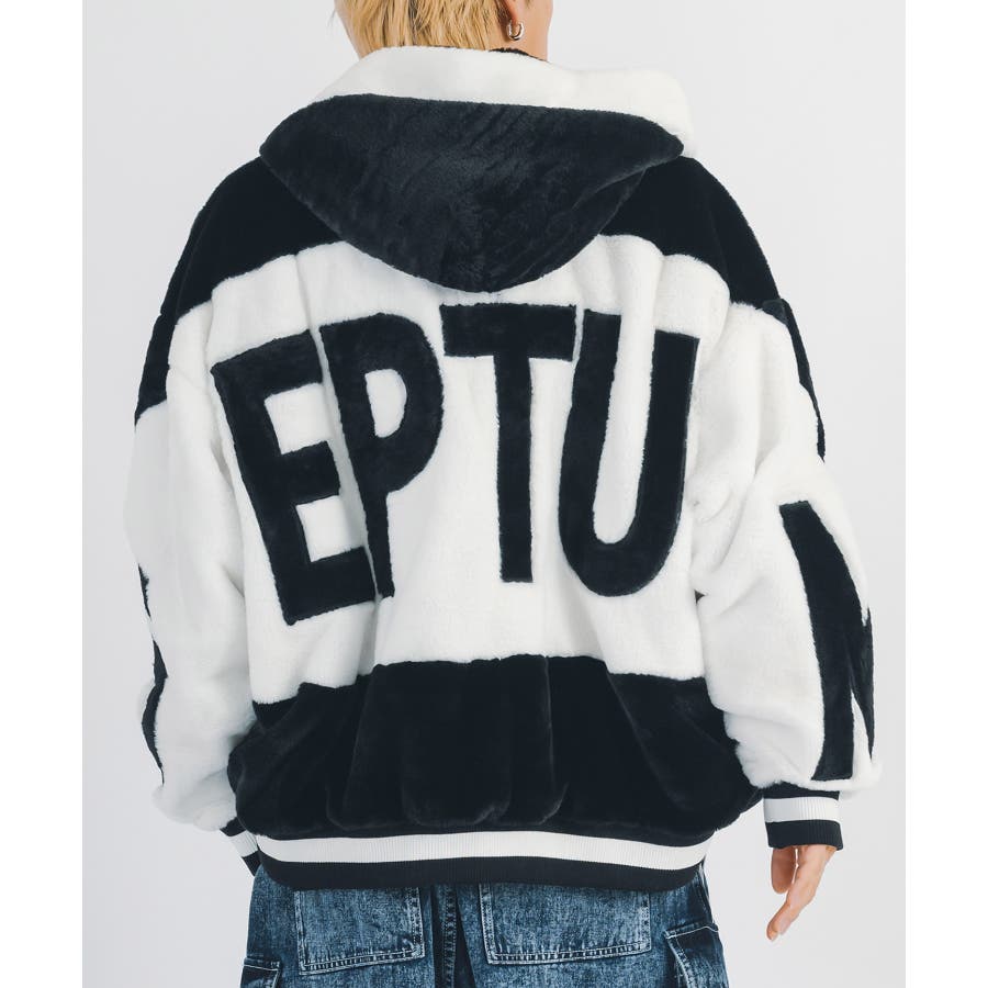 バックにビッグなロゴを配置したフード付きのオーバーサイズに着られるファーブルゾン。