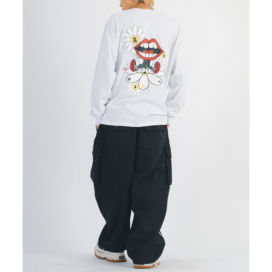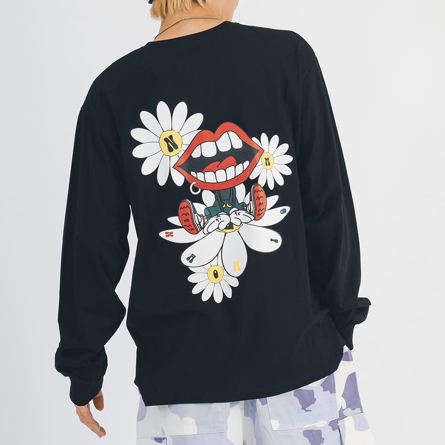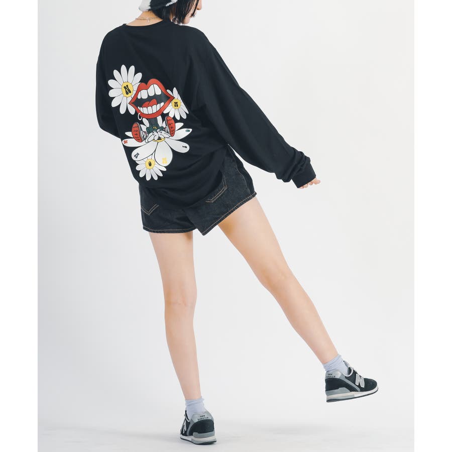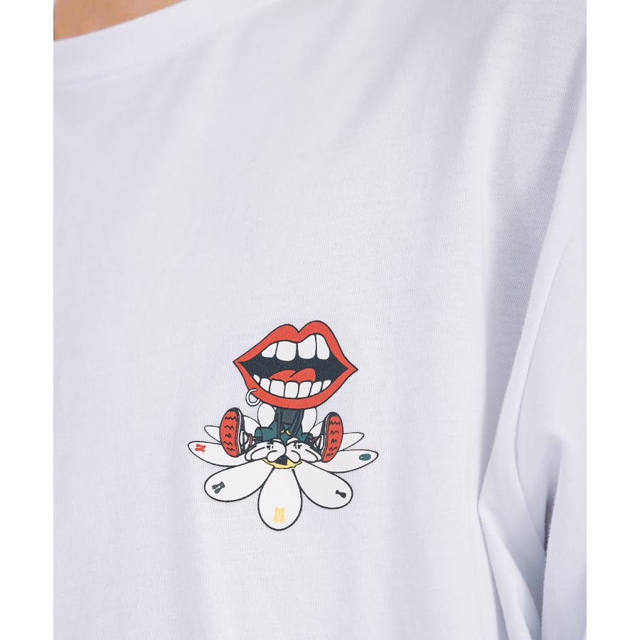 胸にワンポイントとバックは大きめのプリントが印象的。キャラクターが花びらに乗って自由に飛び回っているかの様な可愛いデザインはユニセックスに着られるアイテム。