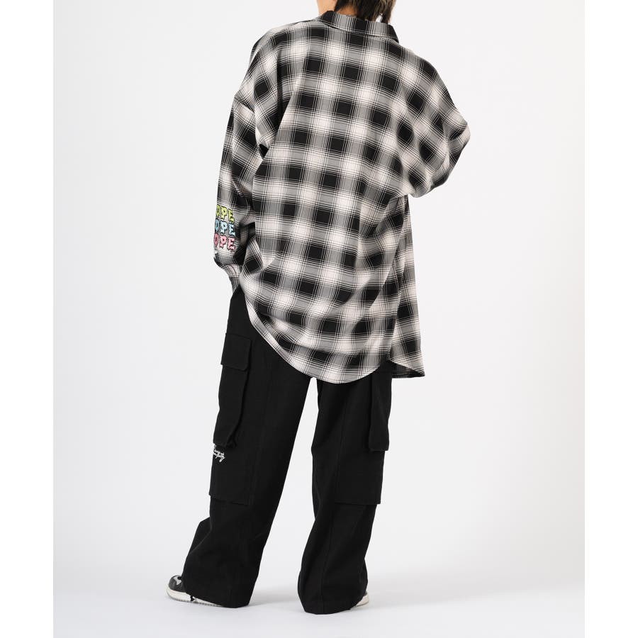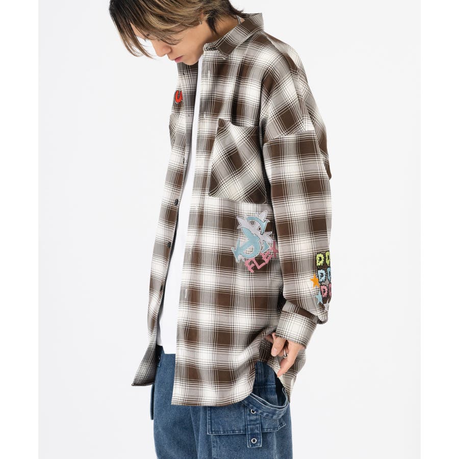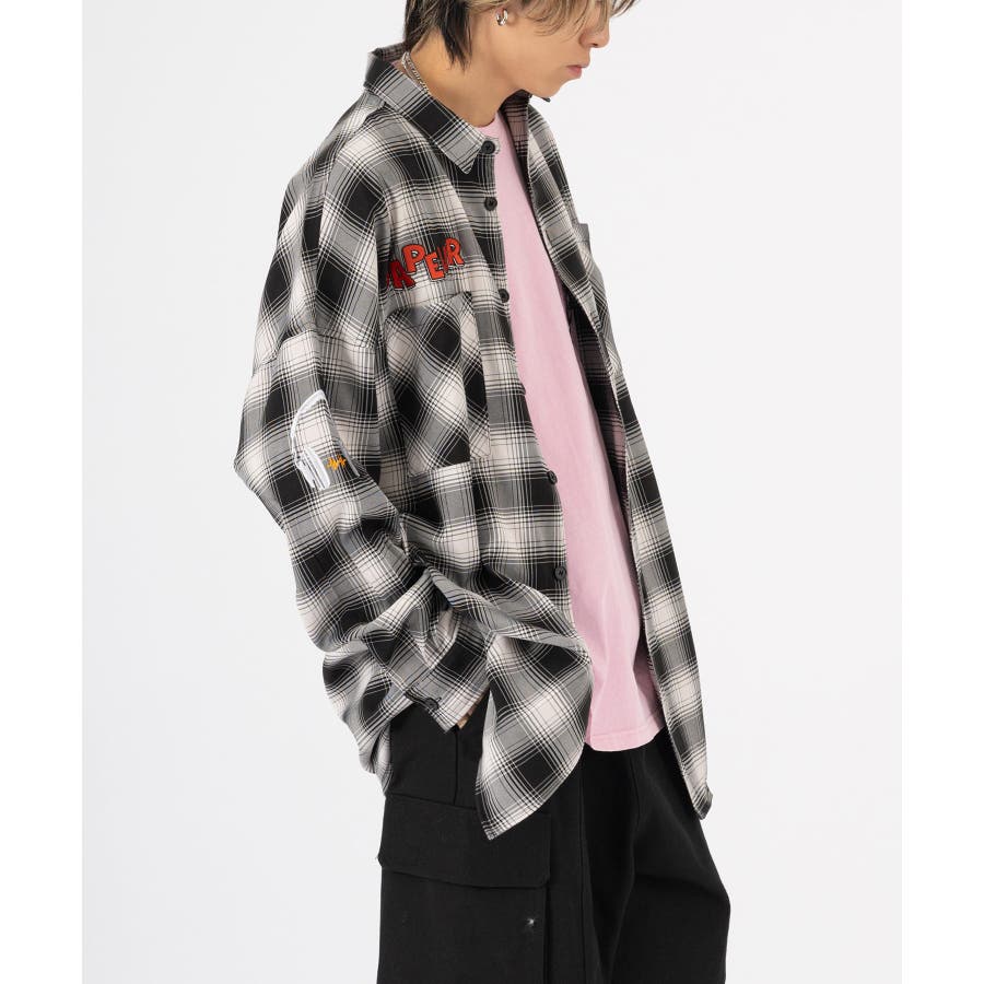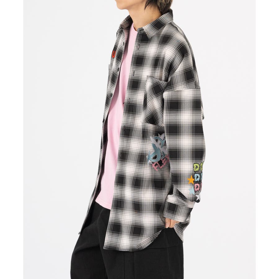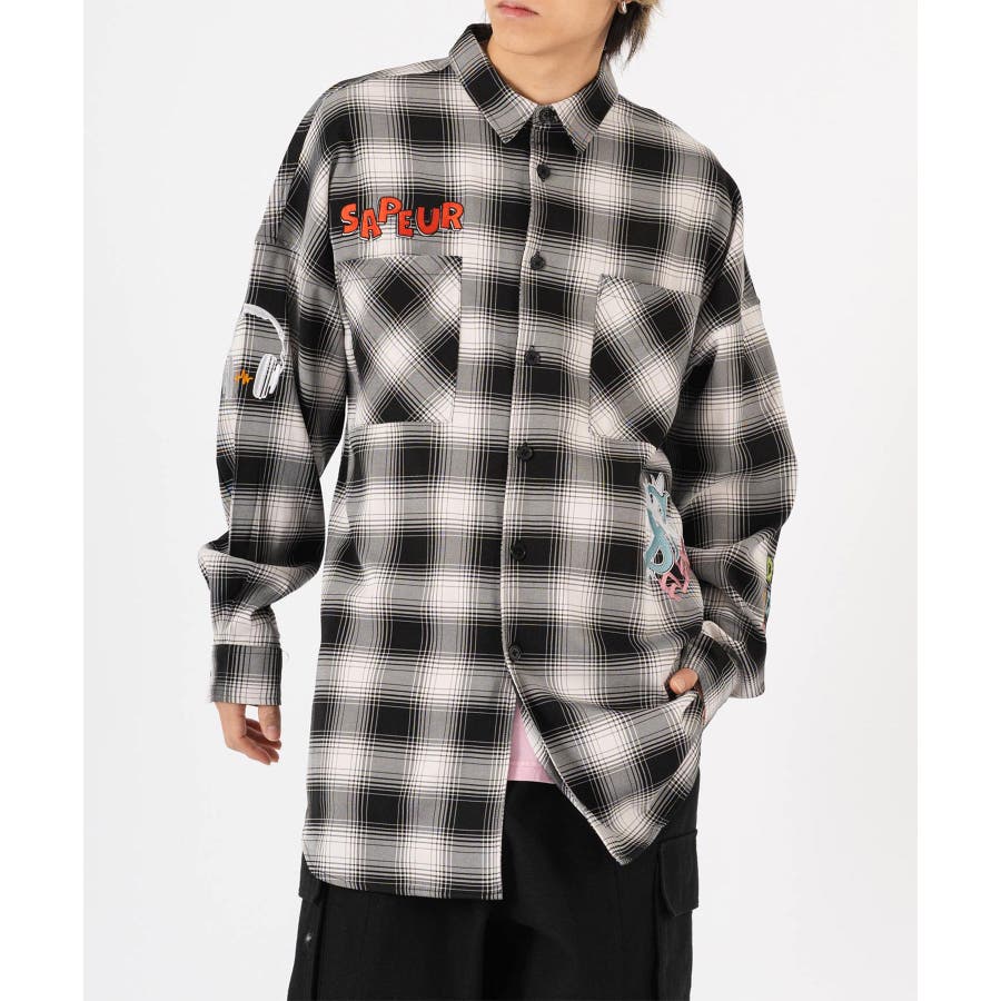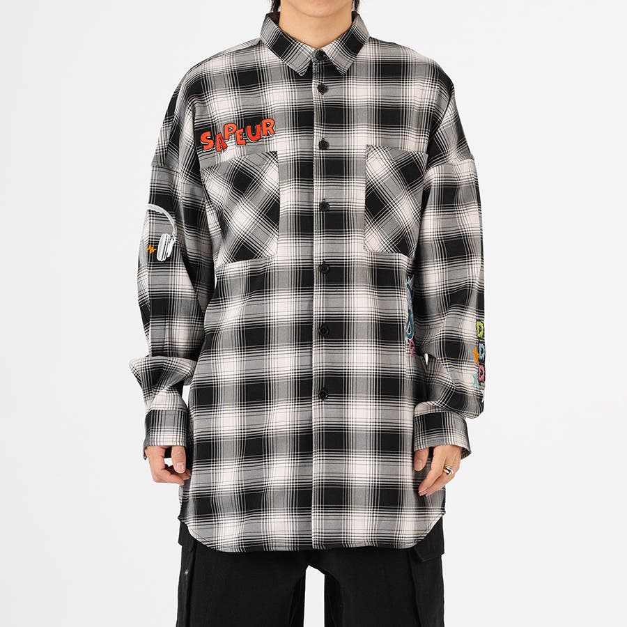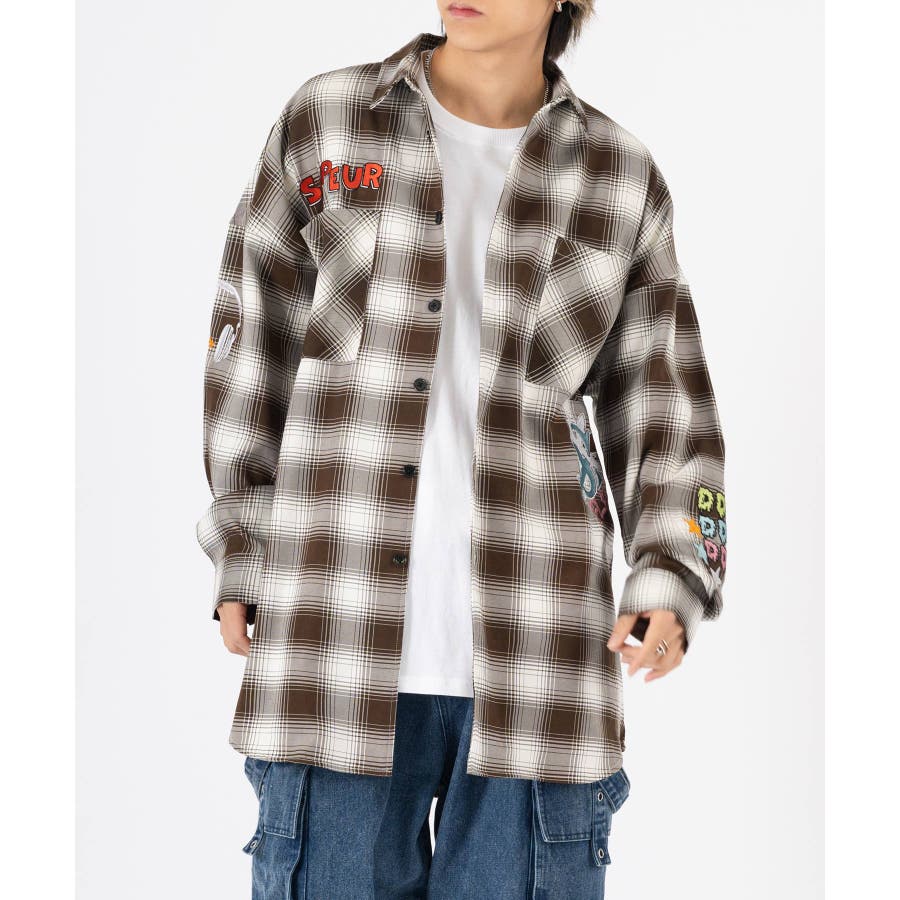 グラフィティなロゴを全体にプリントしたオーバーサイズの長袖シャツ。