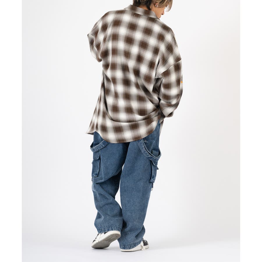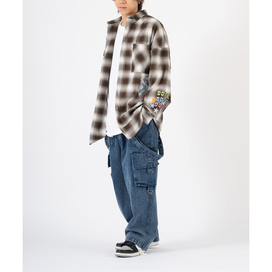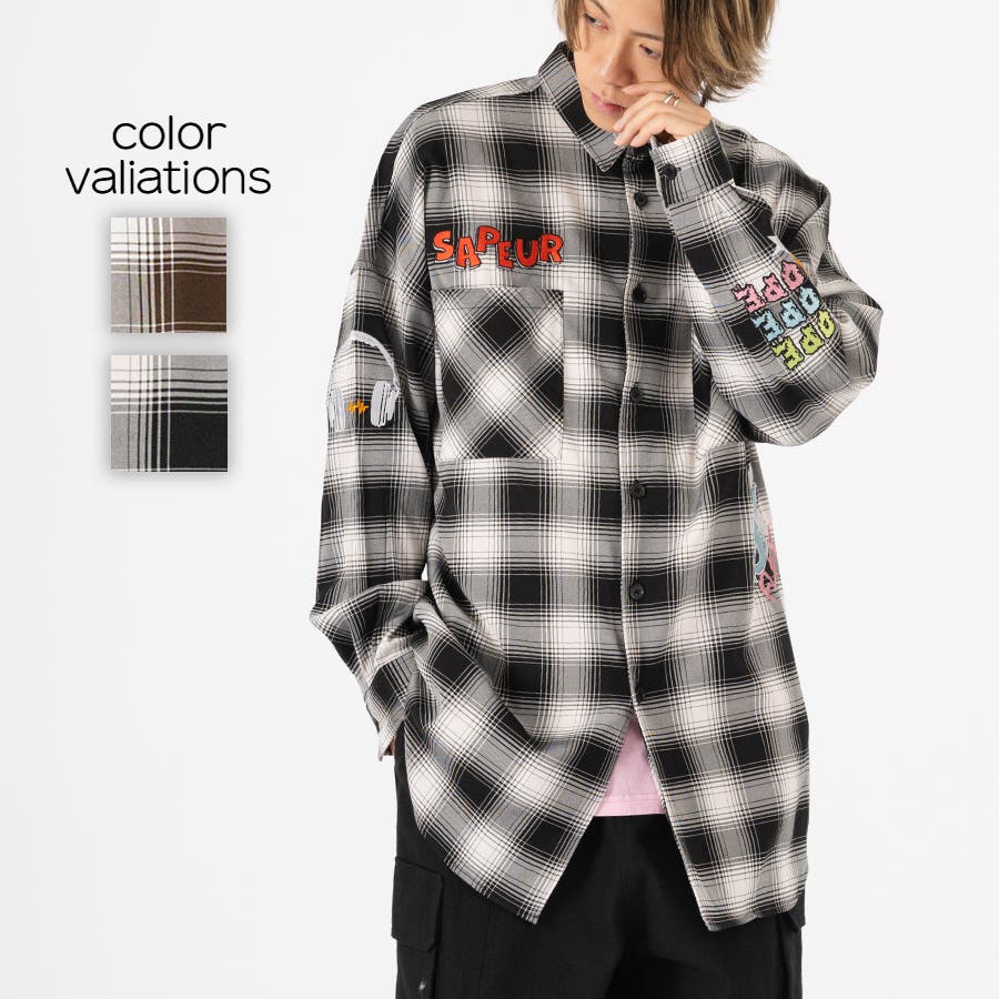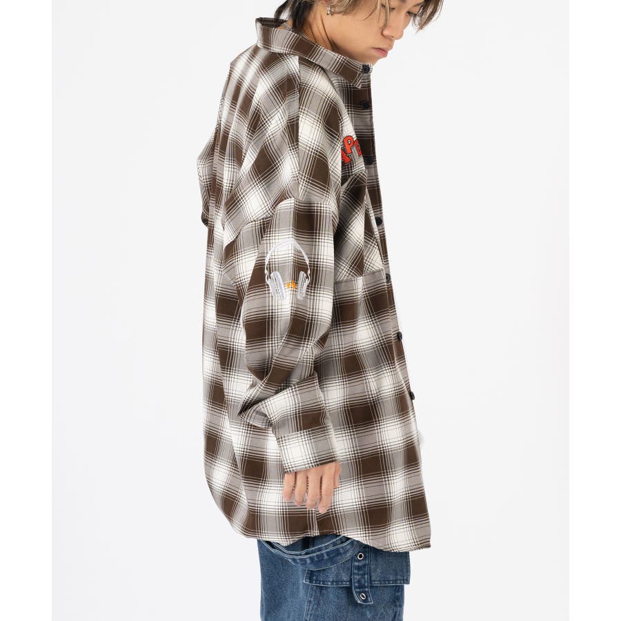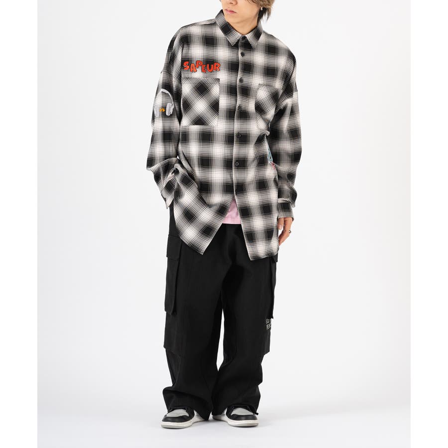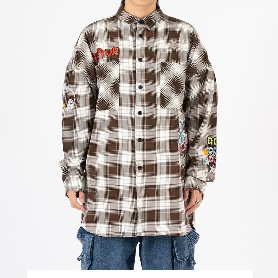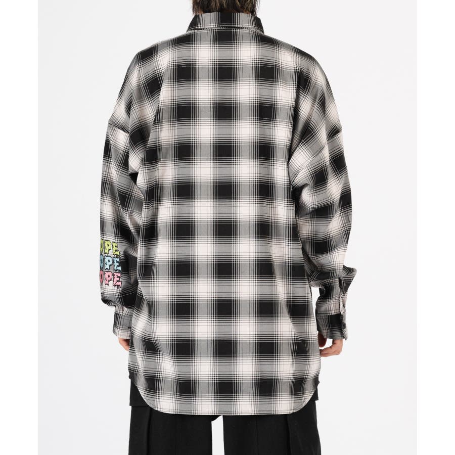 グラフィティなロゴを全体にプリントしたオーバーサイズの長袖シャツ。