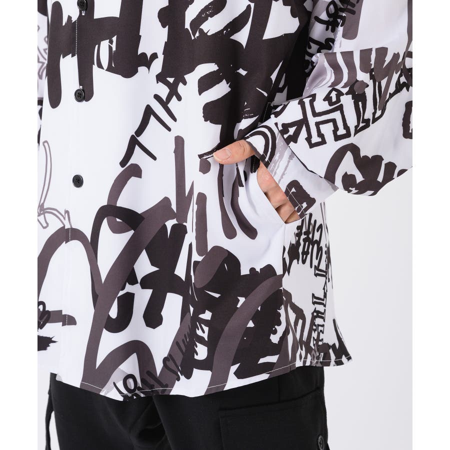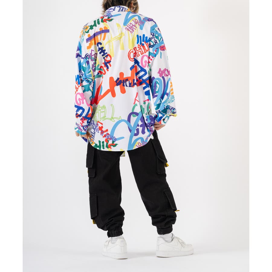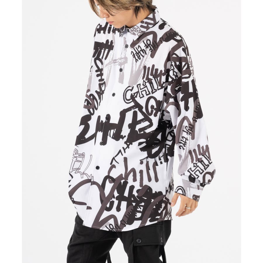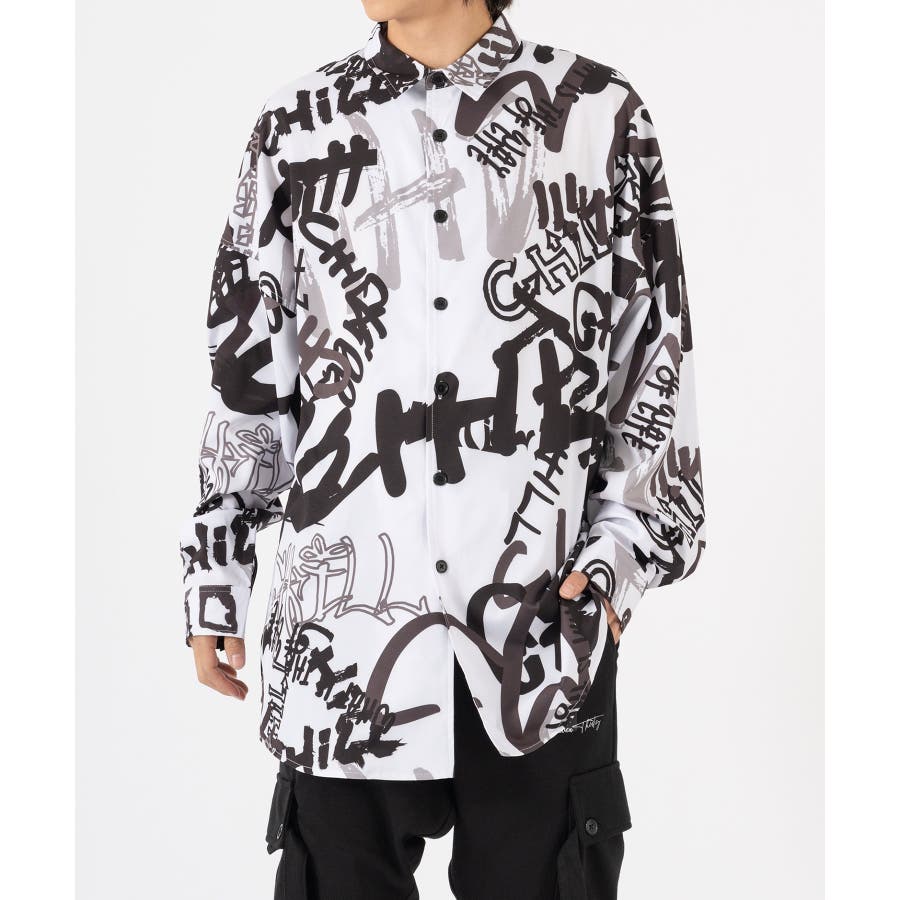 グラフィティなロゴを全体にプリントしたオーバーサイズの長袖シャツ。