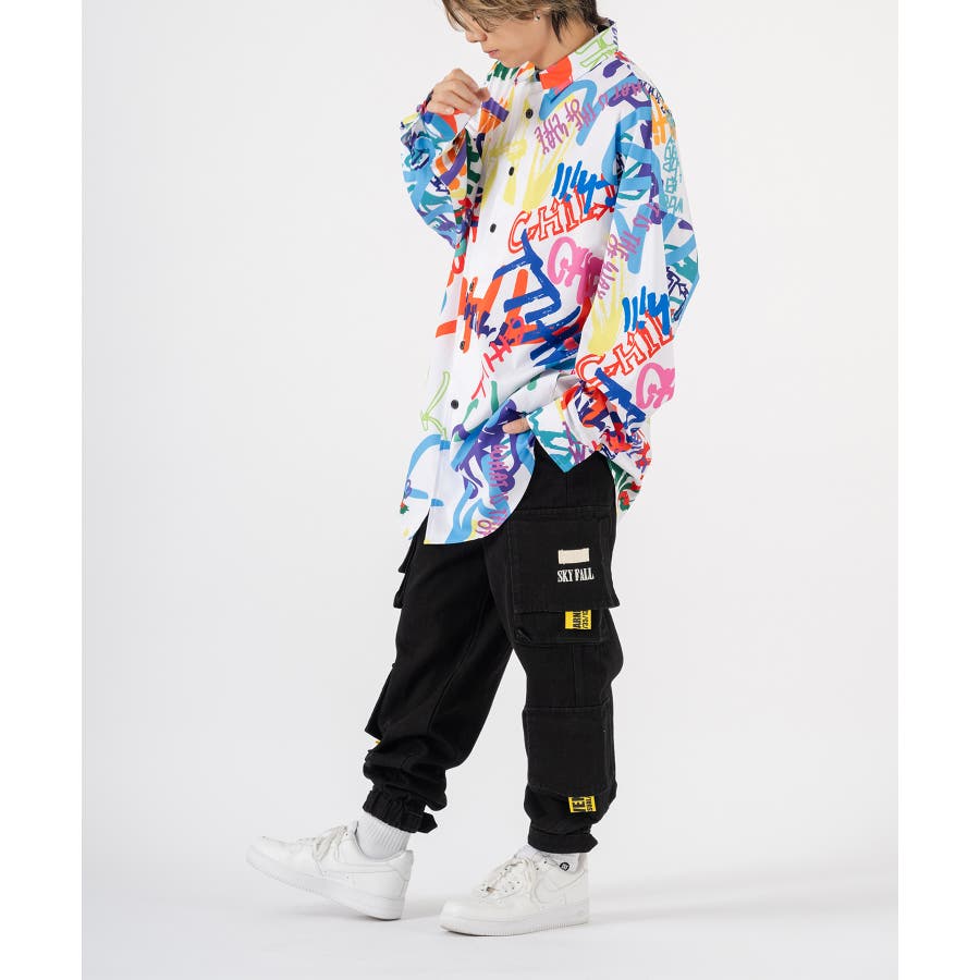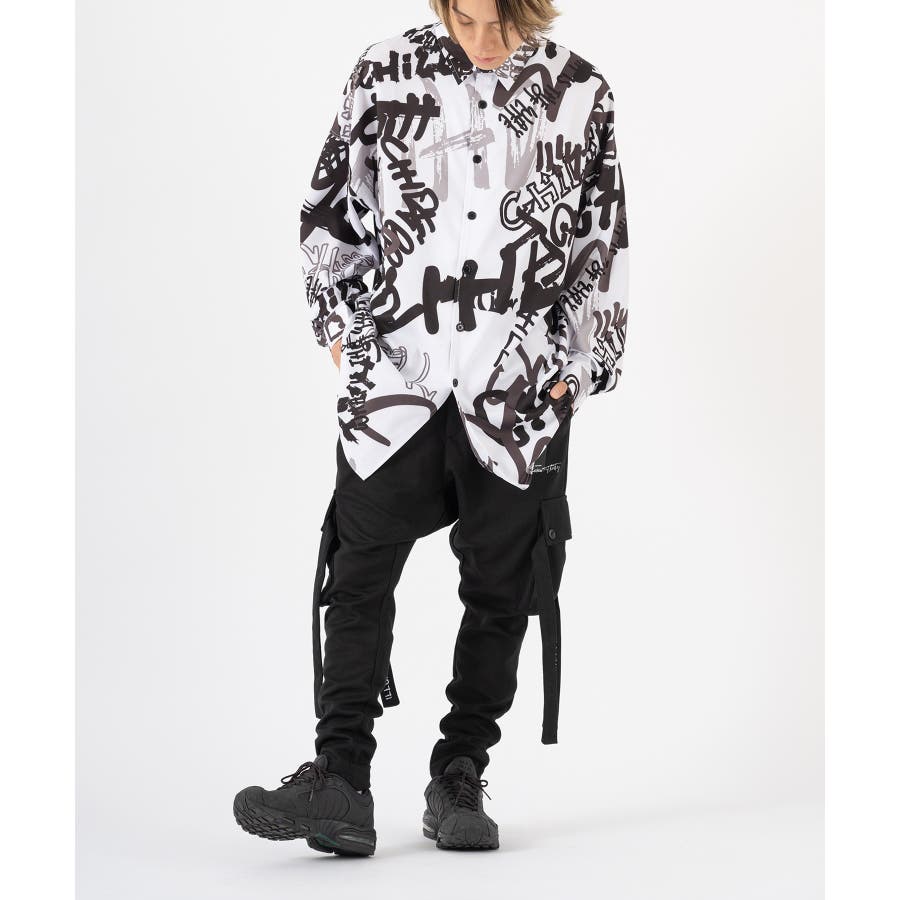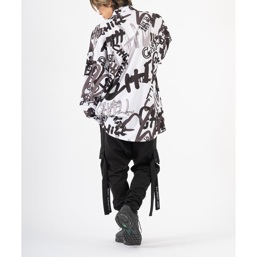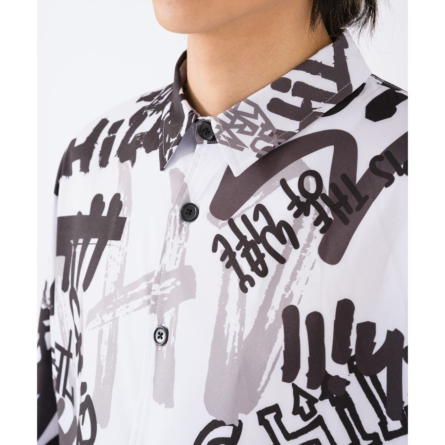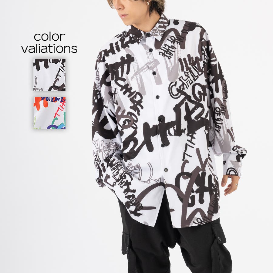 グラフィティなロゴを全体にプリントしたオーバーサイズの長袖シャツ。