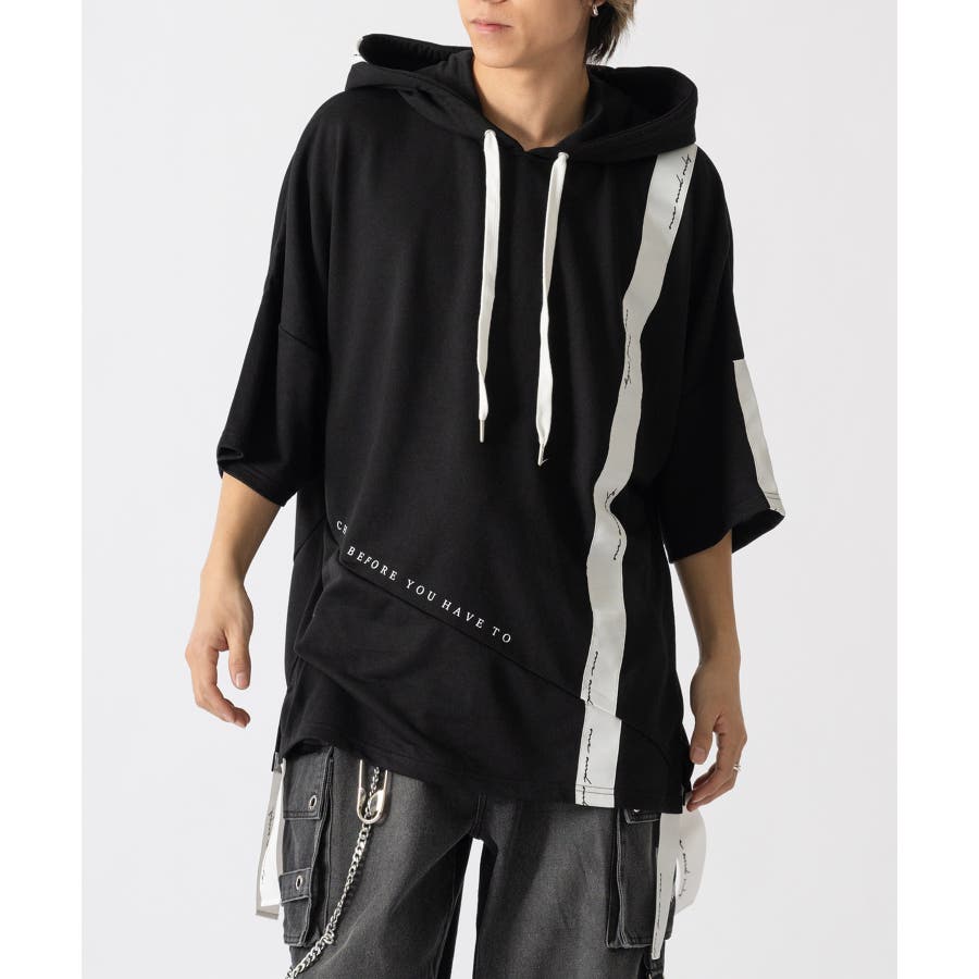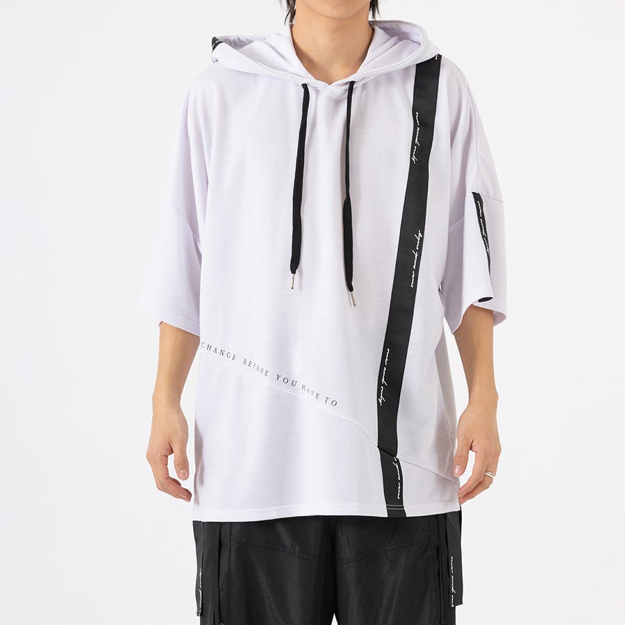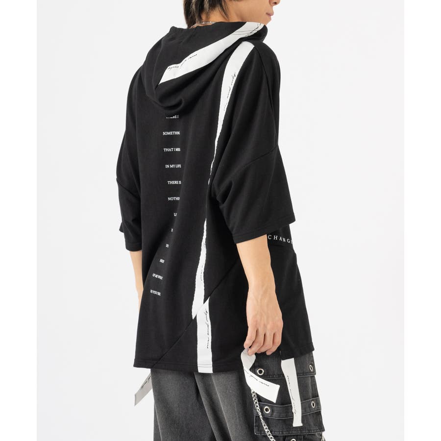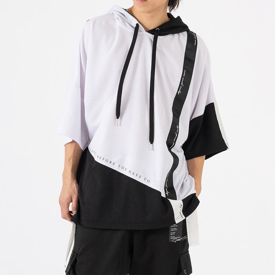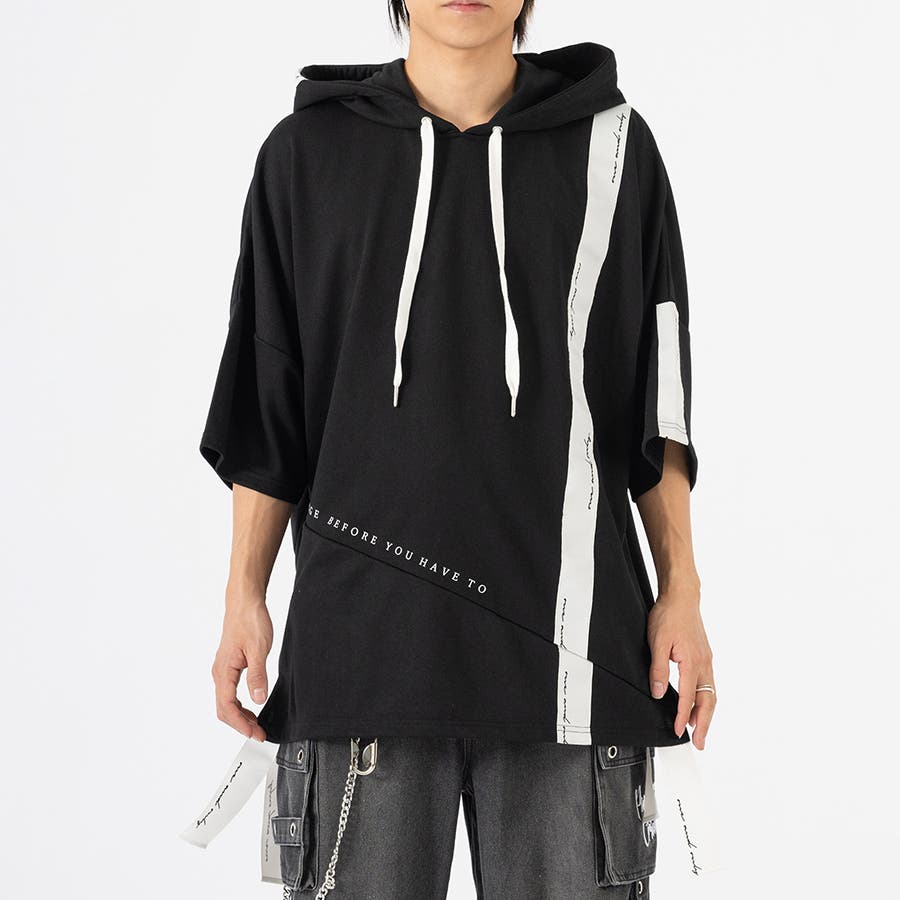 Tシャツにフードがついたオーバーサイズの半袖パーカー。