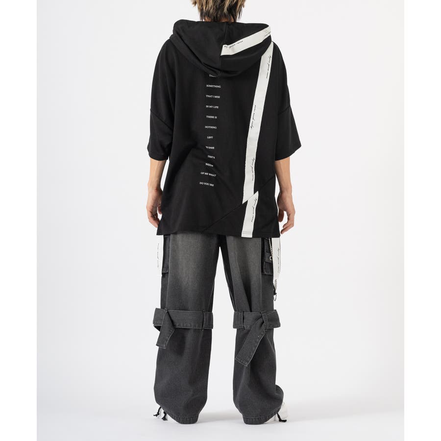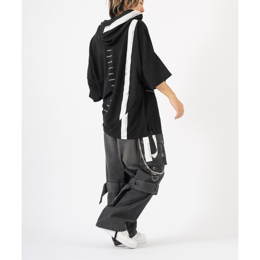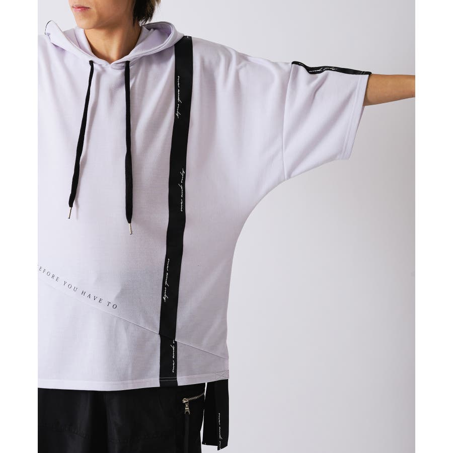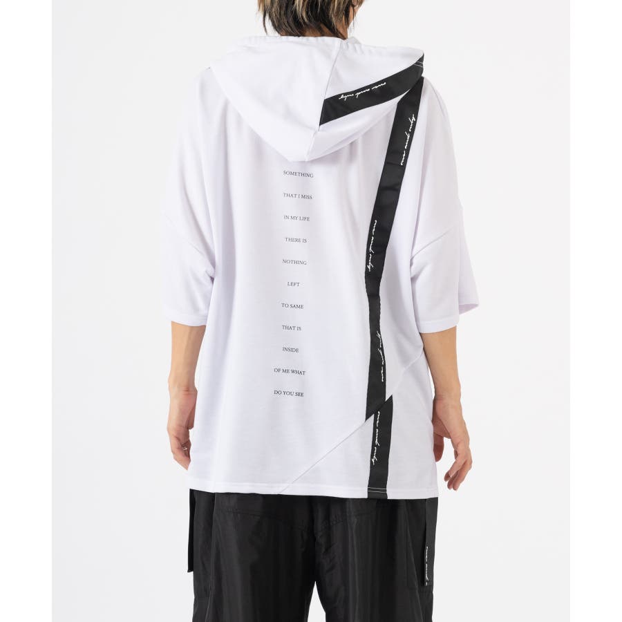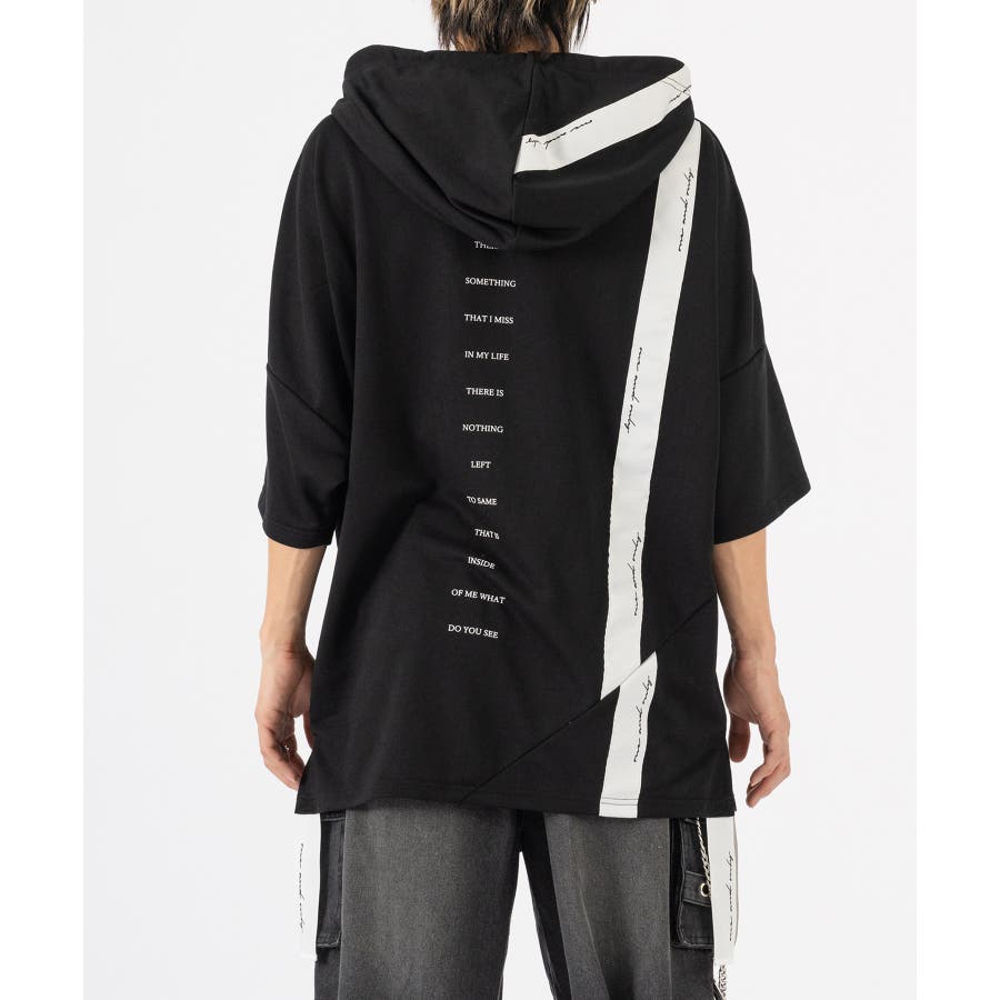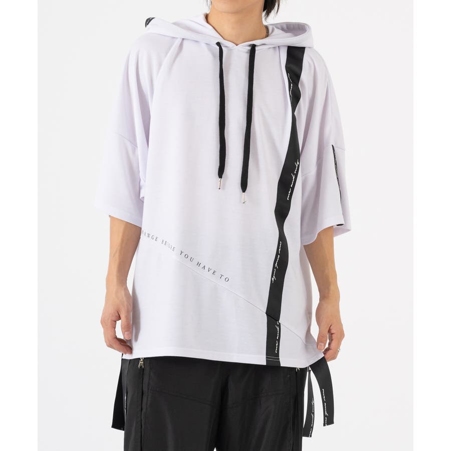 Tシャツにフードがついたオーバーサイズの半袖パーカー。