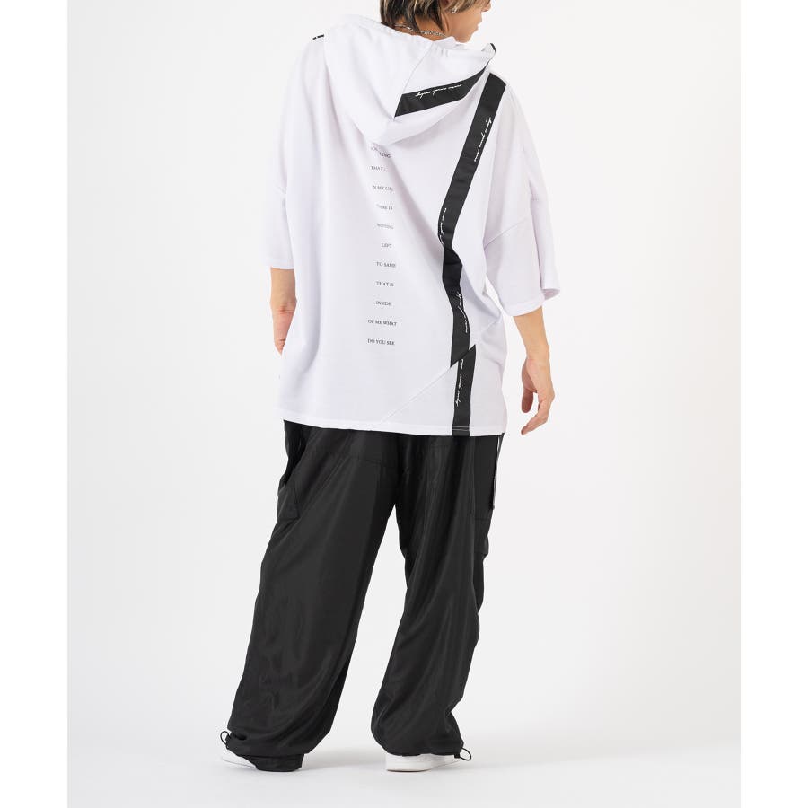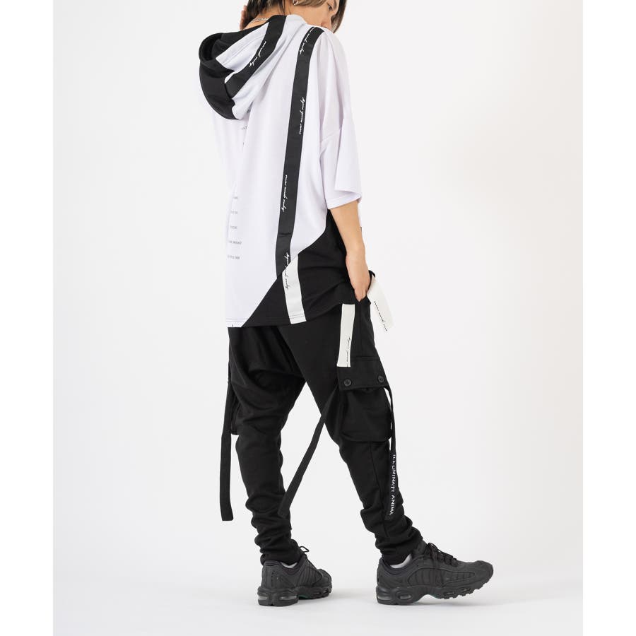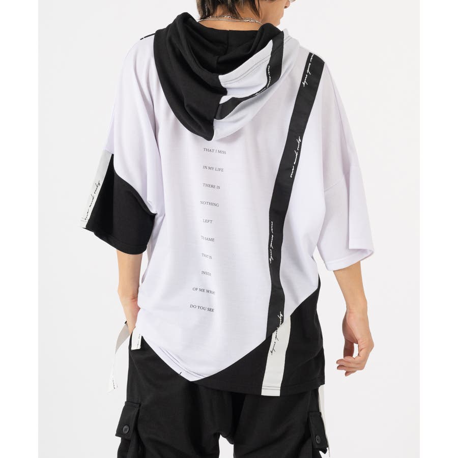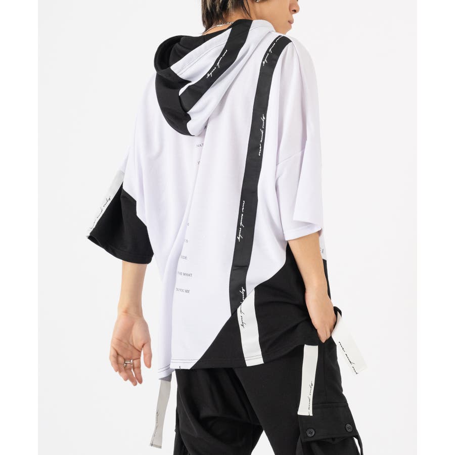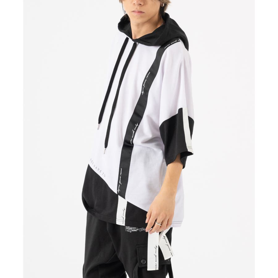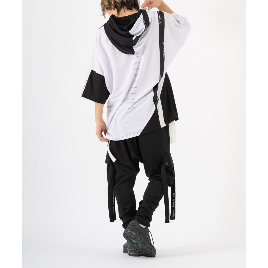 両サイドから伸びているテープはインパクトのあるデザイン。ドルマンスリーブのオーバーサイズなシルエットはユニセックスに着られる。モノトーンの切替が韓国モードを思わせるデザイン。