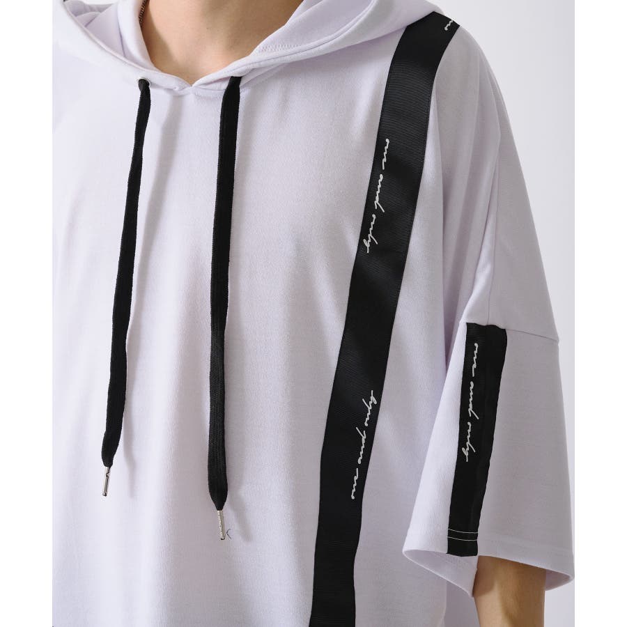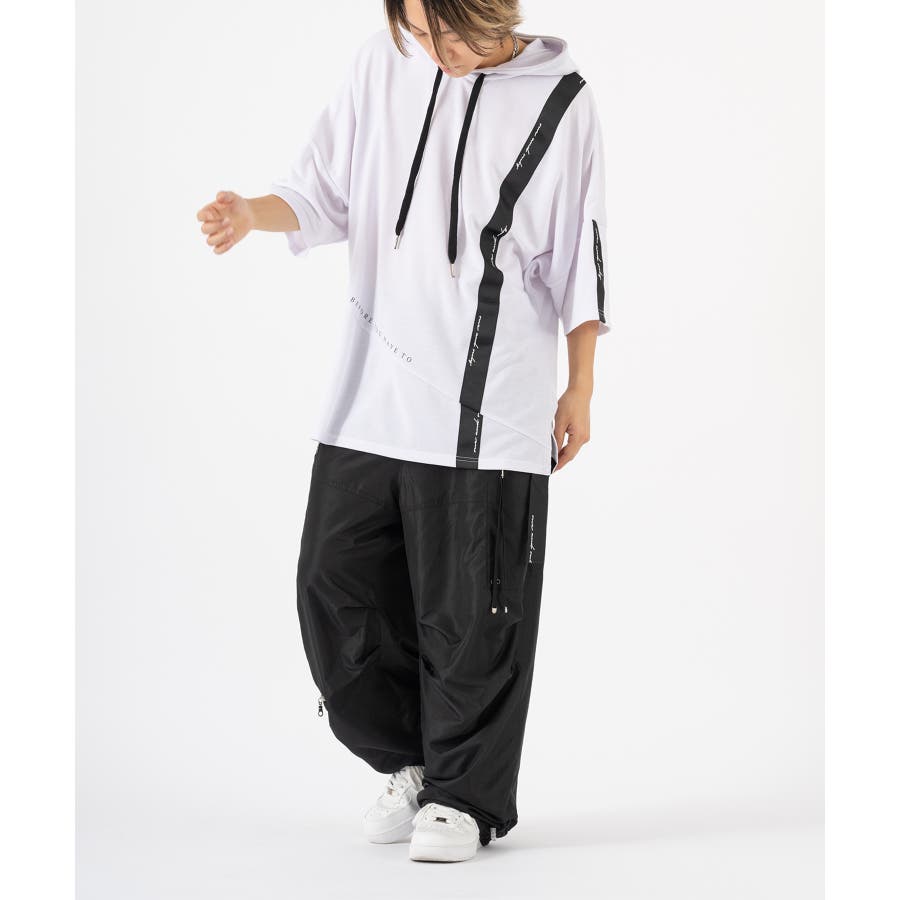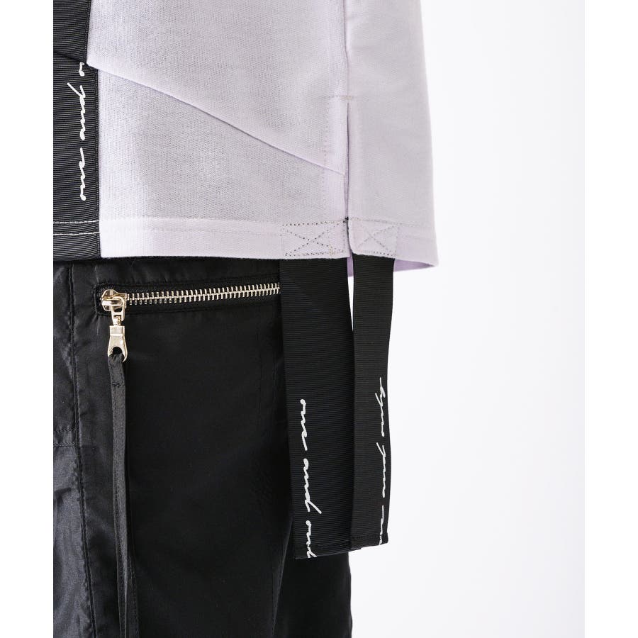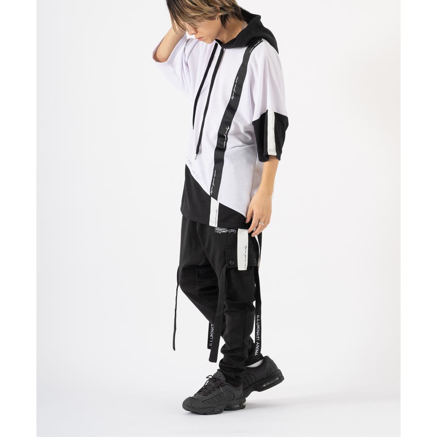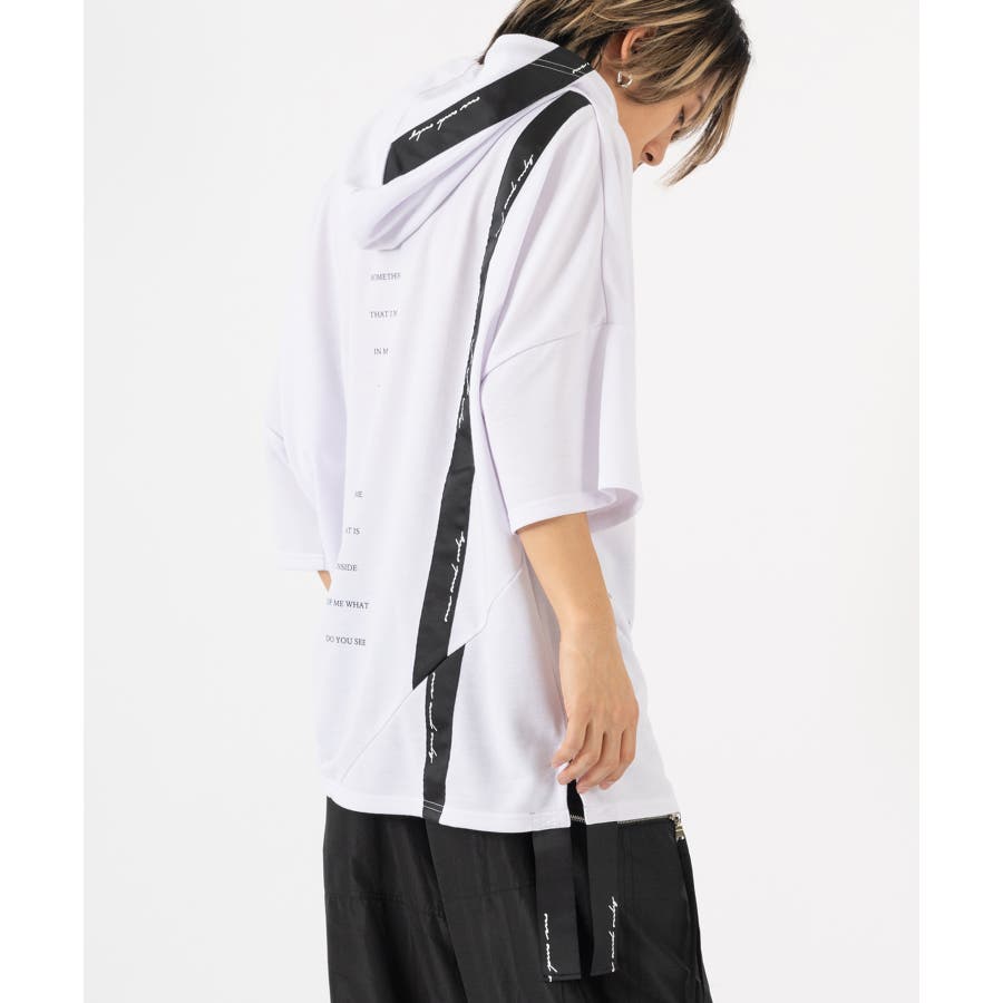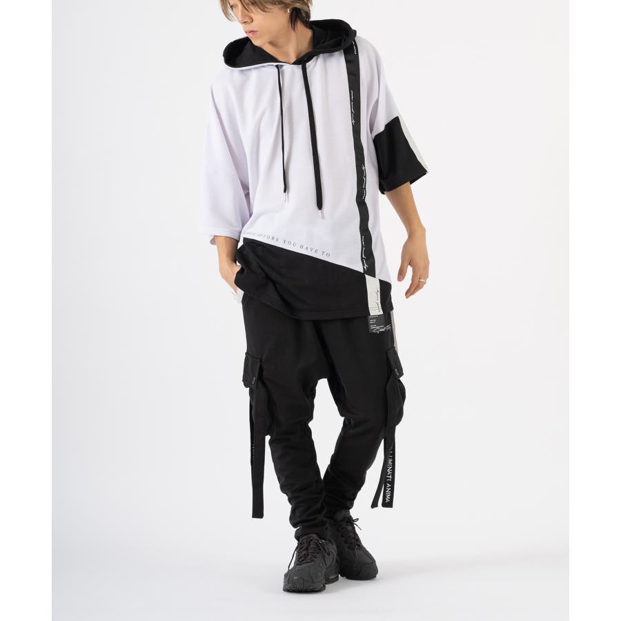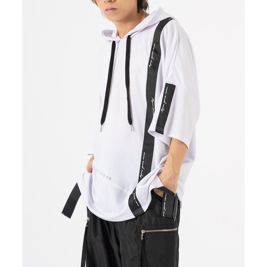 両サイドから伸びているテープはインパクトのあるデザイン。ドルマンスリーブのオーバーサイズなシルエットはユニセックスに着られる。モノトーンの切替が韓国モードを思わせるデザイン。
