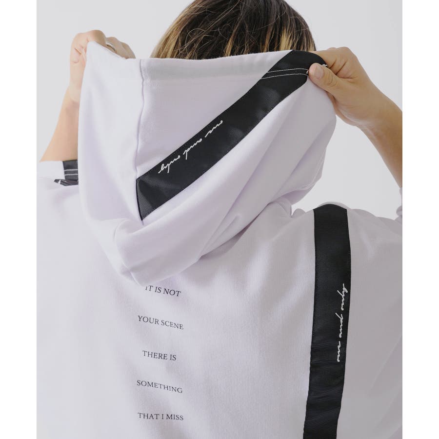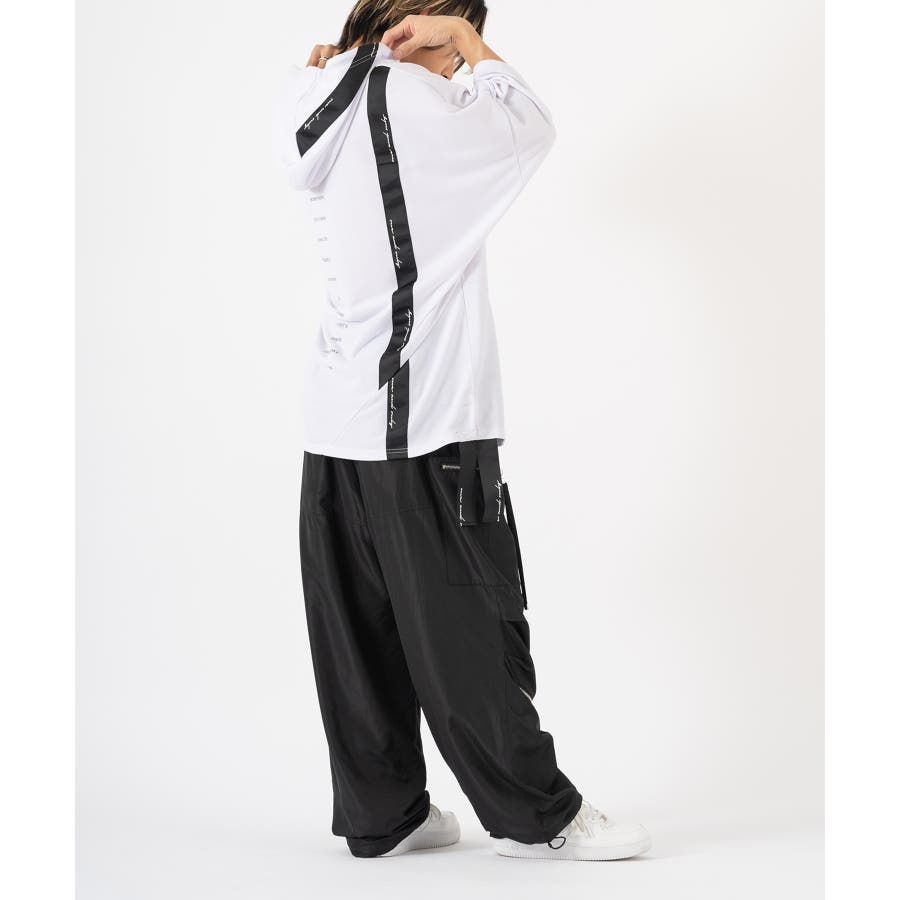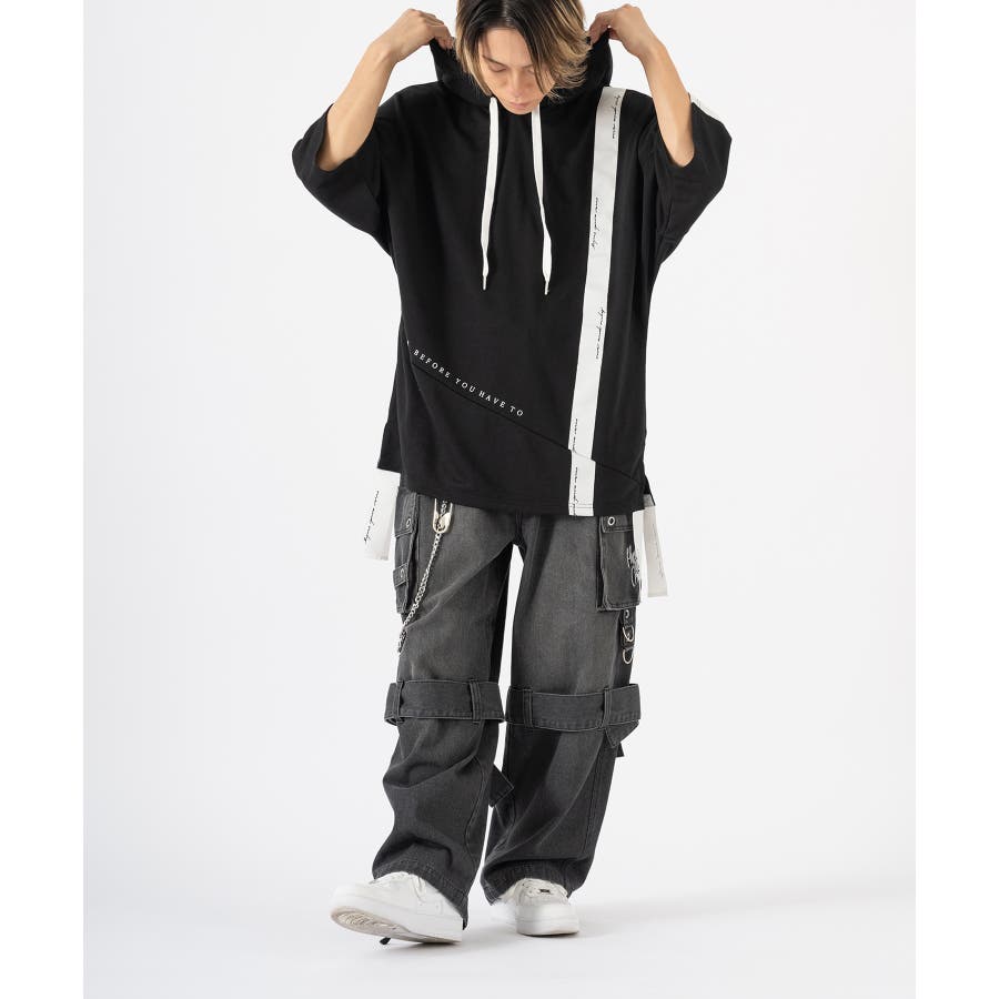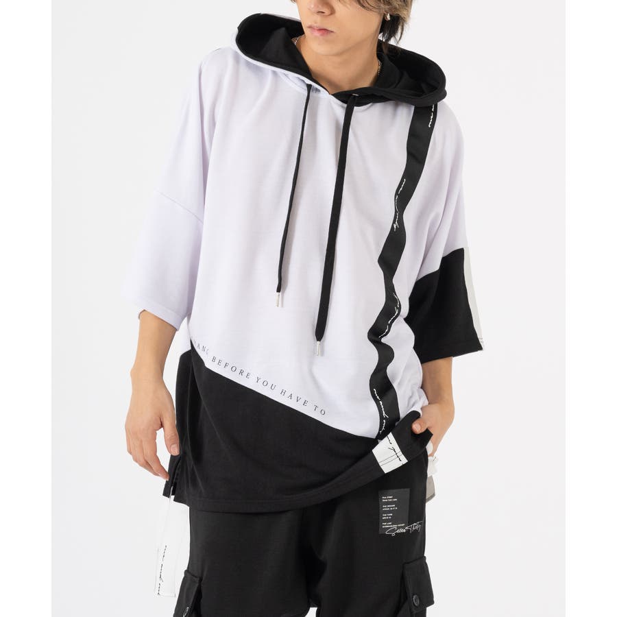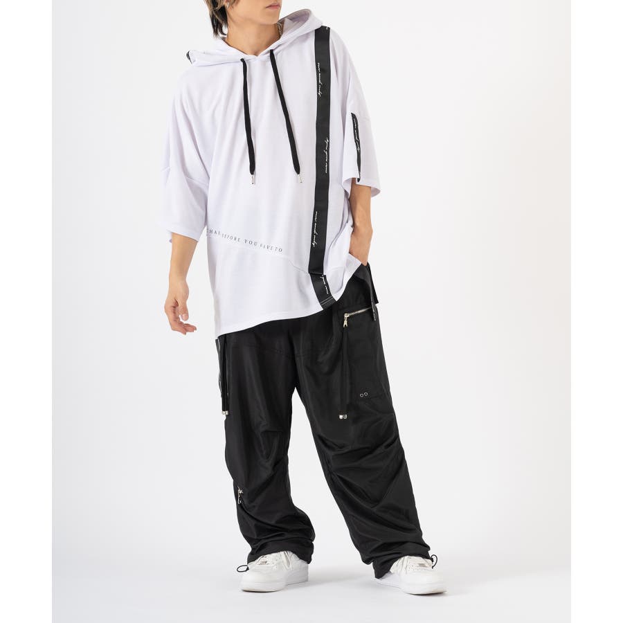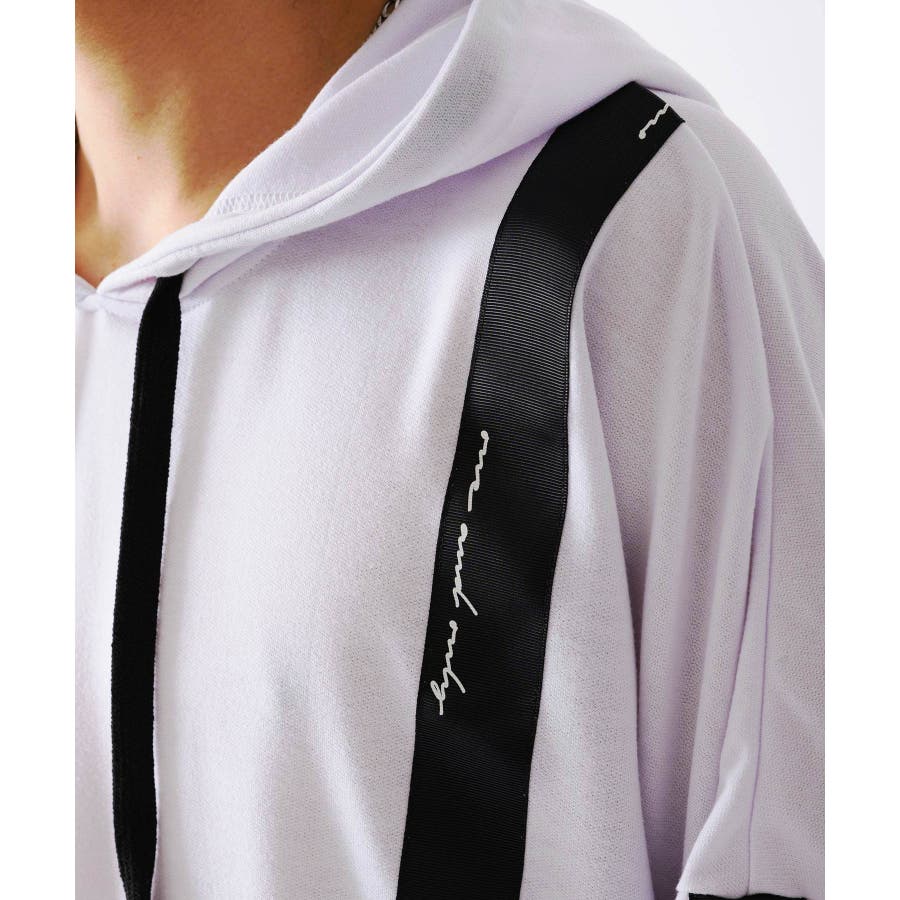 両サイドから伸びているテープはインパクトのあるデザイン。ドルマンスリーブのオーバーサイズなシルエットはユニセックスに着られる。モノトーンの切替が韓国モードを思わせるデザイン。