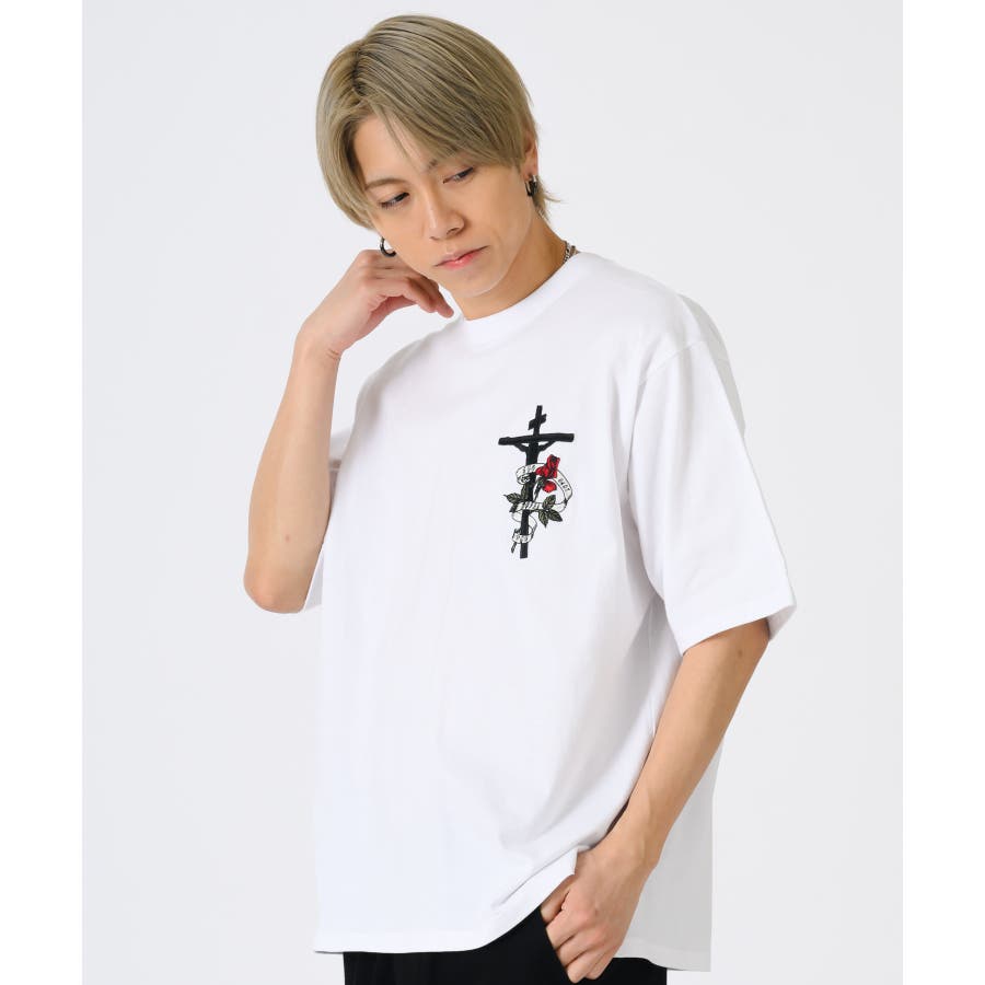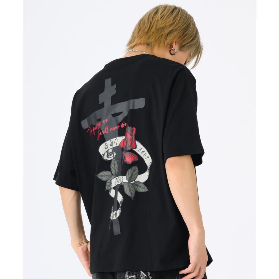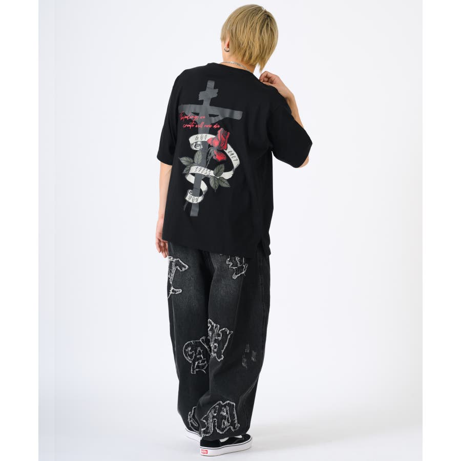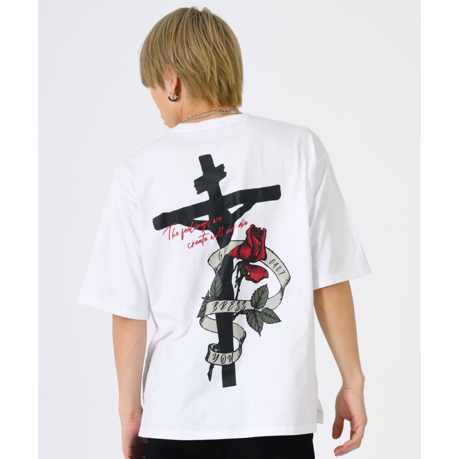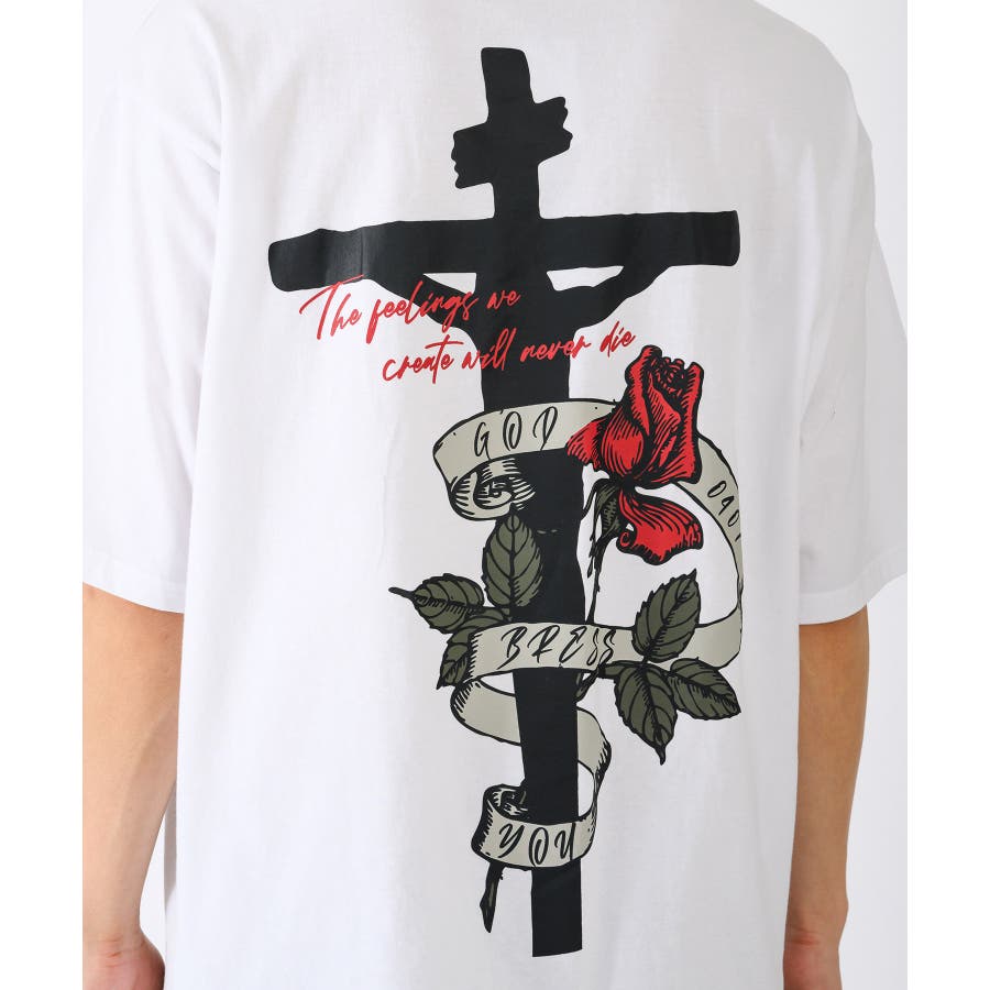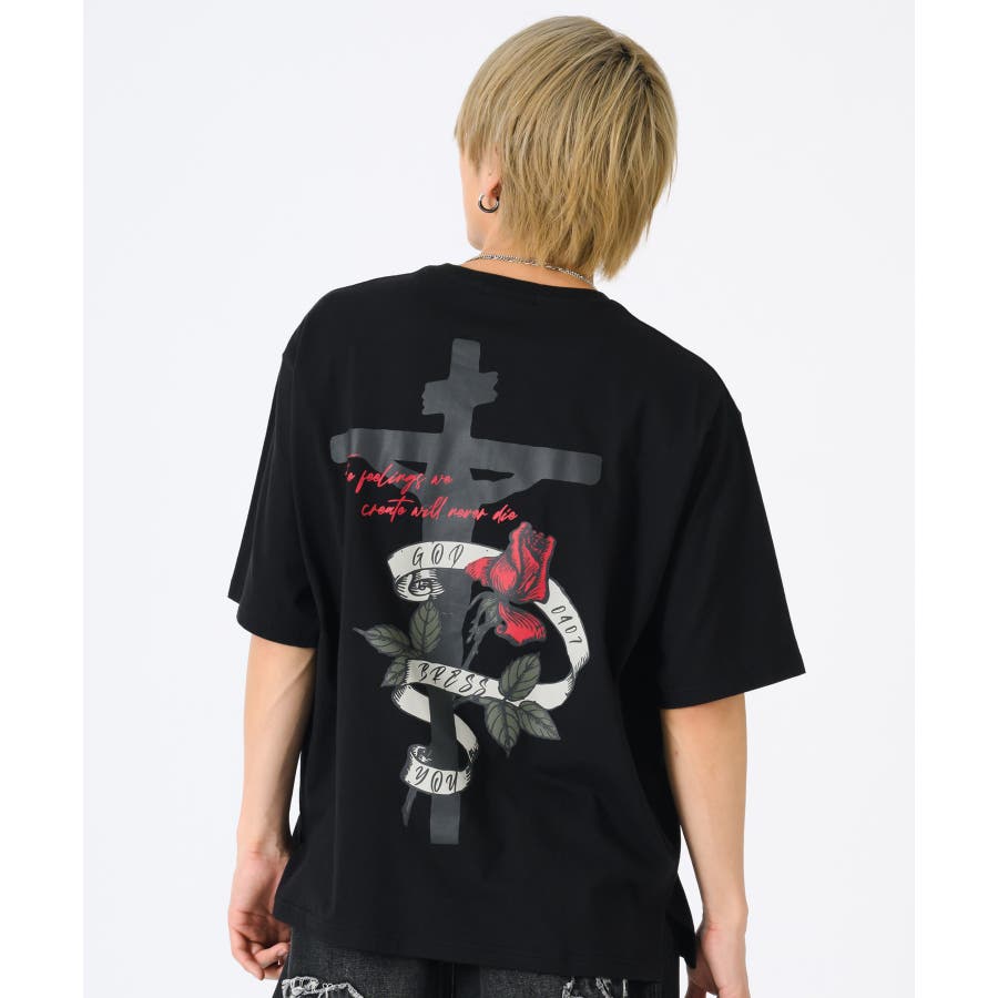 クロスとバラをモチーフにしたビッグシルエットのTシャツ。