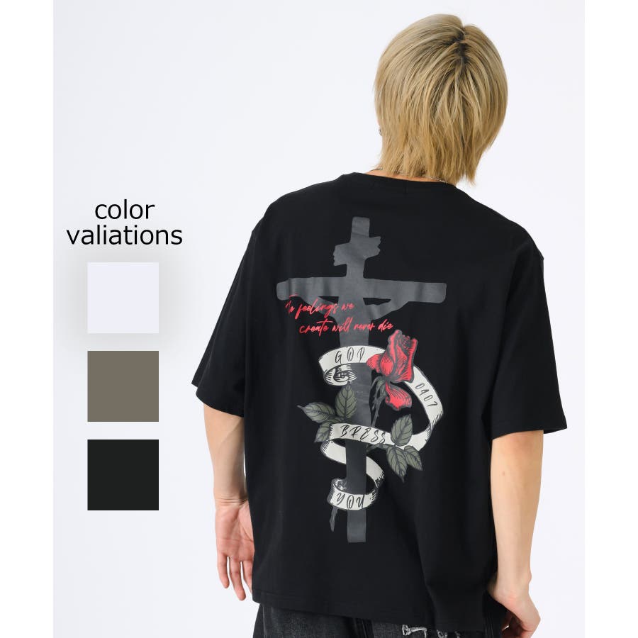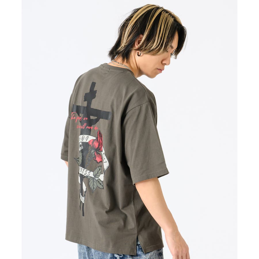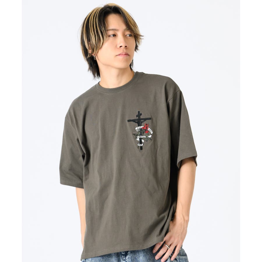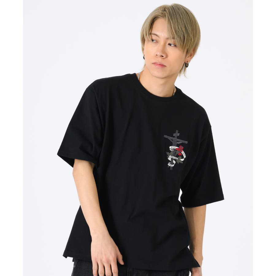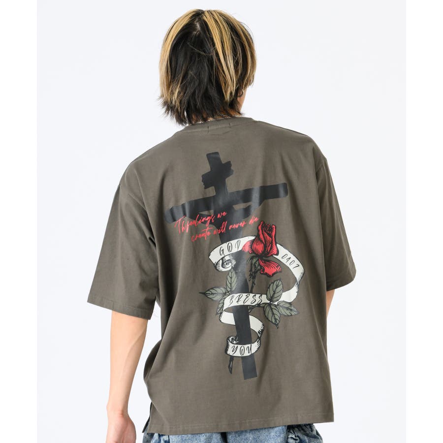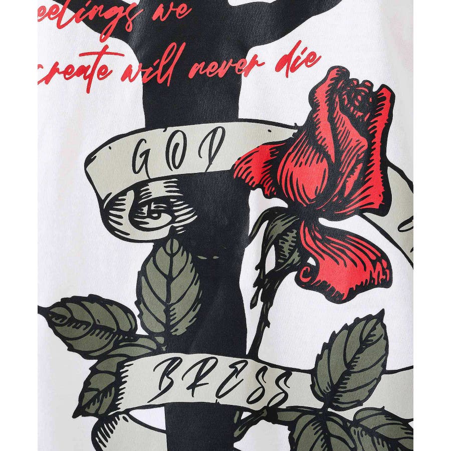 クロスとバラをモチーフにしたビッグシルエットのTシャツ。
