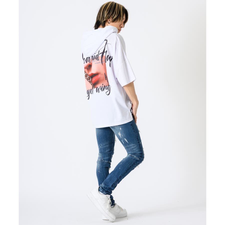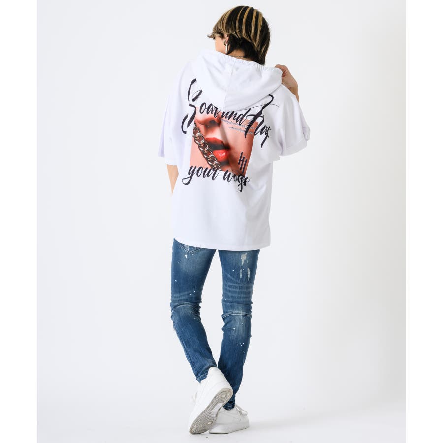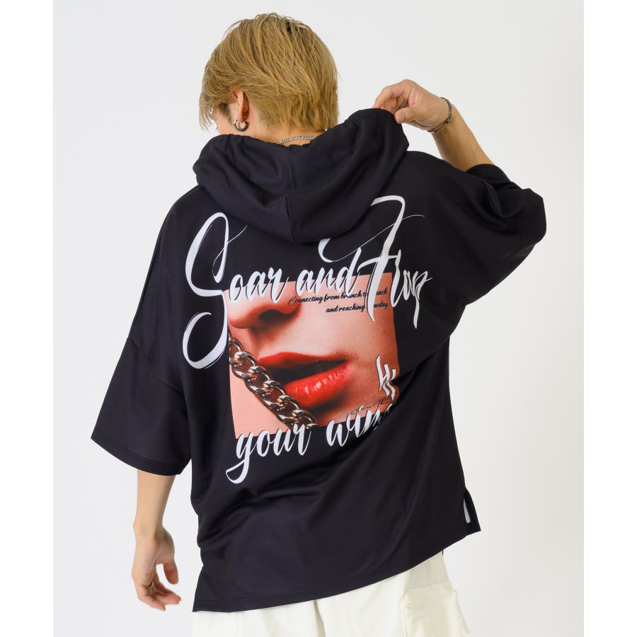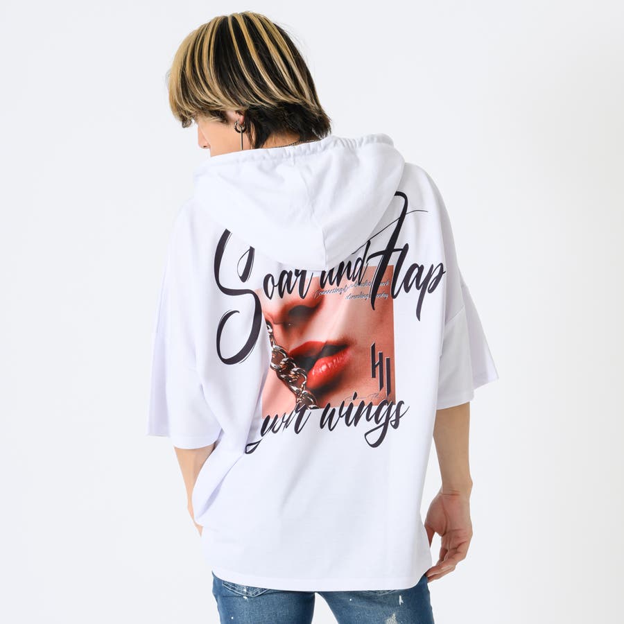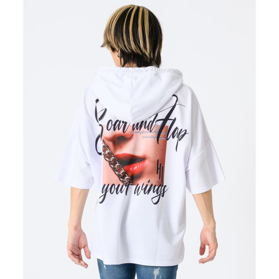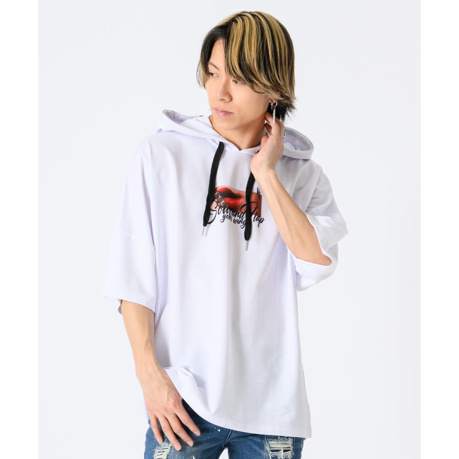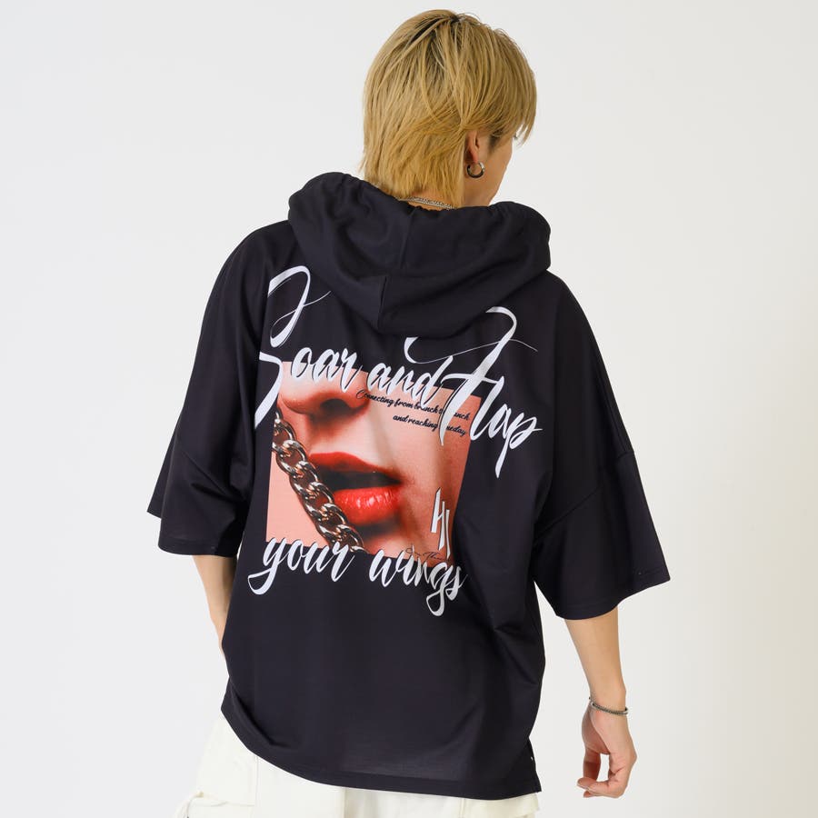 リップのフォトプリントが印象的な半袖パーカー。
