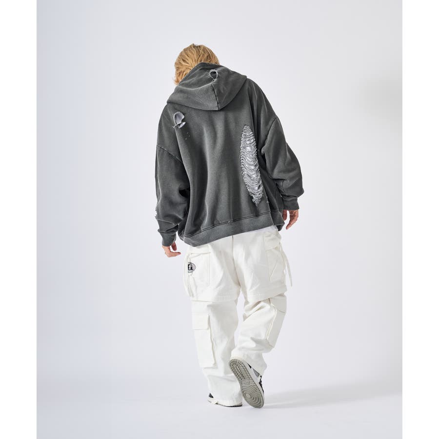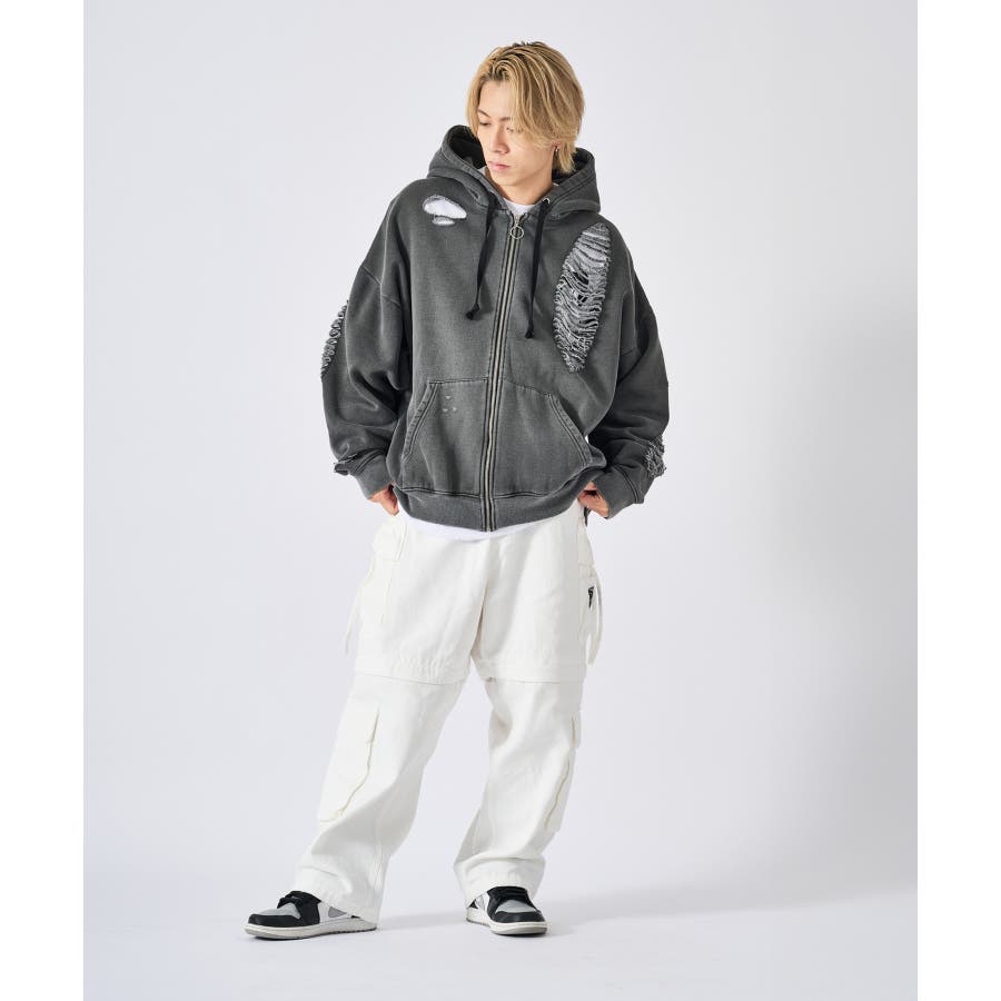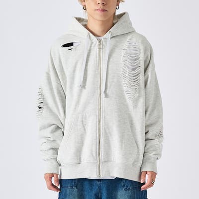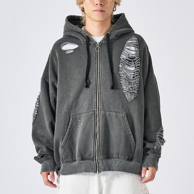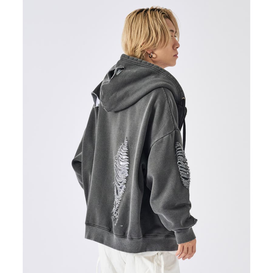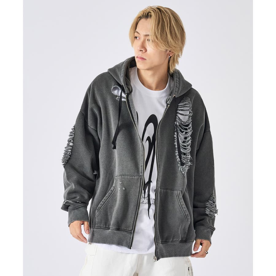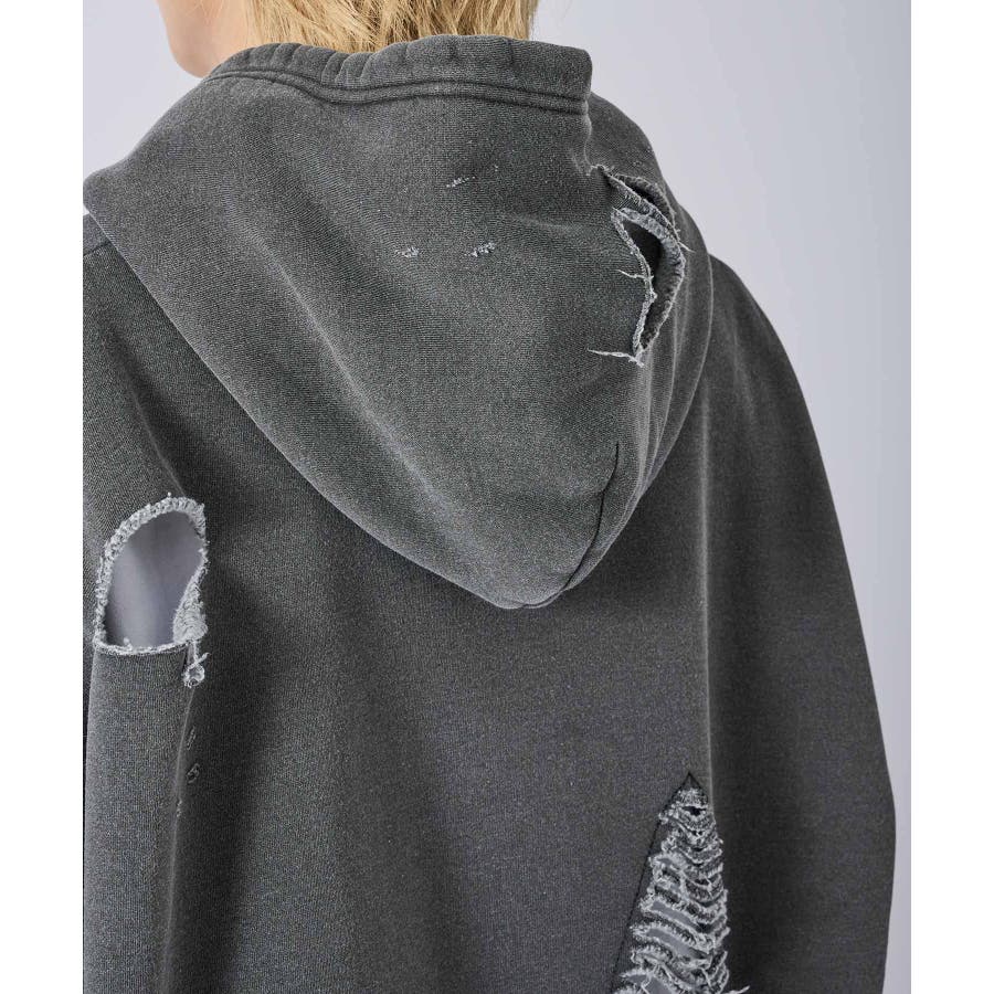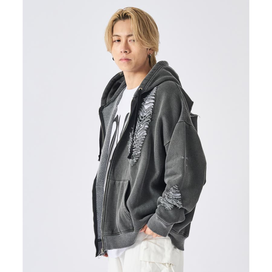 | グランジの雰囲気が漂うフルジップパーカー ■detail 前後左右、大小のダメージ加工を施し、着古した感のある色合いも渋い ポケットに配置したアイレットやレトロ感のあるファスナーが雰囲気を醸し出している ■fabric 裏起毛素材で温かく、ボリュームもあってライトアウターとして使えるアイテム ■styling 単体で存在感があるのでそれだけで様になりますが、モノトーンのロンTやTシャツなどインナーに合わせるとクールに着回せます | ||||||||||||||||||||