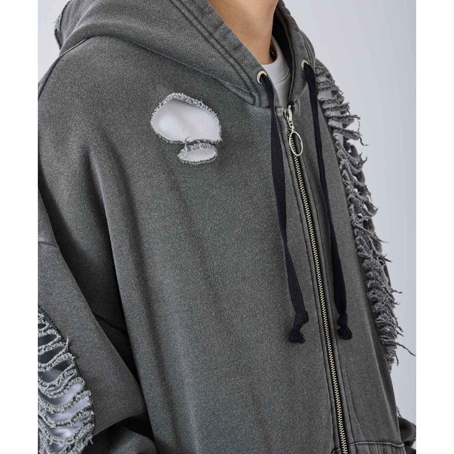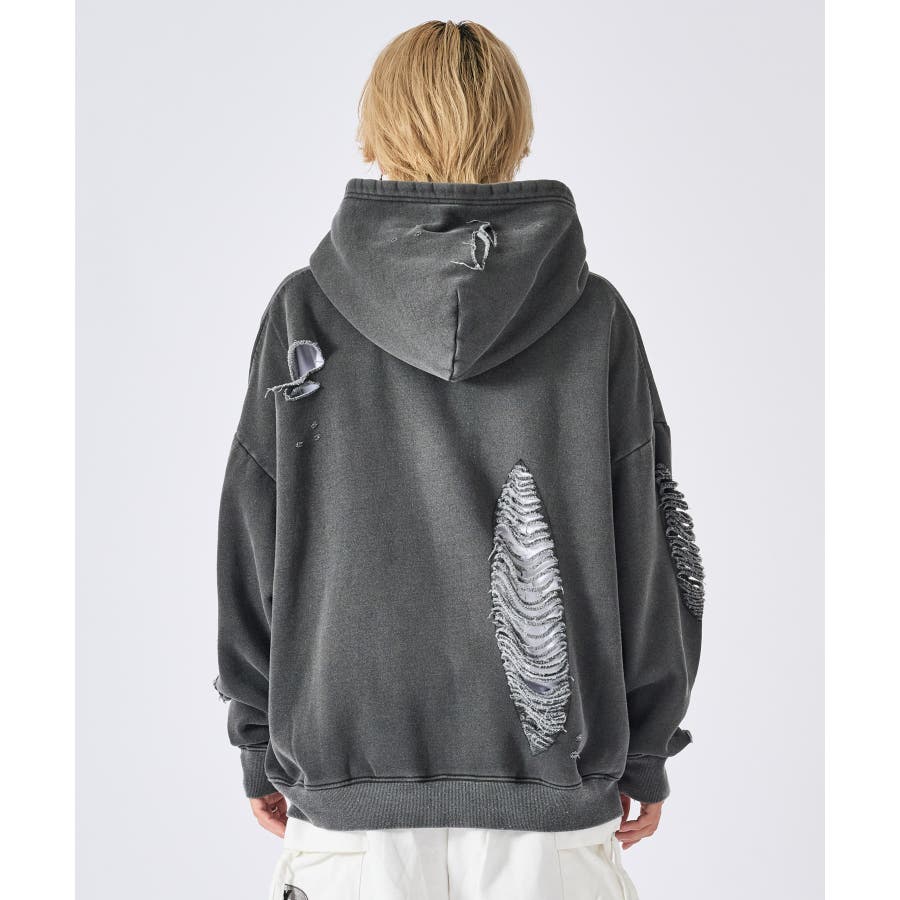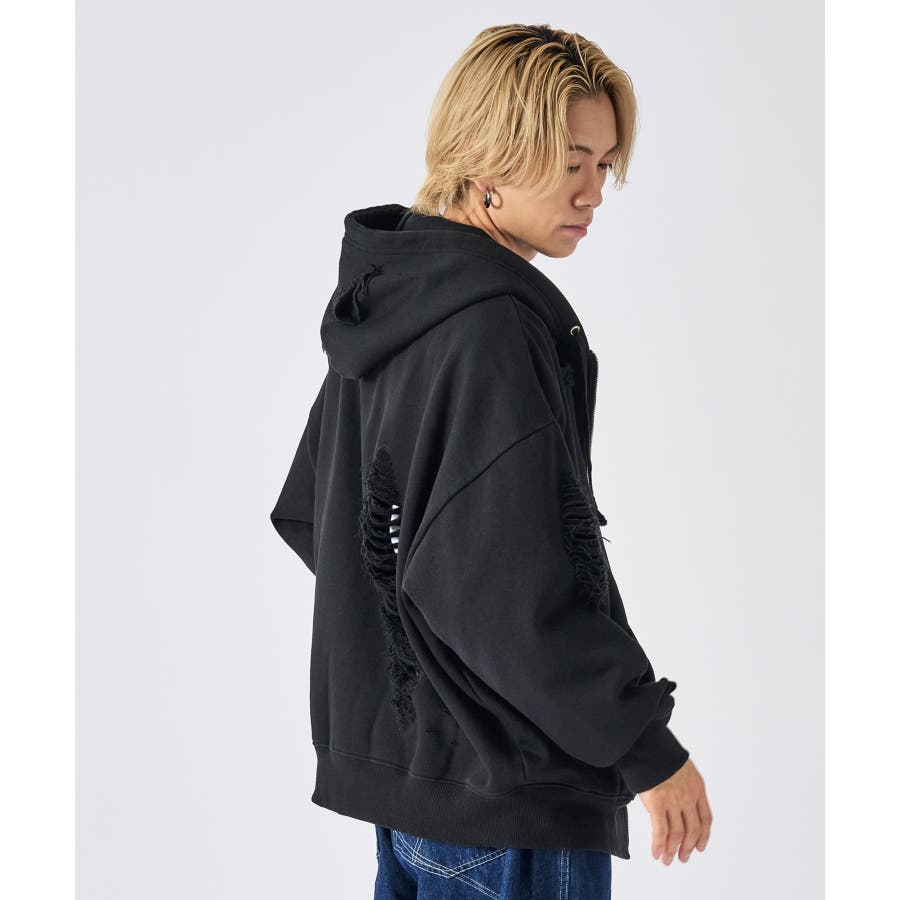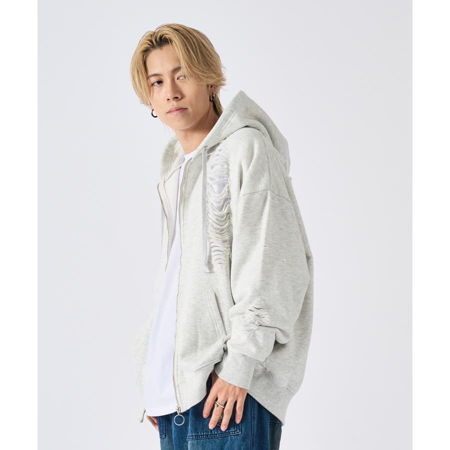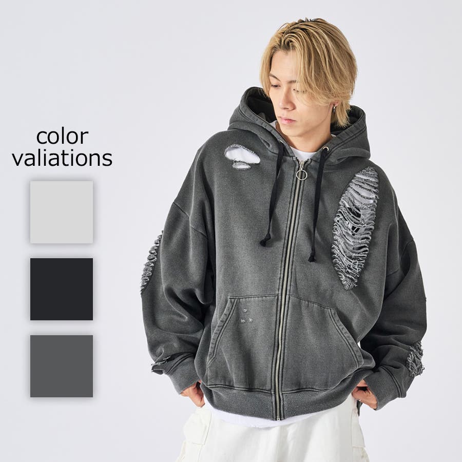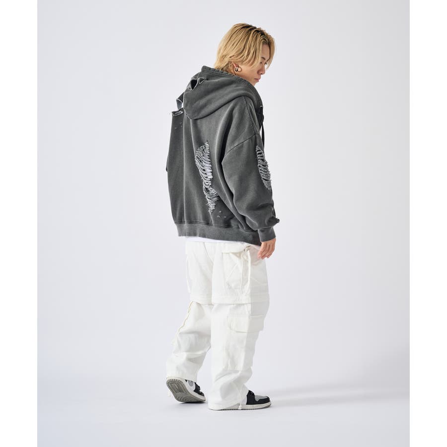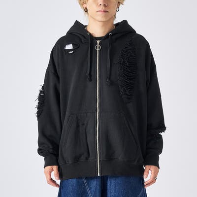 | グランジの雰囲気が漂うフルジップパーカー ■detail 前後左右、大小のダメージ加工を施し、着古した感のある色合いも渋い ポケットに配置したアイレットやレトロ感のあるファスナーが雰囲気を醸し出している ■fabric 裏起毛素材で温かく、ボリュームもあってライトアウターとして使えるアイテム ■styling 単体で存在感があるのでそれだけで様になりますが、モノトーンのロンTやTシャツなどインナーに合わせるとクールに着回せます | ||||||||||||||||||||