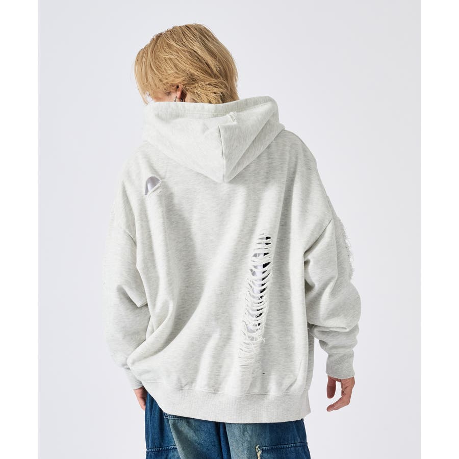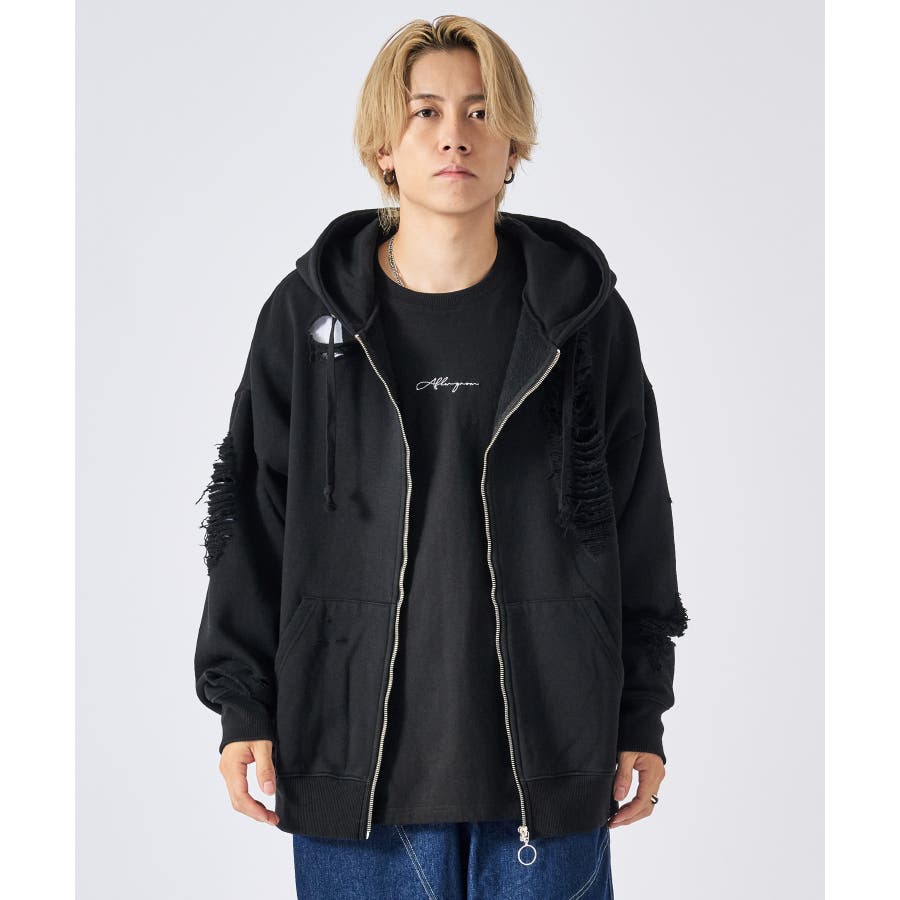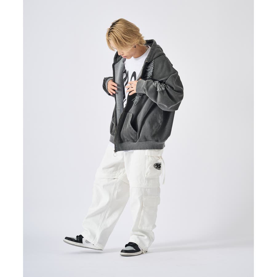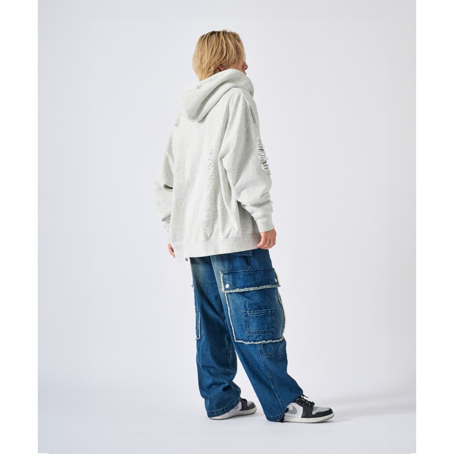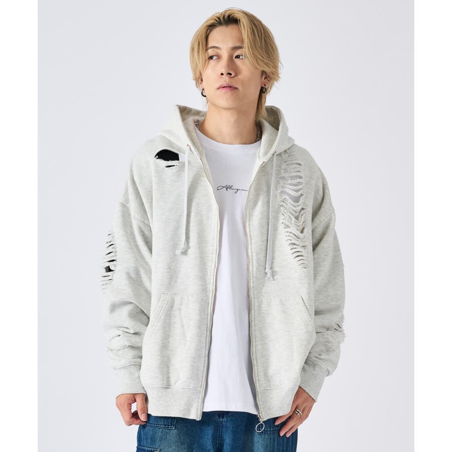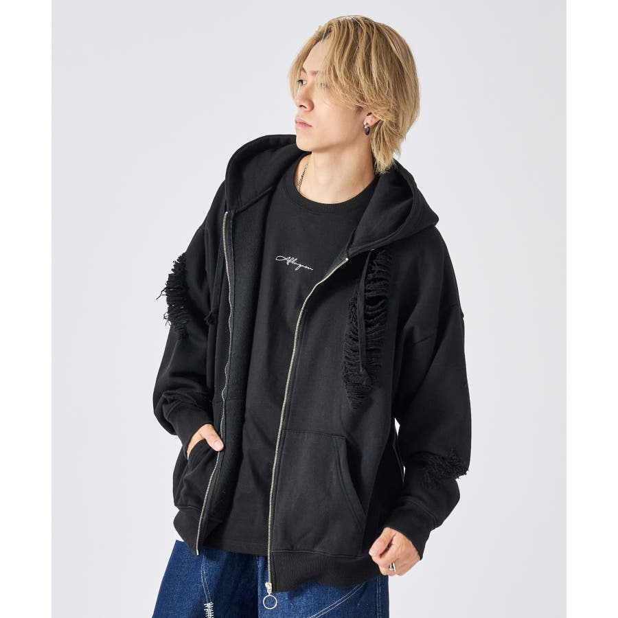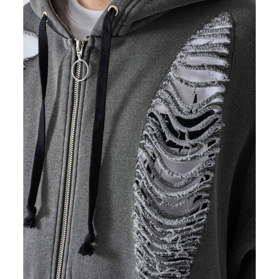 | グランジの雰囲気が漂うフルジップパーカー ■detail 前後左右、大小のダメージ加工を施し、着古した感のある色合いも渋い ポケットに配置したアイレットやレトロ感のあるファスナーが雰囲気を醸し出している ■fabric 裏起毛素材で温かく、ボリュームもあってライトアウターとして使えるアイテム ■styling 単体で存在感があるのでそれだけで様になりますが、モノトーンのロンTやTシャツなどインナーに合わせるとクールに着回せます | ||||||||||||||||||||