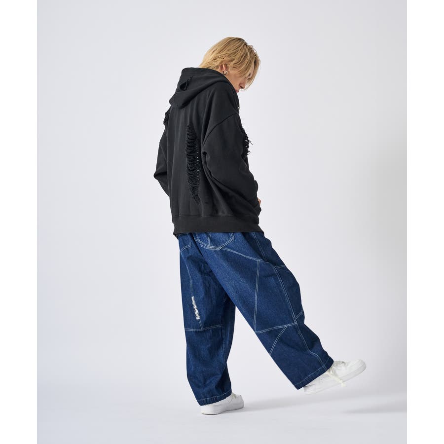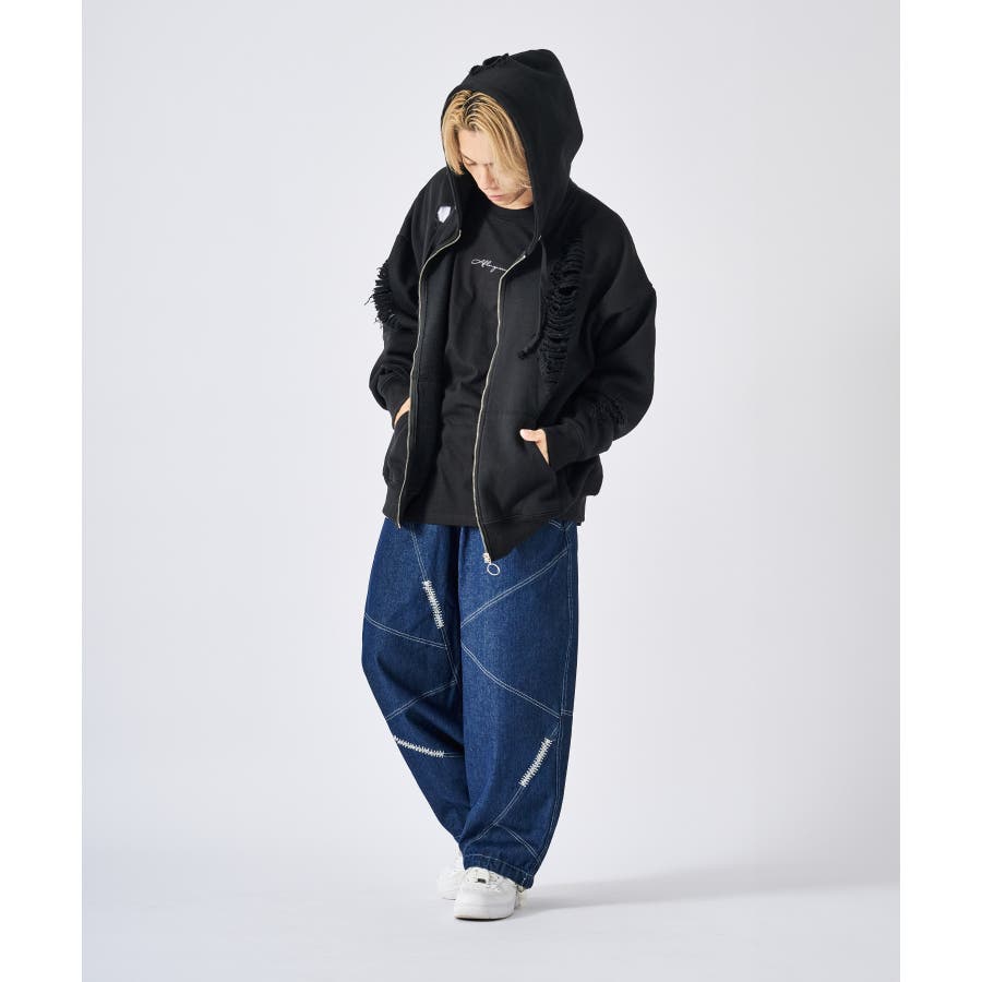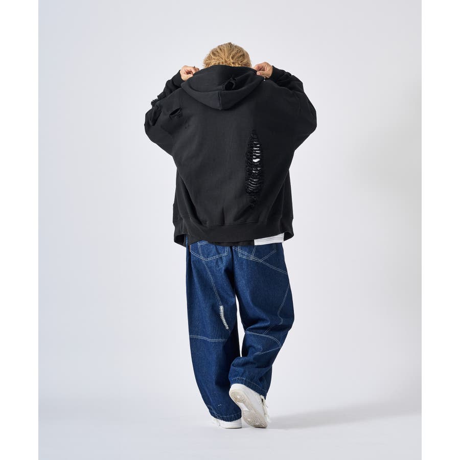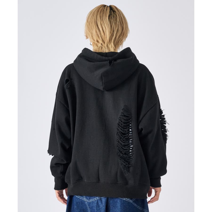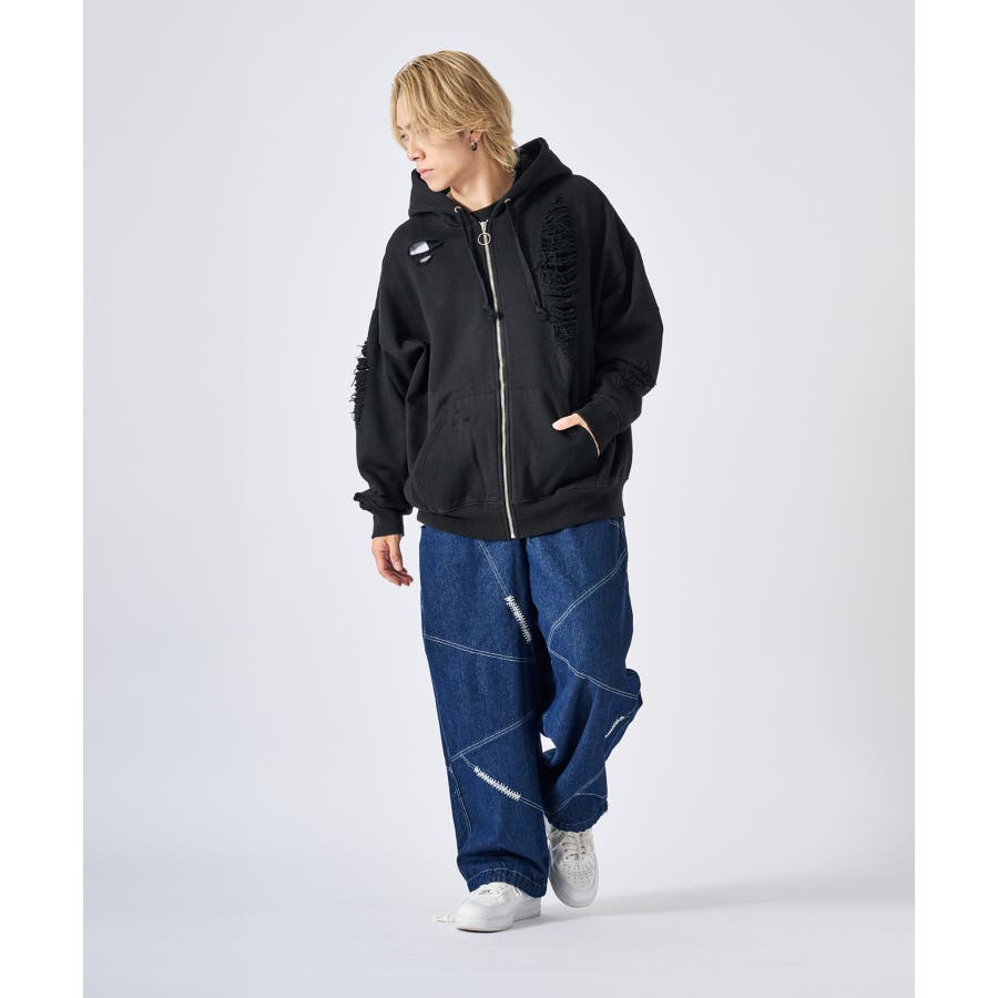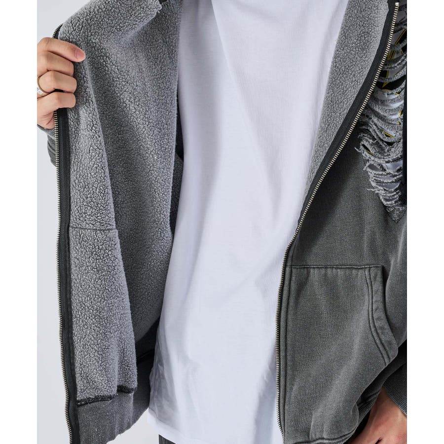 | グランジの雰囲気が漂うフルジップパーカー ■detail 前後左右、大小のダメージ加工を施し、着古した感のある色合いも渋い ポケットに配置したアイレットやレトロ感のあるファスナーが雰囲気を醸し出している ■fabric 裏起毛素材で温かく、ボリュームもあってライトアウターとして使えるアイテム ■styling 単体で存在感があるのでそれだけで様になりますが、モノトーンのロンTやTシャツなどインナーに合わせるとクールに着回せます | ||||||||||||||||||||