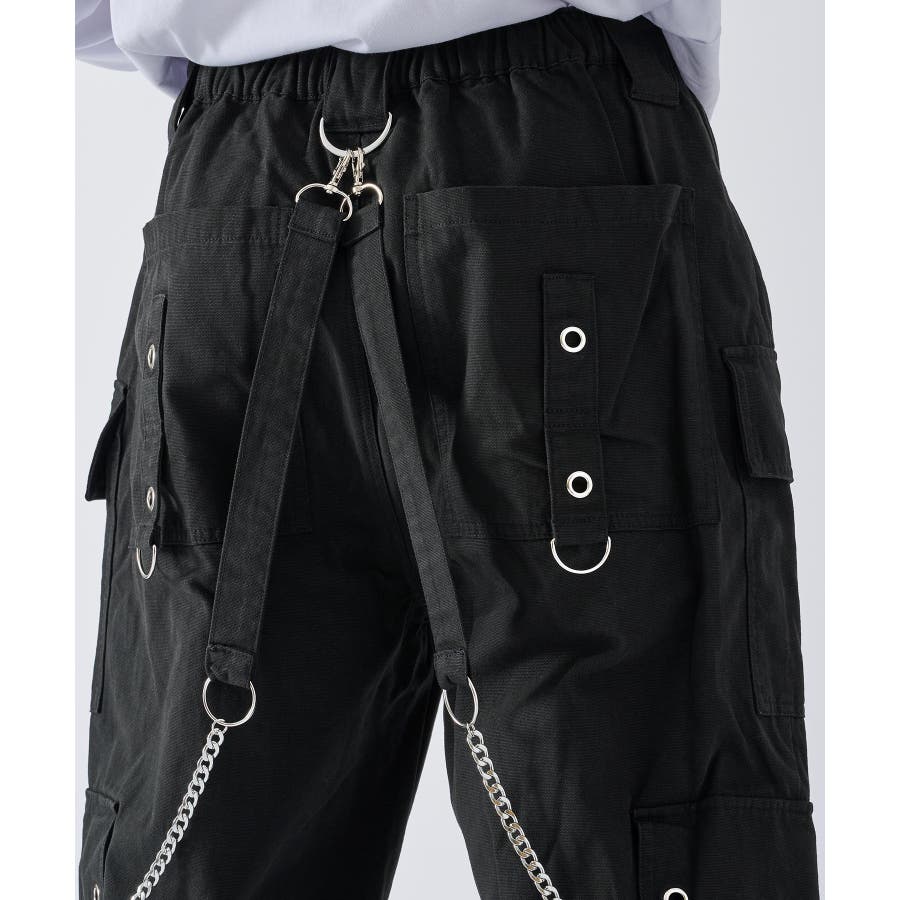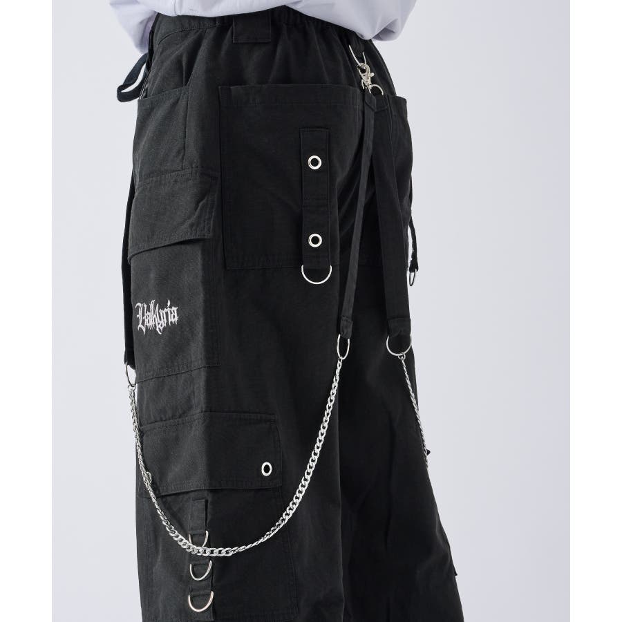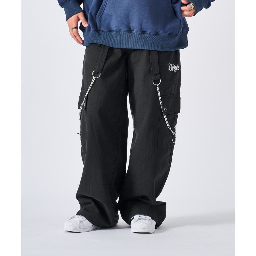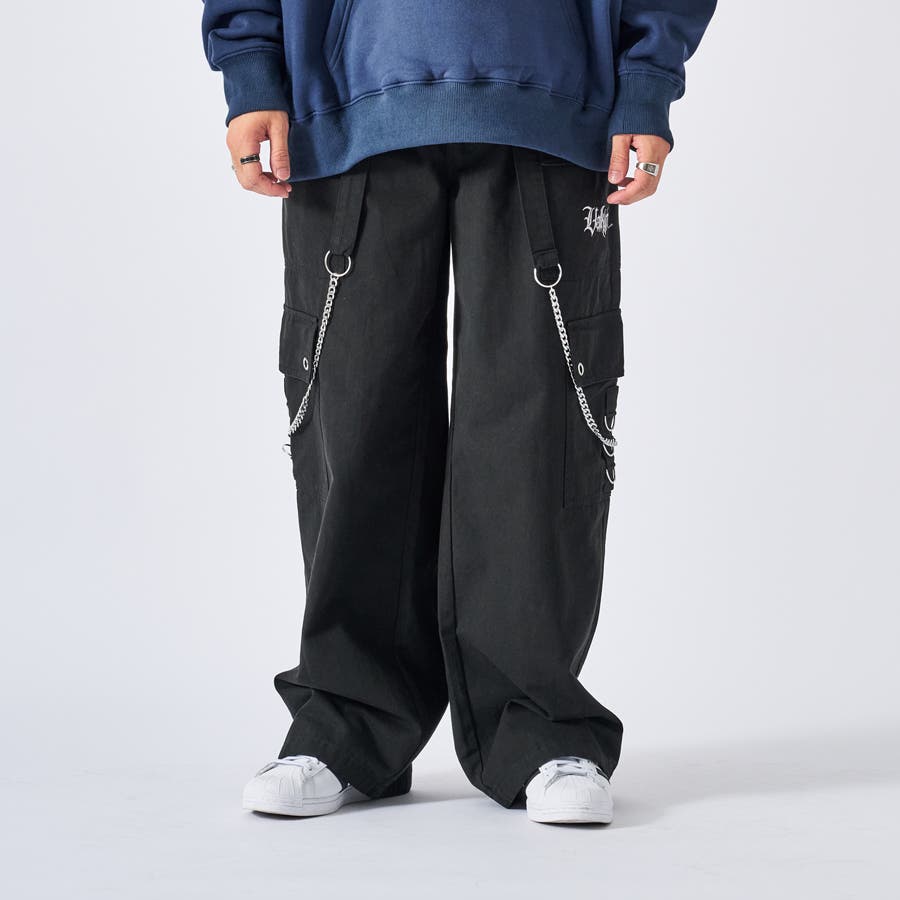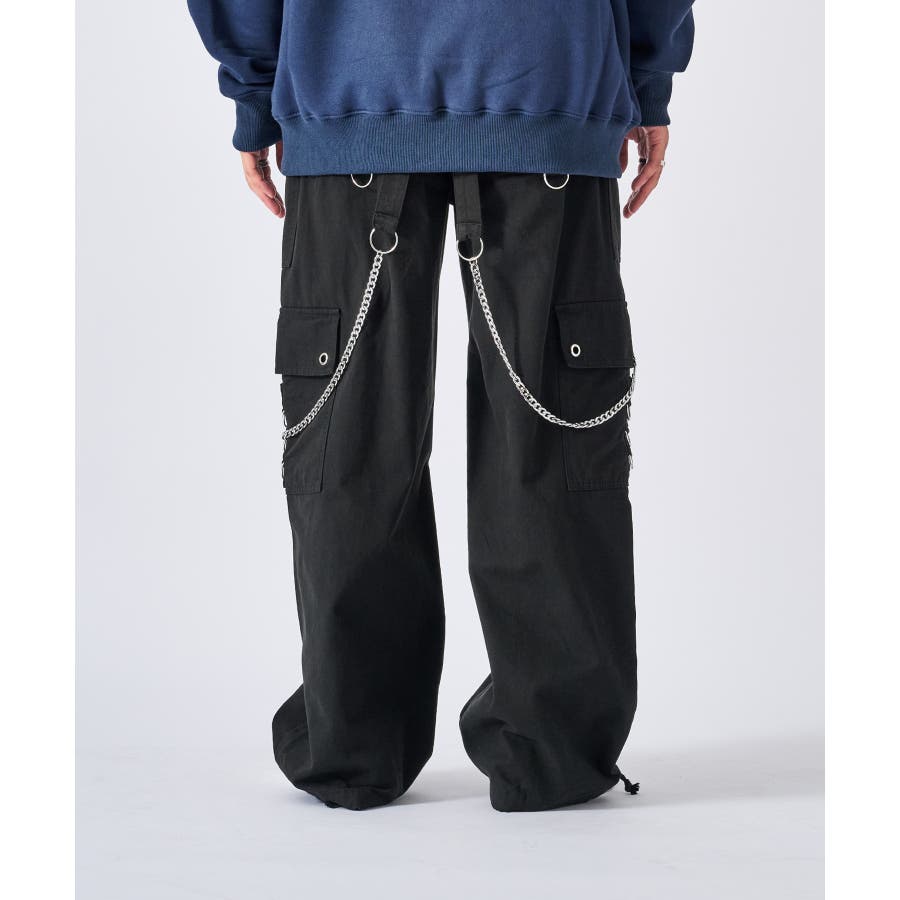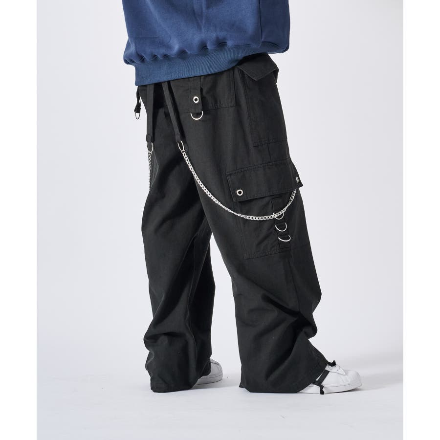 | チェーンが付属したバギーシルエットのカーゴパンツ ■detail 着脱できるチェーンはアクセサリーとして付け方を楽しめるデザイン バギータイプのワイドシルエットで、腰位置にもフラップポケットを配置したダブルカーゴ仕様 ウエストはシャーリングとドローコードでサイズを調整できる ■fabric ダック生地を使用したソリッドブラックと、デニムのケミカル加工をした2色のブラックをラインナップ ■styling ストリートスタイルのマストアイテムとしてユニセックスに着用できるデザインです | ||||||||||||||||||||