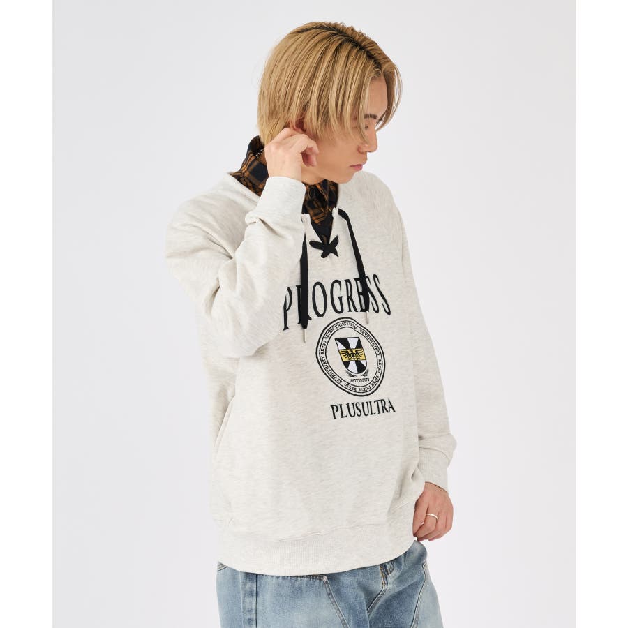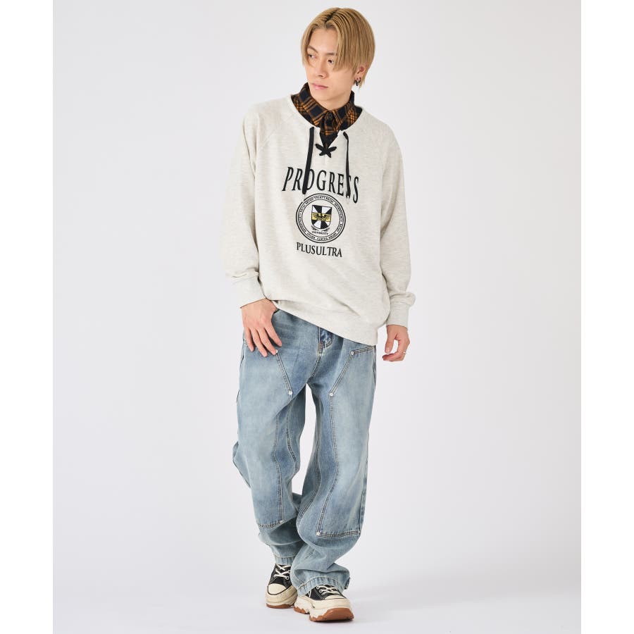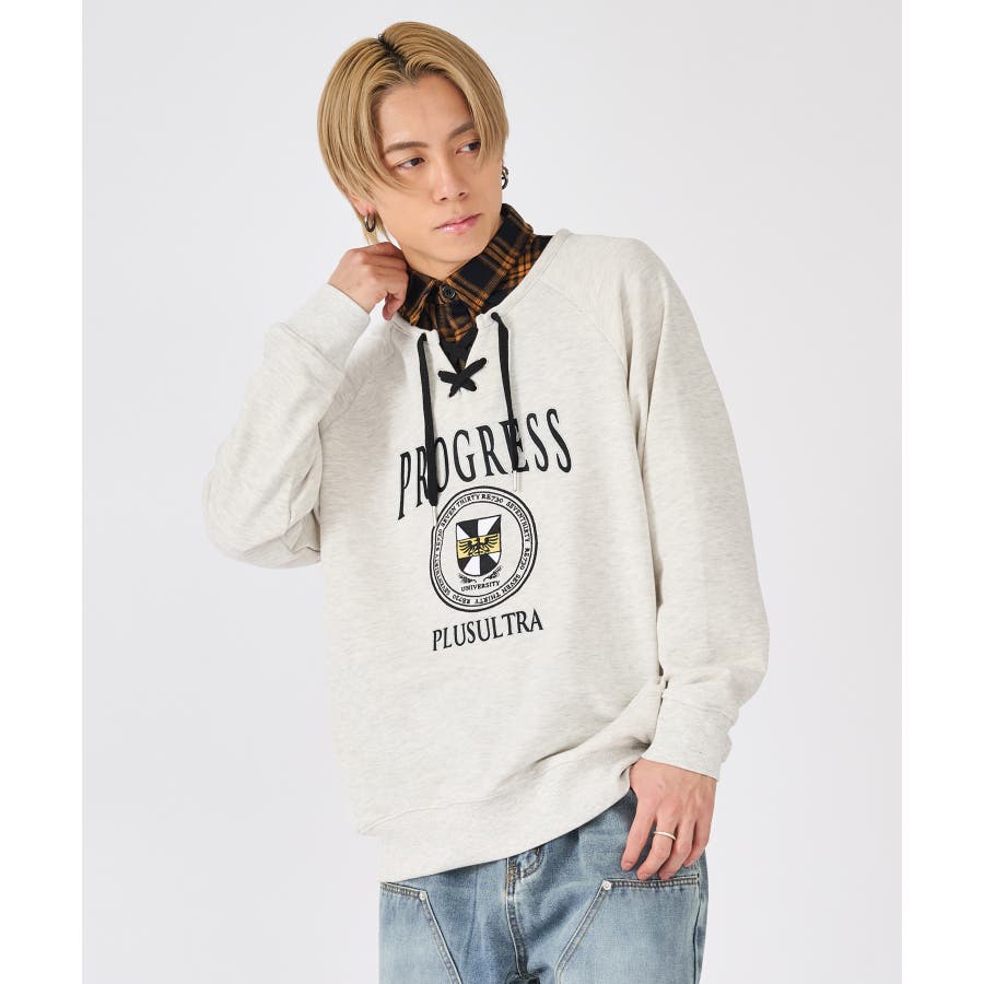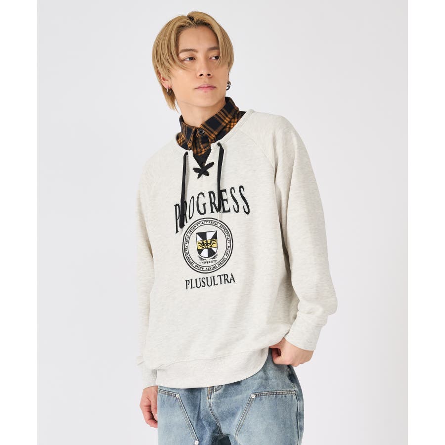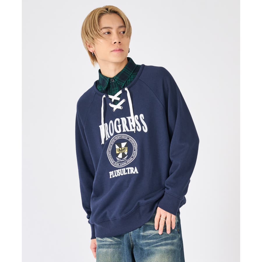 ちらっと見えるチェックシャツとレイヤードした様な可愛い仕様のトレーナーです♪ ■detail レースアップでトレーナーは珍しく新鮮でフロントのロゴは全部刺繍なんです!! レトロ感もあってオーバーサイズにも着用できるのでさらっと着るだけで大活躍です☆ ■fabric 一般的なトレーナーとして知られる裏毛生地ですが、ポリエステルとコットン生地でやや軽めで楽ちんです☆ ■styling ボトムはスキニーからワイドまで、そしてデニムやカーゴパンツは勿論、スラックスやスカートで合わせる事もできて、カジュアルや古着っぽく着用でき色んな楽しみ方のできるアイテムです(^^) | ||||||||||||||||