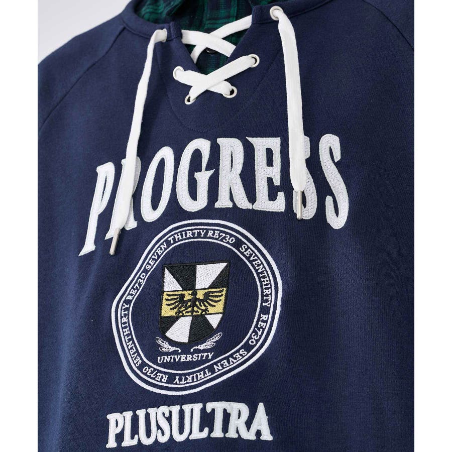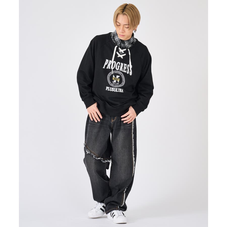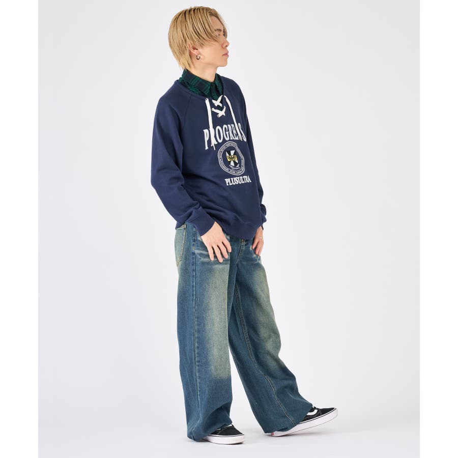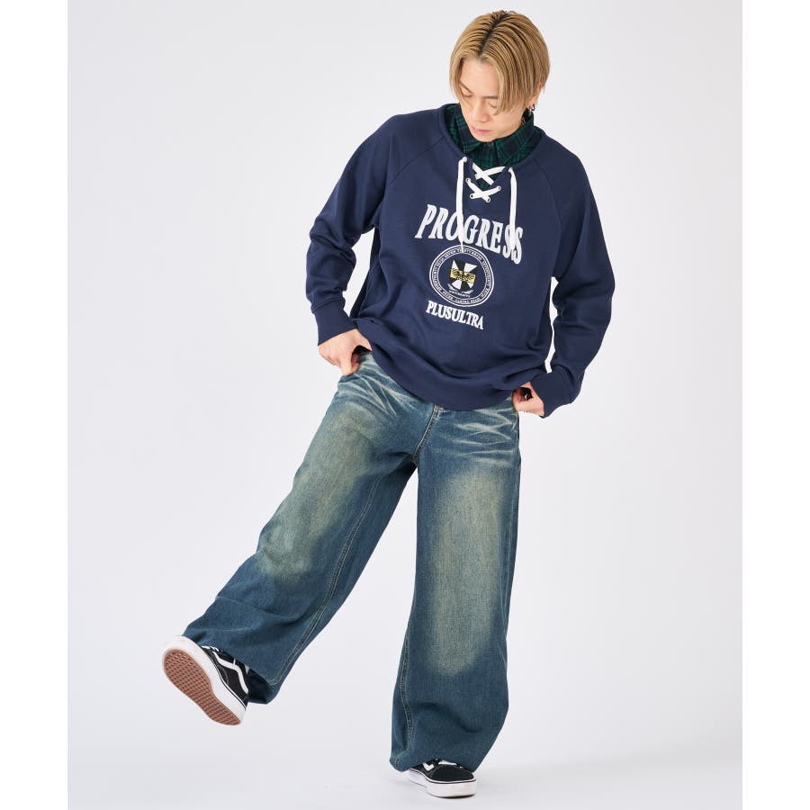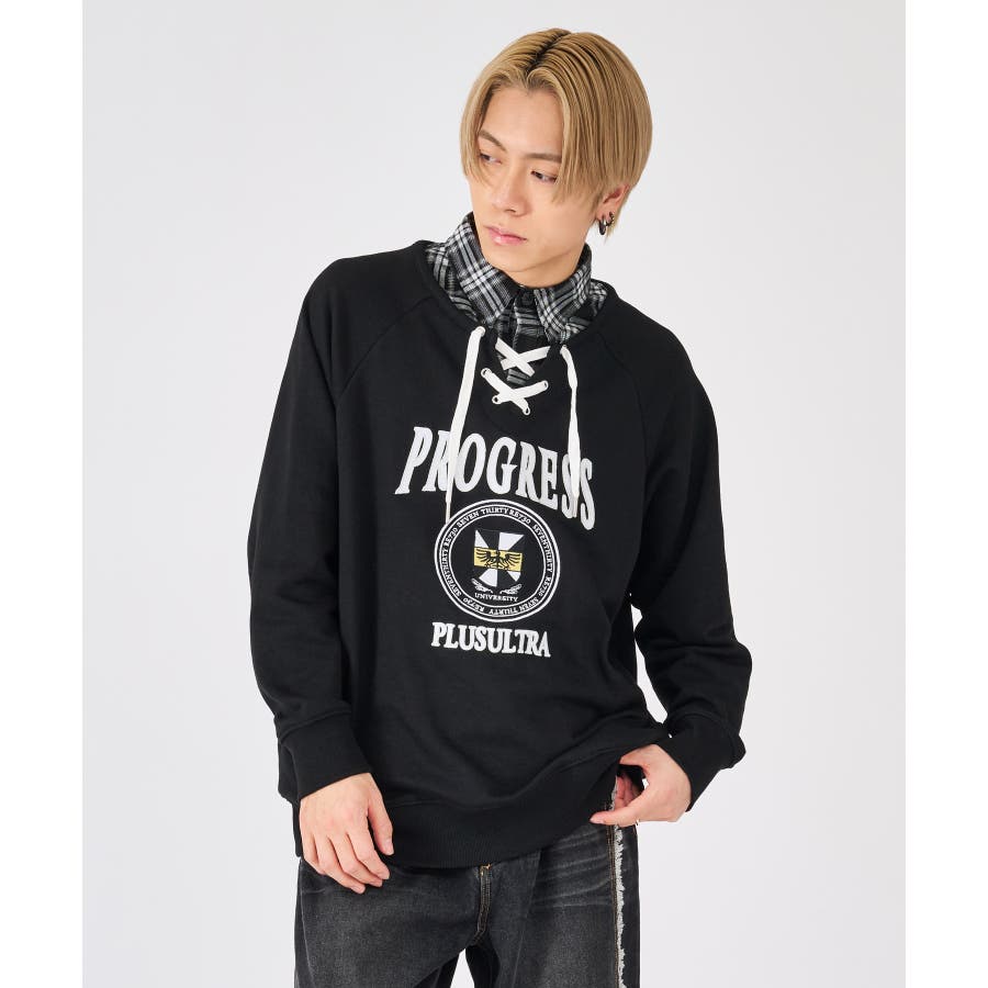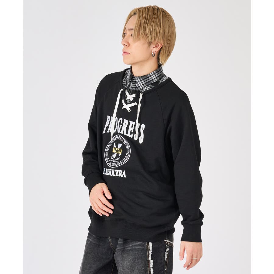 ちらっと見えるチェックシャツとレイヤードした様な可愛い仕様のトレーナーです♪ ■detail レースアップでトレーナーは珍しく新鮮でフロントのロゴは全部刺繍なんです!! レトロ感もあってオーバーサイズにも着用できるのでさらっと着るだけで大活躍です☆ ■fabric 一般的なトレーナーとして知られる裏毛生地ですが、ポリエステルとコットン生地でやや軽めで楽ちんです☆ ■styling ボトムはスキニーからワイドまで、そしてデニムやカーゴパンツは勿論、スラックスやスカートで合わせる事もできて、カジュアルや古着っぽく着用でき色んな楽しみ方のできるアイテムです(^^) | ||||||||||||||||