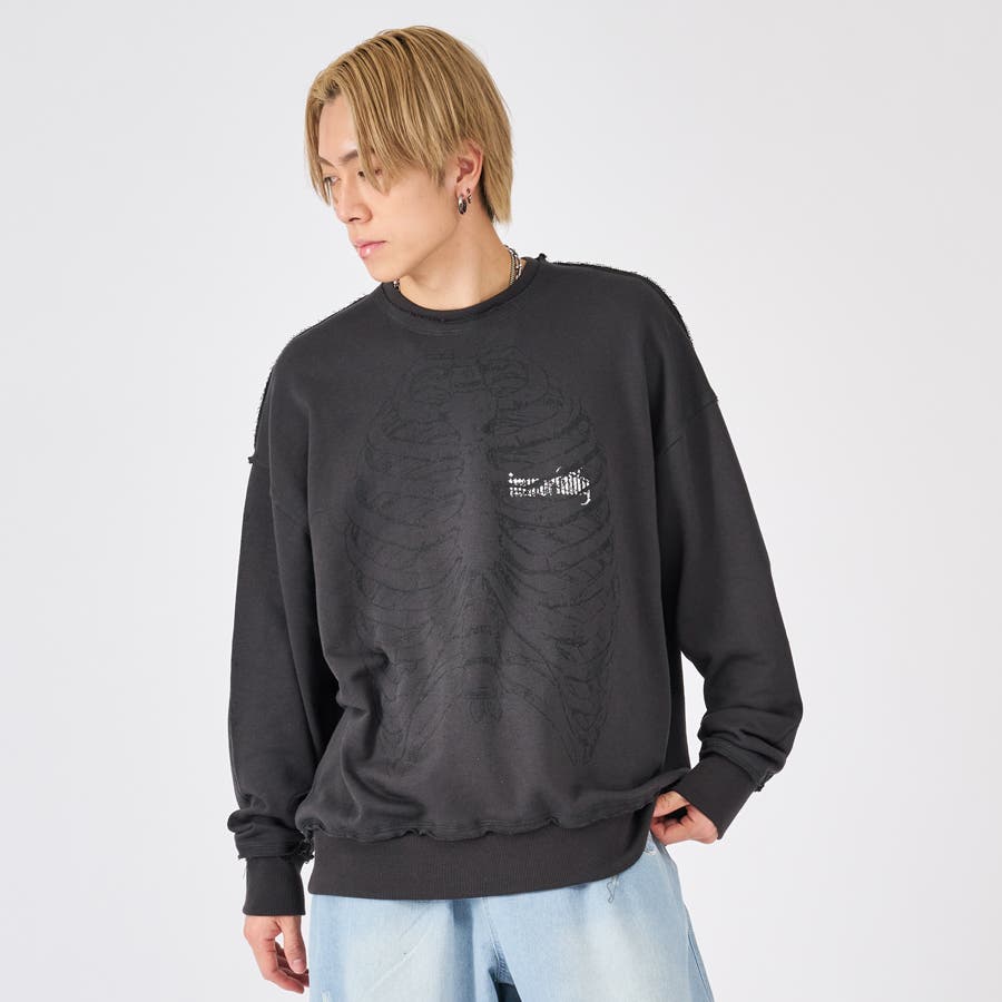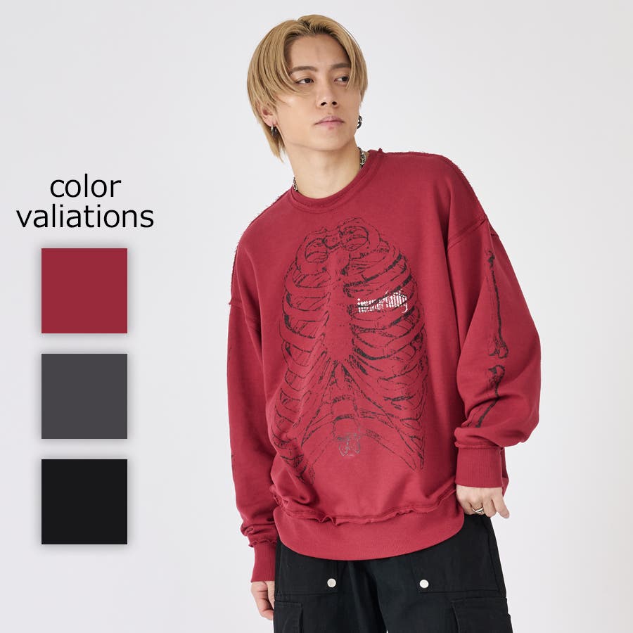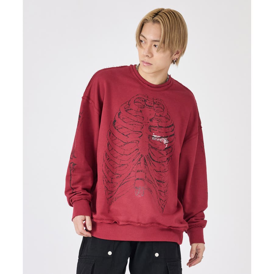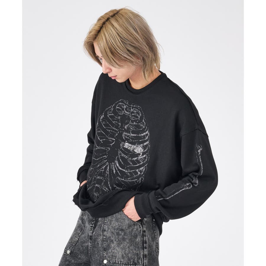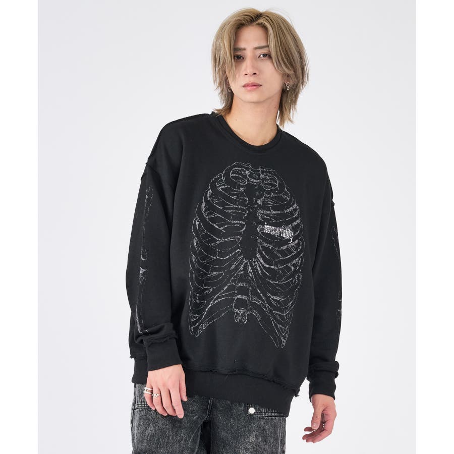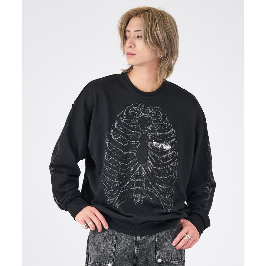 肋骨のプリントがされたドクロトレーナーです☆ ■detail フロントはレントゲンの様な肋骨のプリントで、アクセントでワンポイントの掠れロゴプリント、袖には腕の骨のプリントを施しております! 首周りや袖つけ、リブ部分など縫い合わせる部分は縫い代を表に出したデザインが新しいです♪ ■fabric ビンテージ感ある裏毛素材を使用し、褪せた色合いも雰囲気がありかっこいいです! ■styling 色落ちしたデニムとの相性がピッタリで、カーゴパンツやスカートとの相性も抜群です☆ | ||||||||||||||||||||