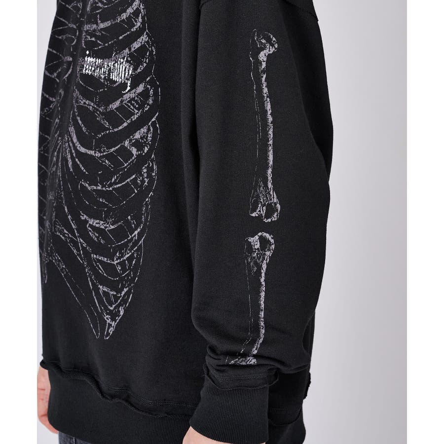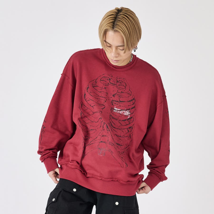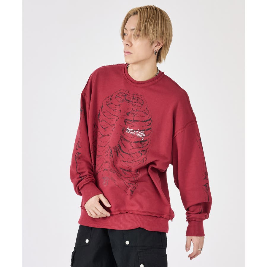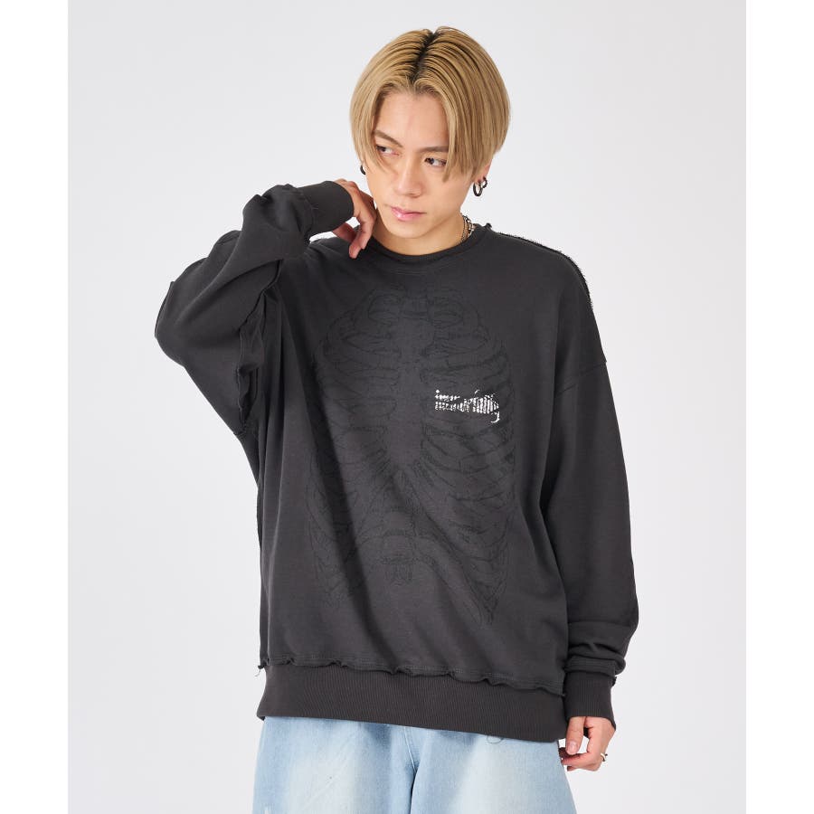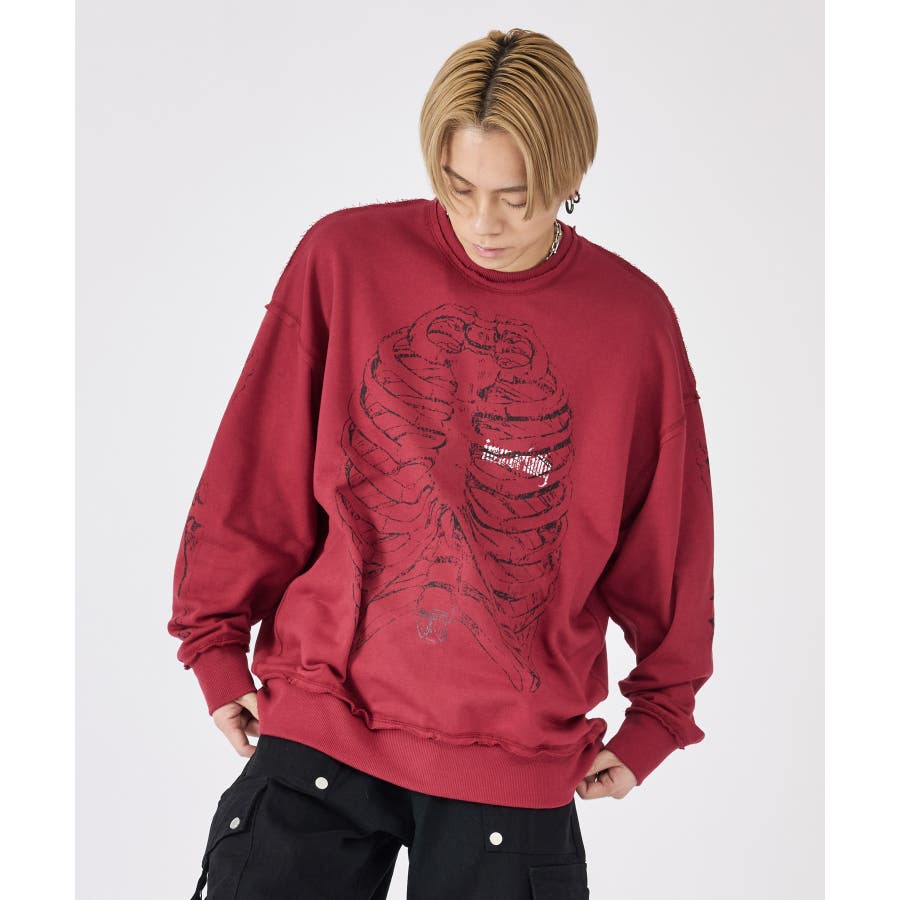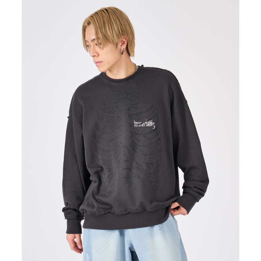 肋骨のプリントがされたドクロトレーナーです☆ ■detail フロントはレントゲンの様な肋骨のプリントで、アクセントでワンポイントの掠れロゴプリント、袖には腕の骨のプリントを施しております! 首周りや袖つけ、リブ部分など縫い合わせる部分は縫い代を表に出したデザインが新しいです♪ ■fabric ビンテージ感ある裏毛素材を使用し、褪せた色合いも雰囲気がありかっこいいです! ■styling 色落ちしたデニムとの相性がピッタリで、カーゴパンツやスカートとの相性も抜群です☆ | ||||||||||||||||||||