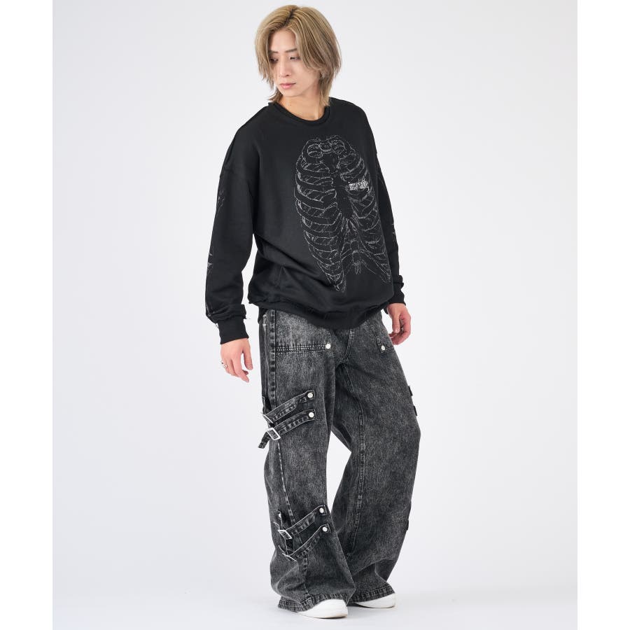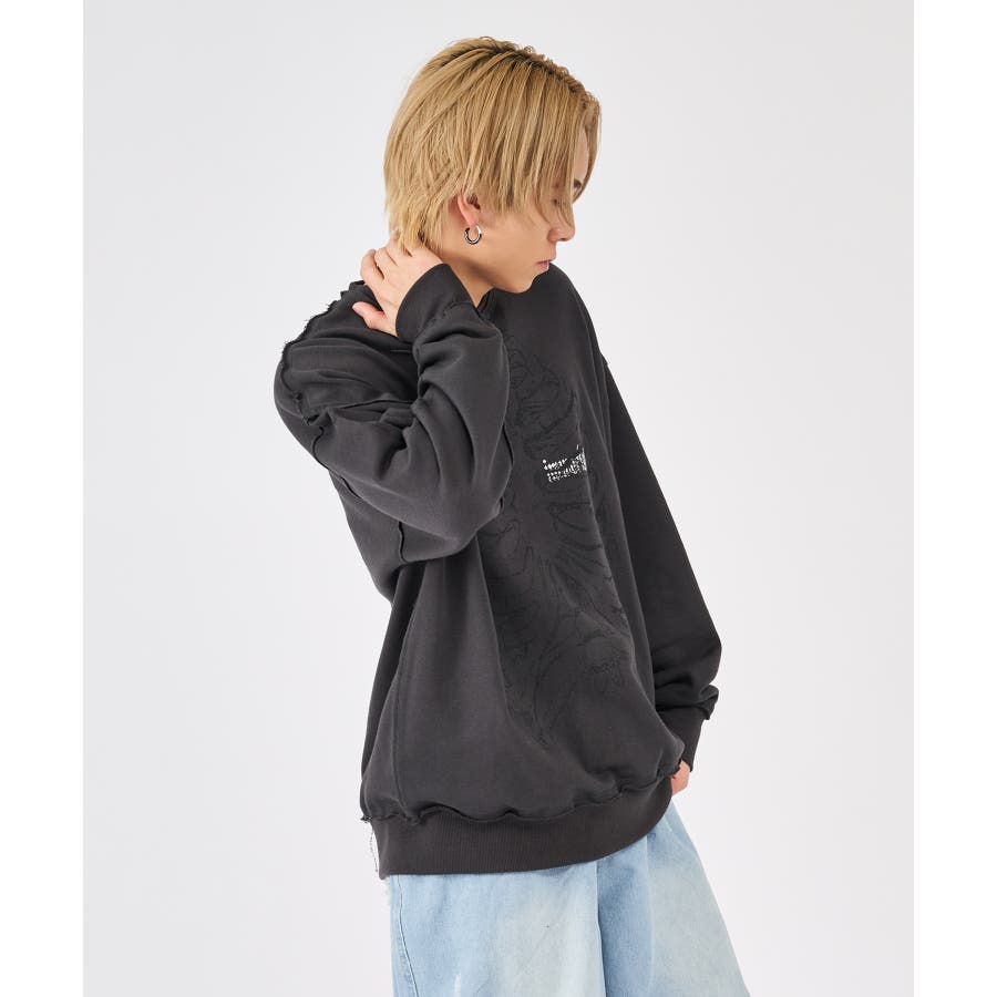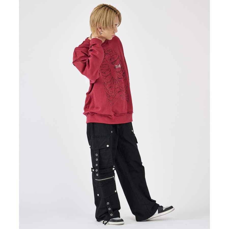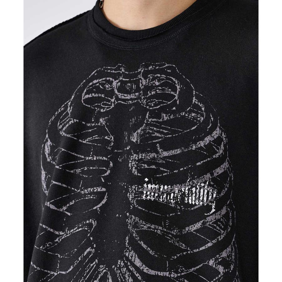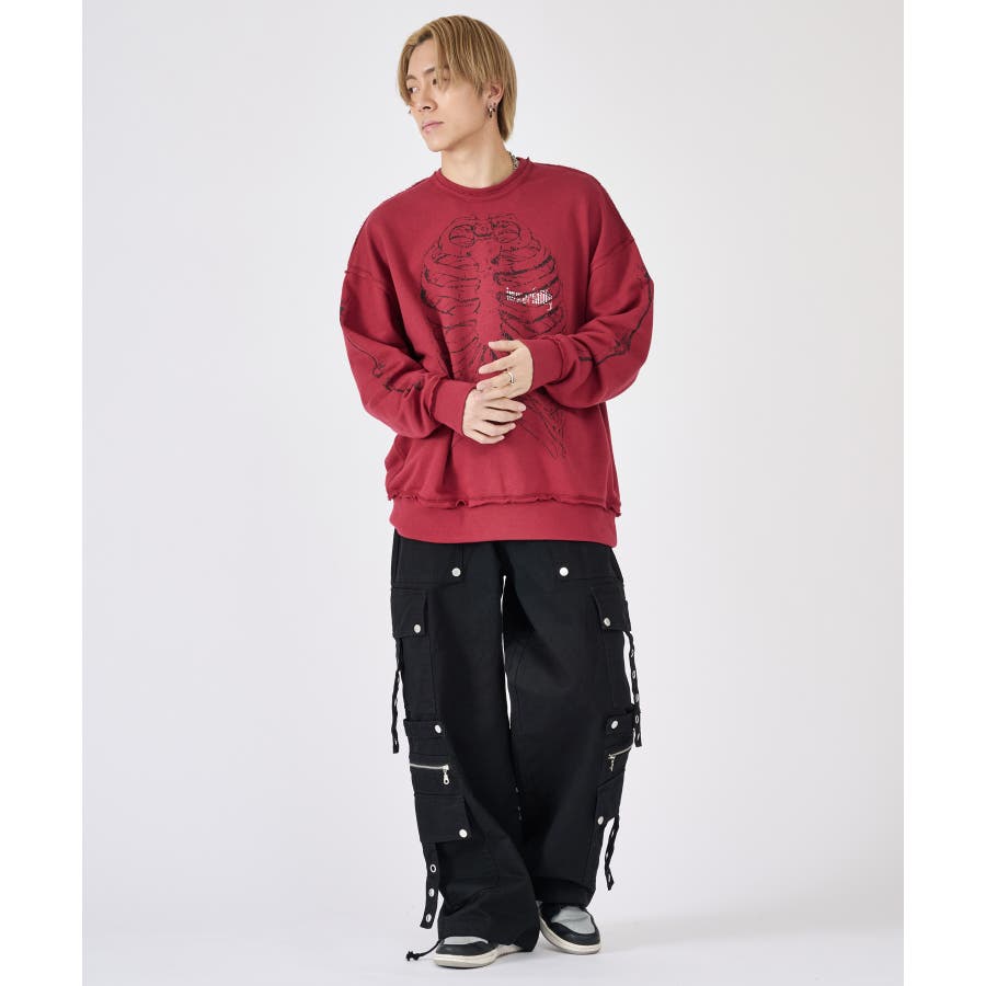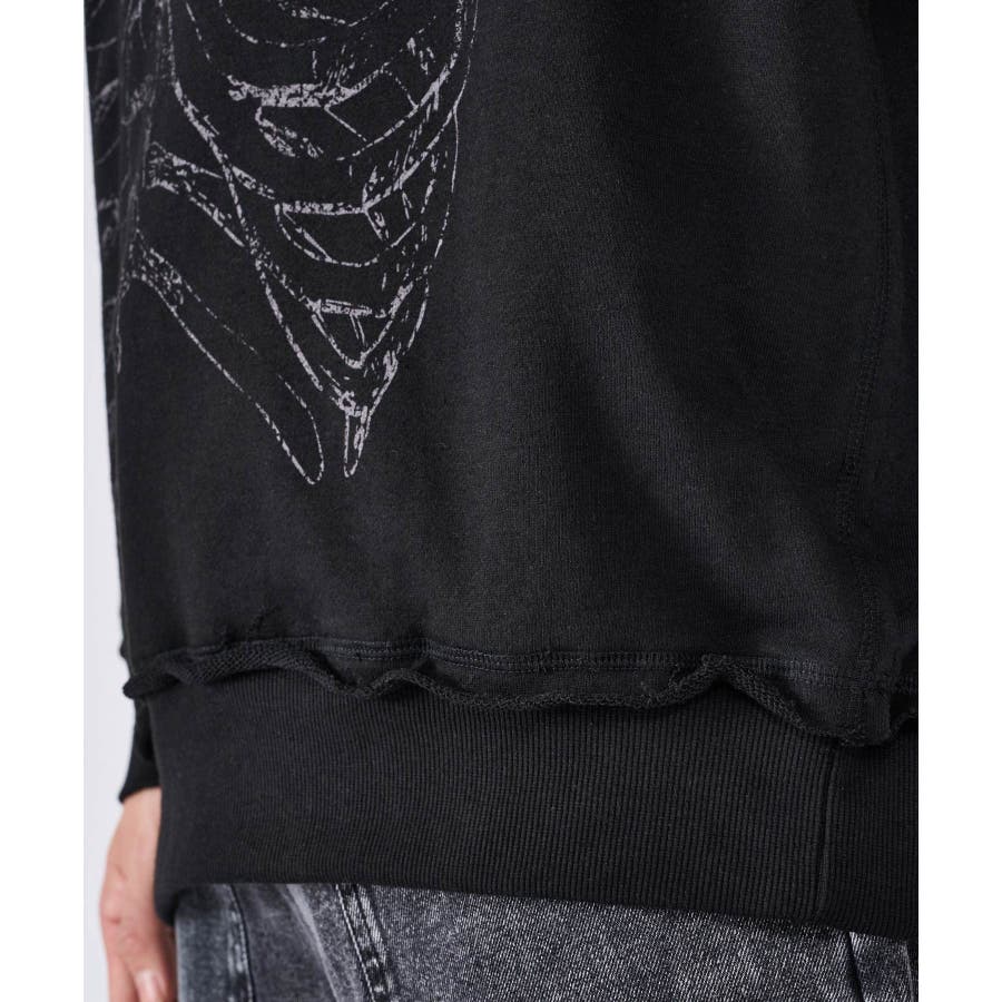 肋骨のプリントがされたドクロトレーナーです☆ ■detail フロントはレントゲンの様な肋骨のプリントで、アクセントでワンポイントの掠れロゴプリント、袖には腕の骨のプリントを施しております! 首周りや袖つけ、リブ部分など縫い合わせる部分は縫い代を表に出したデザインが新しいです♪ ■fabric ビンテージ感ある裏毛素材を使用し、褪せた色合いも雰囲気がありかっこいいです! ■styling 色落ちしたデニムとの相性がピッタリで、カーゴパンツやスカートとの相性も抜群です☆ | ||||||||||||||||||||