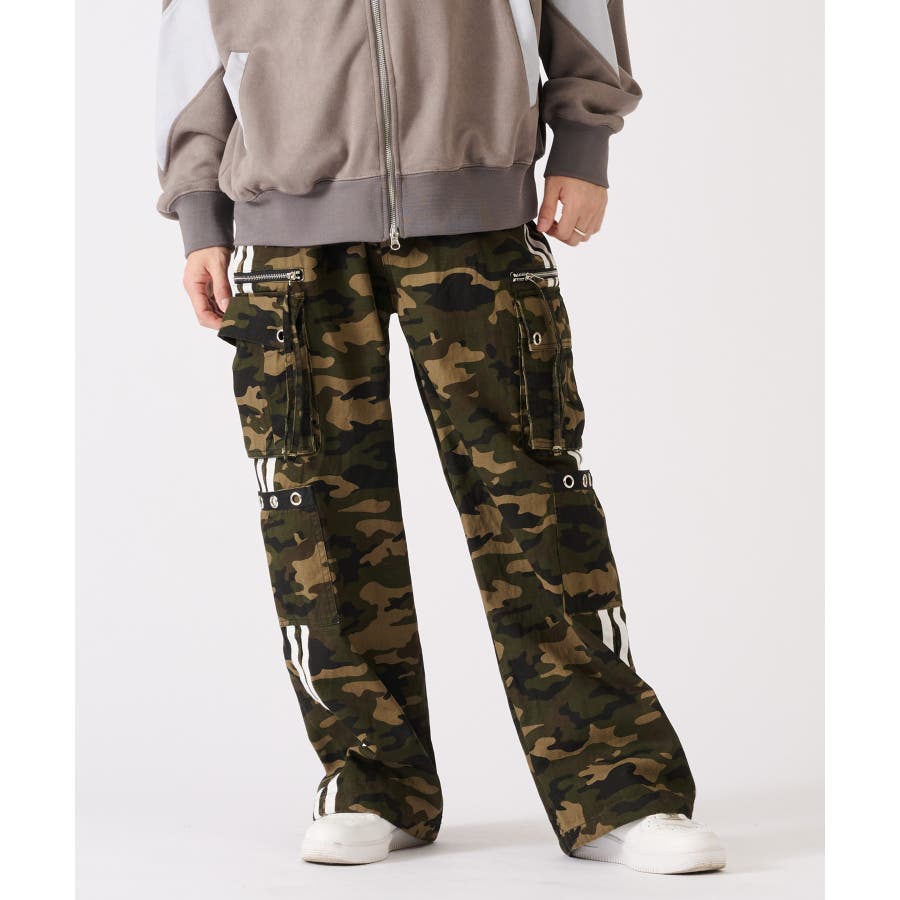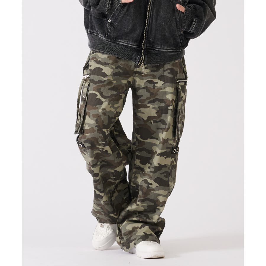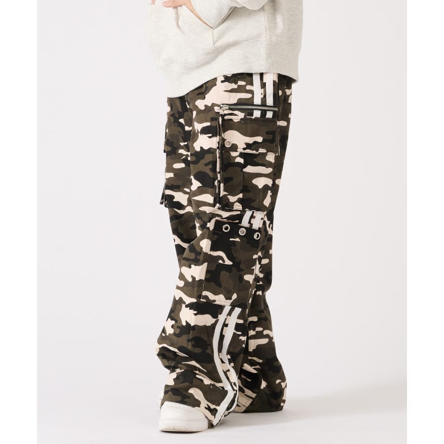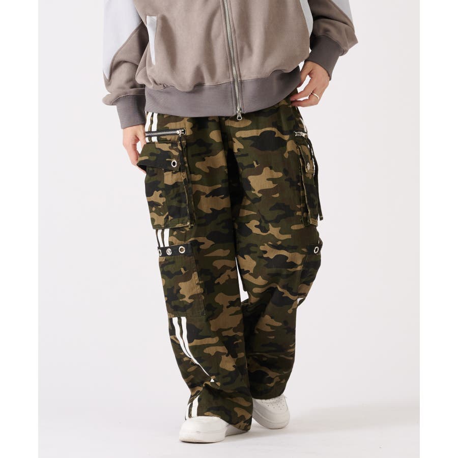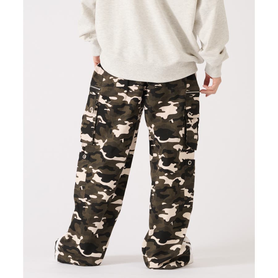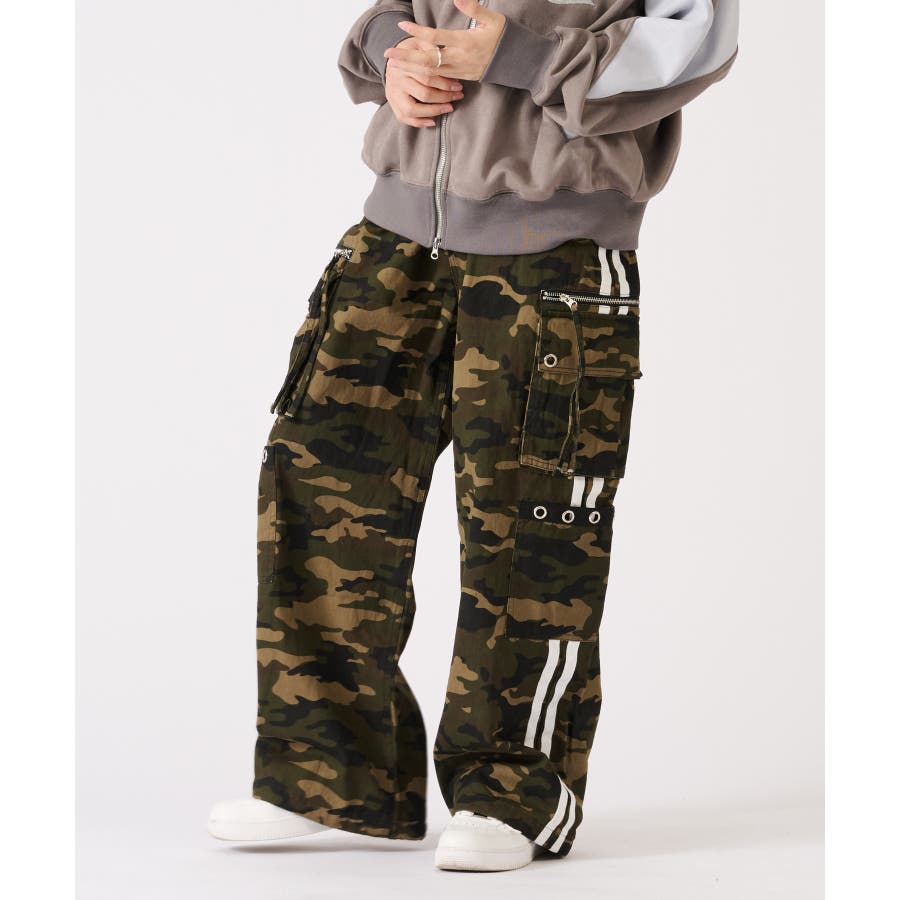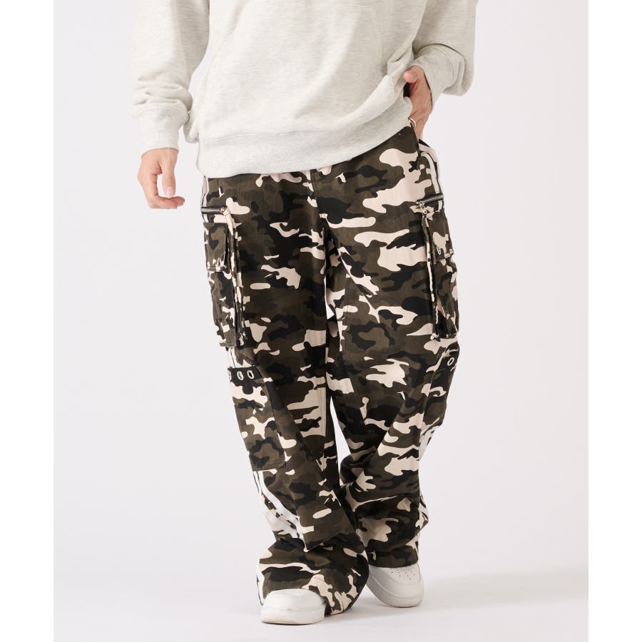 ワイドシルエットのカモフラパンツ☆ ■detail カーゴポケットは左右上下に2つずつ配置され、一段目のカーゴポケットの上にもファスナーポケットを配置、更には腰のサイドポケットとバックの立体的なポケットとたくさんあってサイズも大きめなのでポケットへの収納率は抜群です♪ サイドラインも可愛くスポーツ要素もあるので超万能☆ ウエストはバックがゴム仕様で男女問わず穿きやすく、裾のドローコードによって長さやシルエットの調整も可能なのでシルエットも楽しめます(^^) ■fabric オールシーズン着用できるコットン素材を使用し、3色のカモフラ柄をご用意☆ ■styling トレンド要素をミックスしたこのデザインは、色んなコーデと合わせやすく重宝します♪ 存在感あるアイテムなのでTシャツなどシンプルなトップスでも映えて、男女問わずユニセックスに着られるアイテムです | ||||||||||||||||||||