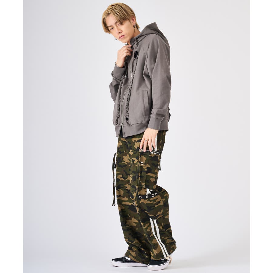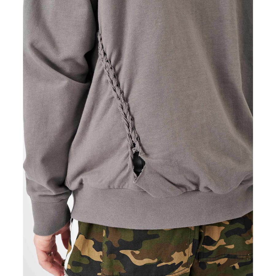 | 縄編みの様なデザインが印象的なジップパーカー☆ ■detail フロント2本、バックに1本施した縄編み状のデザインは、生地を直接編み込んだ独特のデザインで印象的♪ フロントのファスナーは上下から開閉できるダブルスライダー仕様になっており、襟元はハイネックのデザインで上まで閉めると小顔効果もある可愛いデザイン ■fabric コットン素材のスウェットですが、ミニ裏毛と言って一般的なスウェット素材よりも少し肉薄の軽めな素材! この素材感は意外に出回ってなく、半袖の上に羽織るには丁度いい(^^♪ かすれた色合いや、洗いのかかったヴィンテージ感あるラフな感じも印象的☆彡 ■styling カーゴパンツなどミリタリーなアイテムや、色落ち感のあるデニムパンツにおすすめなアイテムです♪ | ||||||||||||||||||||
