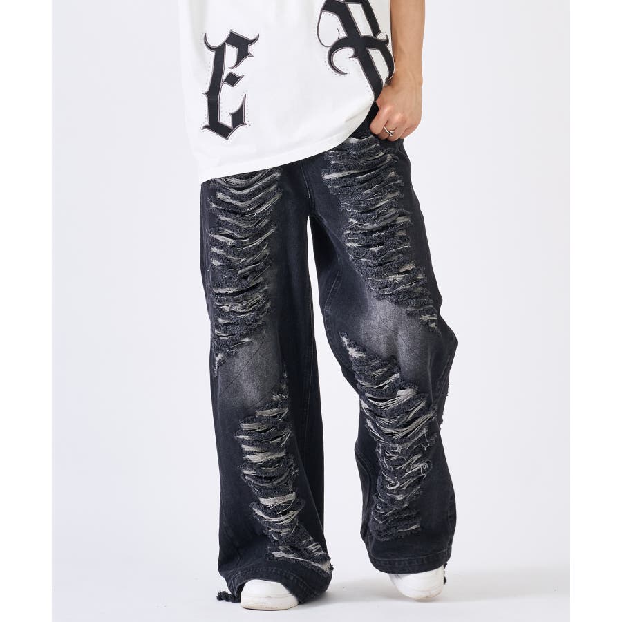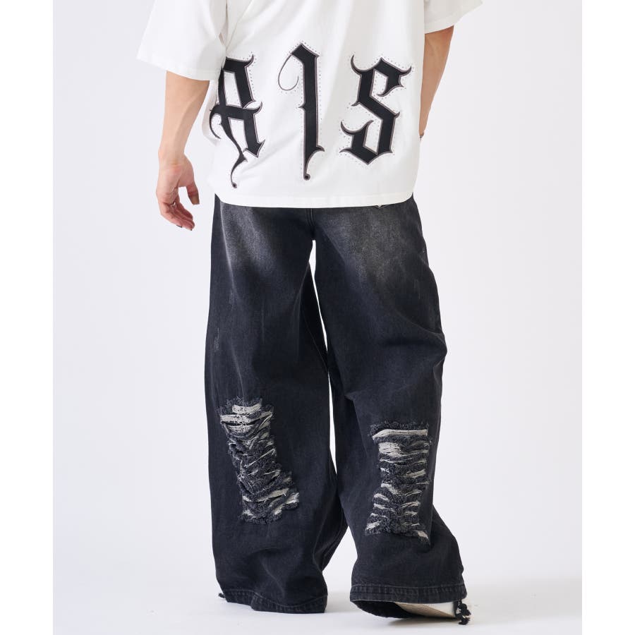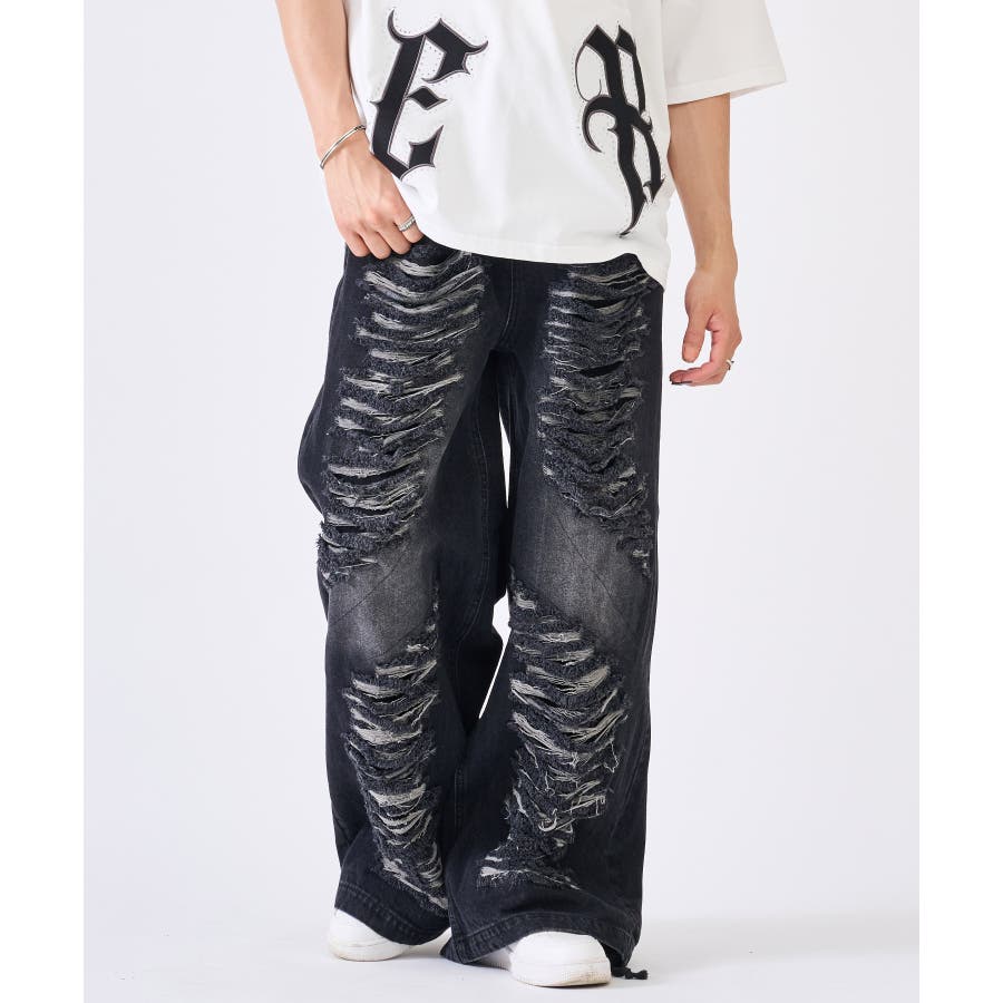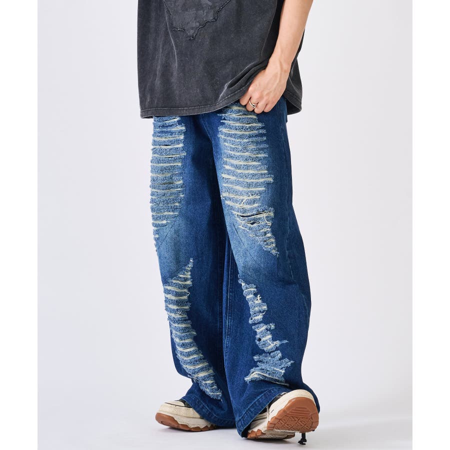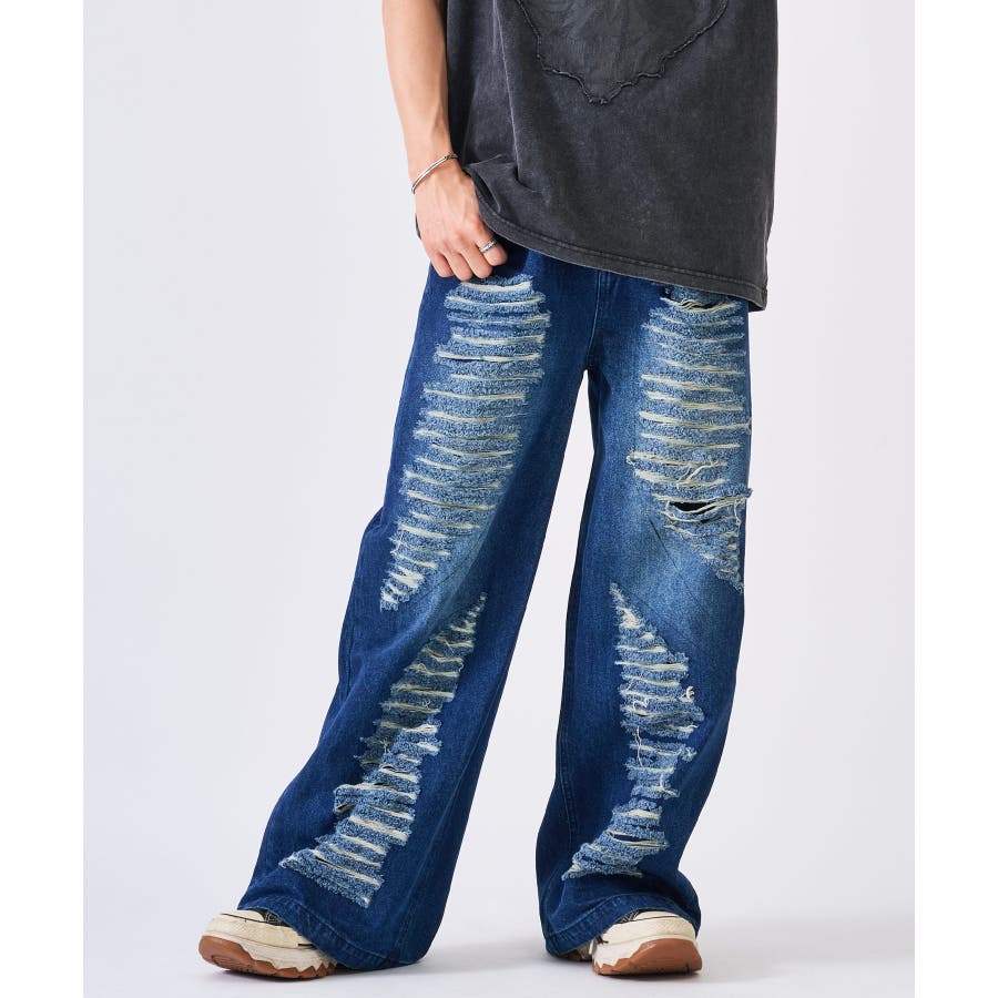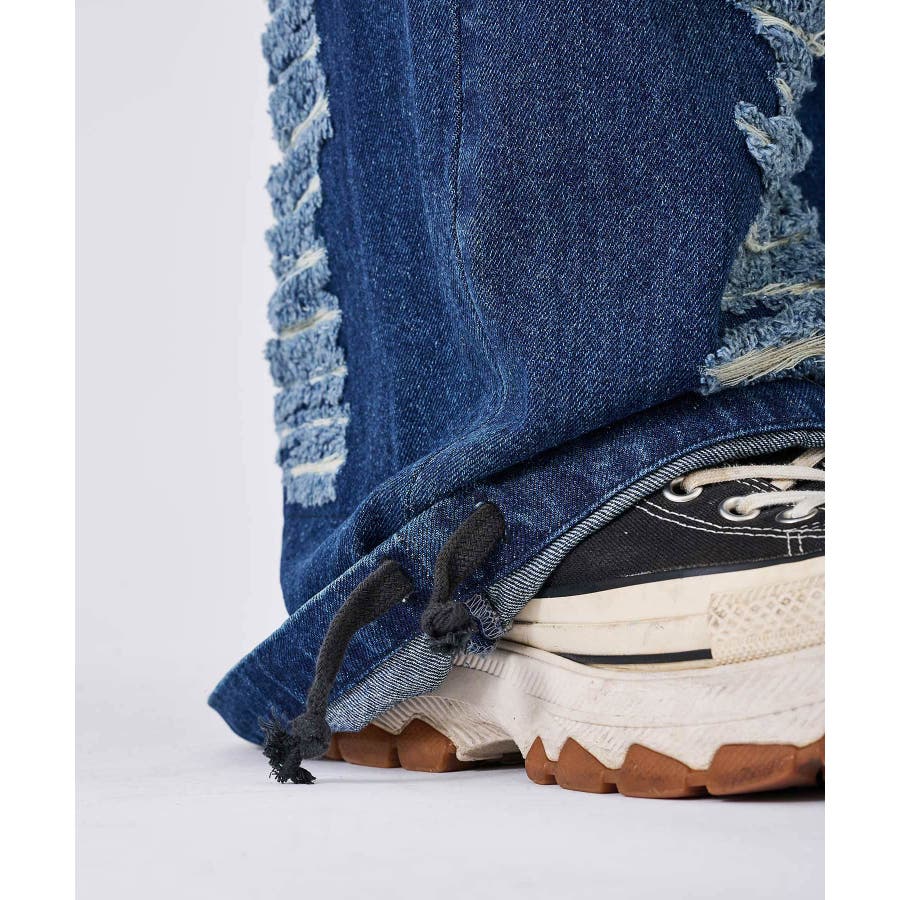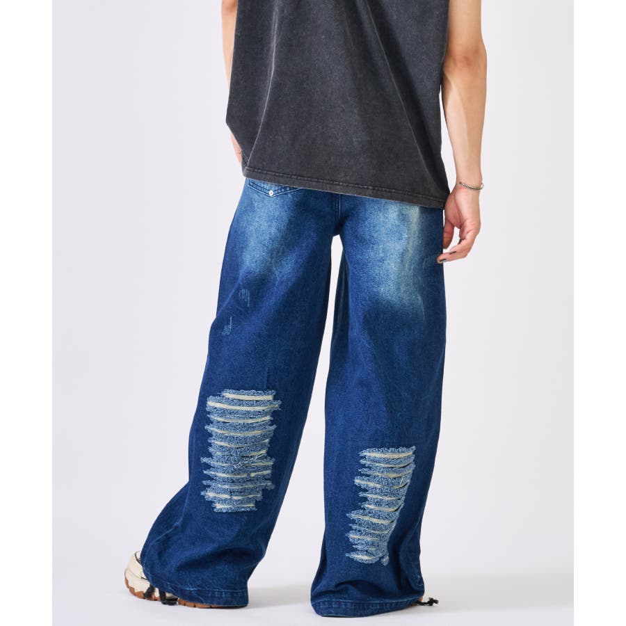 ダメージ感が半端ないデストロイデニム☆ ■detail 腰回りはスマートで超極太なワイドシルエット♪ 裾はドローコードによって太さや長さを調整できる仕様☆ D菅はアクセントとしてのデザインですが、小物をつけたりしても楽しめます(^^♪ ■fabric やや軽めの11.5OZのデニムを使用しているのでワイドシルエットでも穿きやすいのが特徴的! ■styling ストリートスタイルにピッタリでユニセックスに使えてペアコーデにもおすすめです | ||||||||||||||||||||