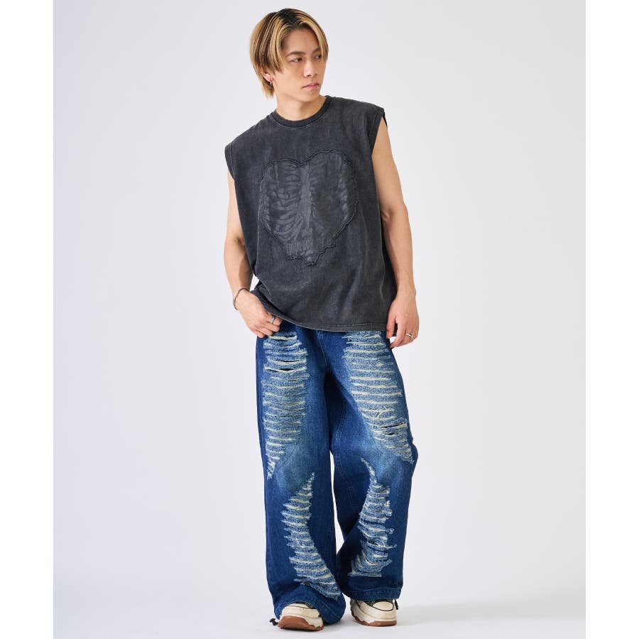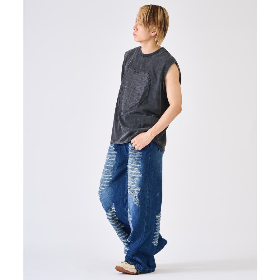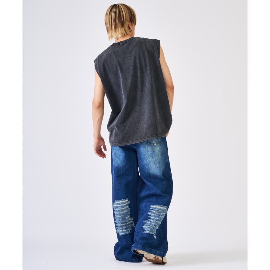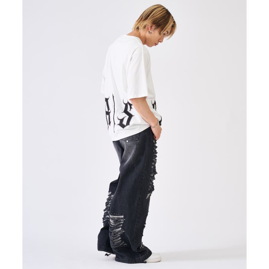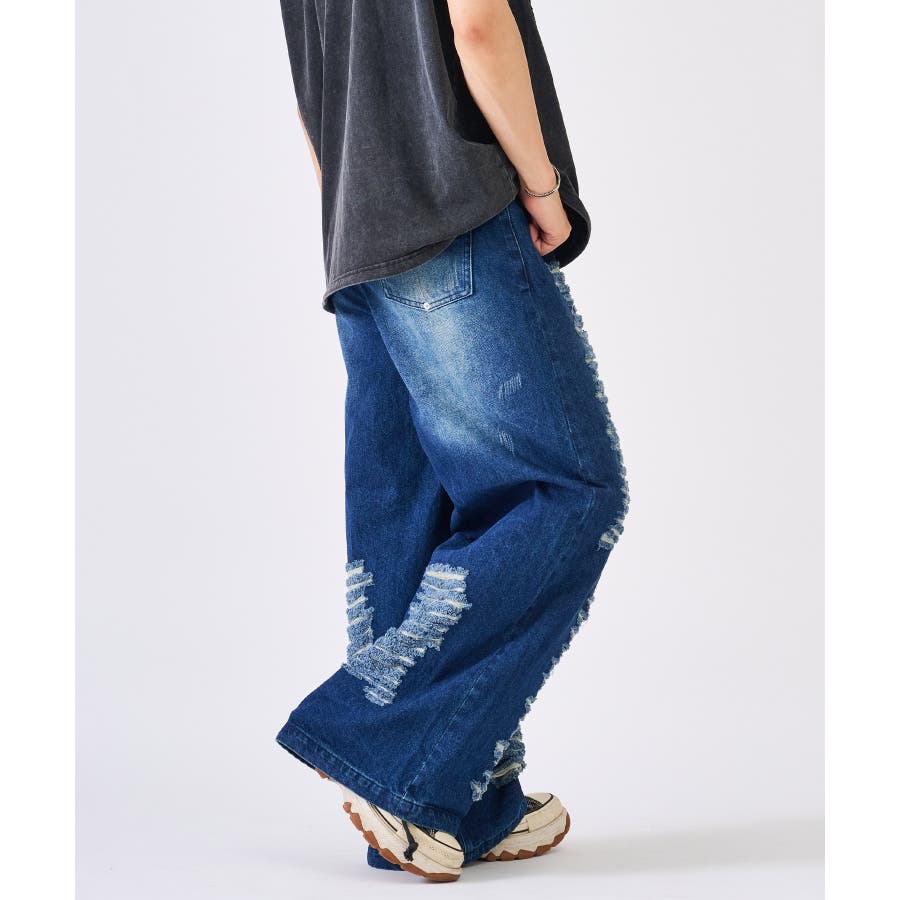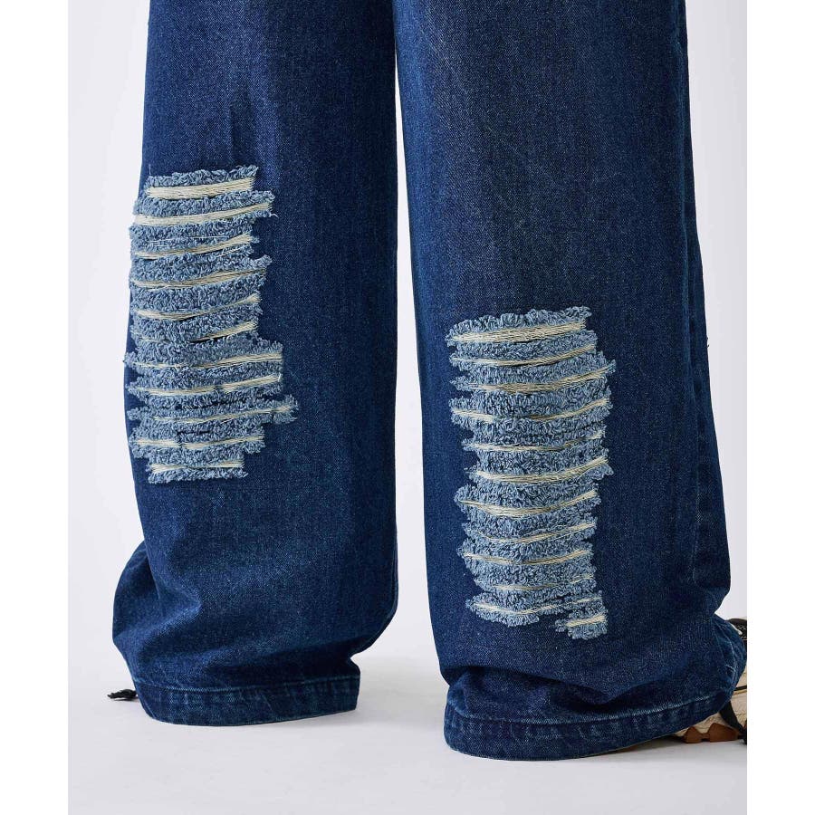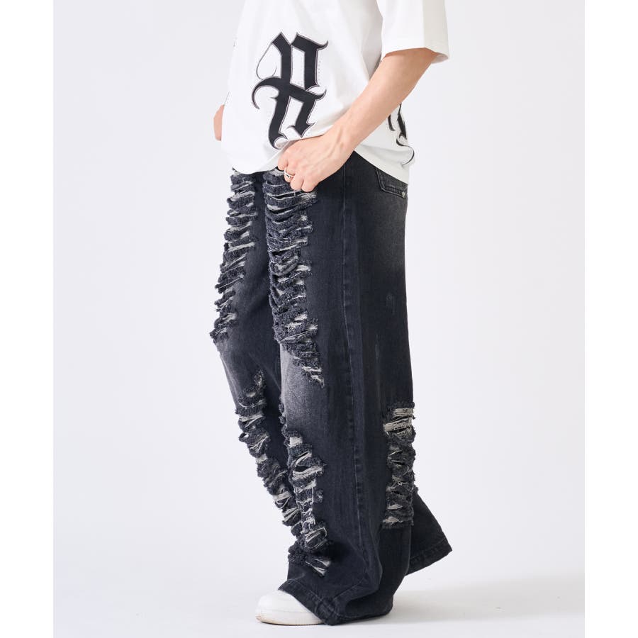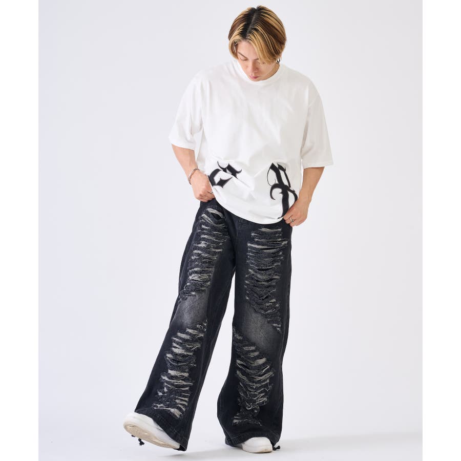ダメージ感が半端ないデストロイデニム☆ ■detail 腰回りはスマートで超極太なワイドシルエット♪ 裾はドローコードによって太さや長さを調整できる仕様☆ D菅はアクセントとしてのデザインですが、小物をつけたりしても楽しめます(^^♪ ■fabric やや軽めの11.5OZのデニムを使用しているのでワイドシルエットでも穿きやすいのが特徴的! ■styling ストリートスタイルにピッタリでユニセックスに使えてペアコーデにもおすすめです | ||||||||||||||||||||