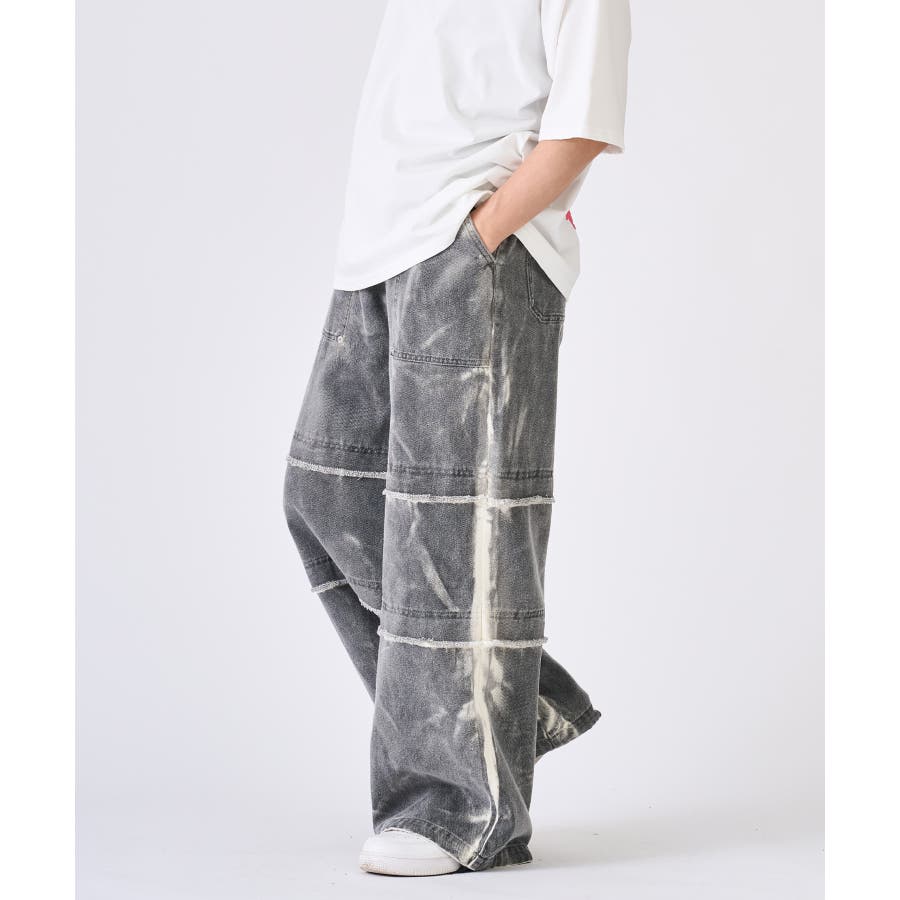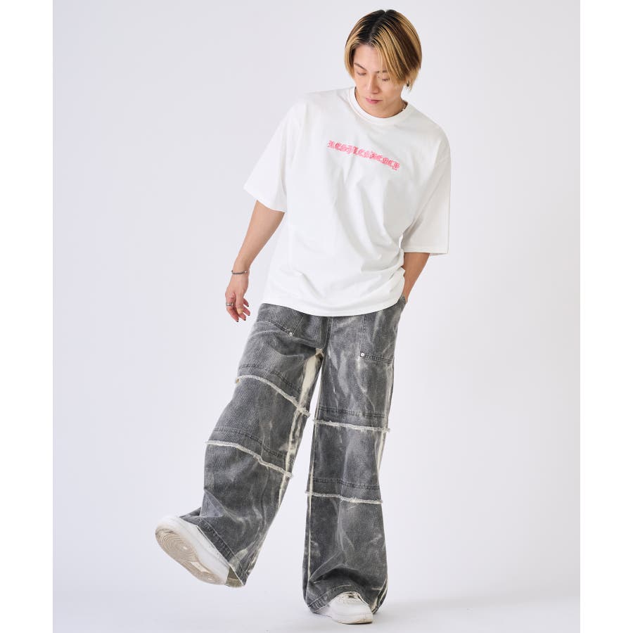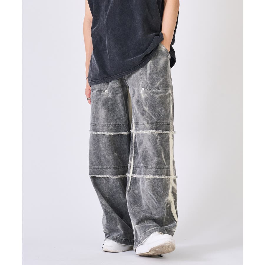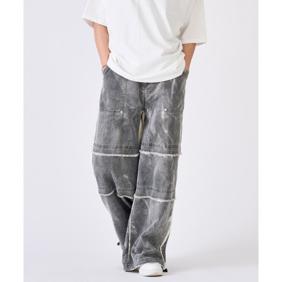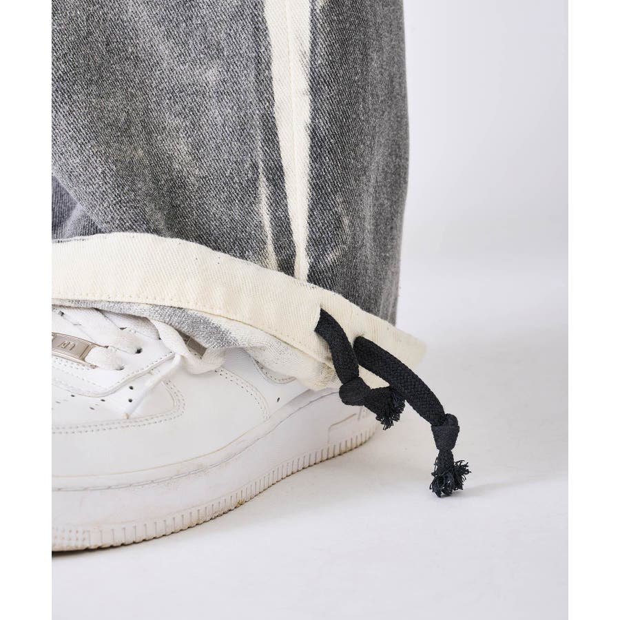 汚れた色合いが特徴のワイドパンツ☆ ■detail スプレーによってランダムに色付けした感じがストリートスタイルらしいデザイン! 膝の部分は敢えて縫い繋いだデザインで、縫いしろ部分がはみ出してフリンジ仕上げになっているのも特徴的☆ 股上深めのハイウエストで脚長にも見えるワイドシルエット(^^♪ 裾にはドローコードを装備し長さやシルエットの調整もできます☆ ■fabric 綿のカツラギ生地を仕様し、独特の張り感がワークパンツらしい! また、カツラギは肌触りがドライでさらっとした履き心地☆ ■styling ユニセックスで着用できるアイテムで、汚れを気のせず白のコーデが楽しめます(^^) | ||||||||||||||||||||