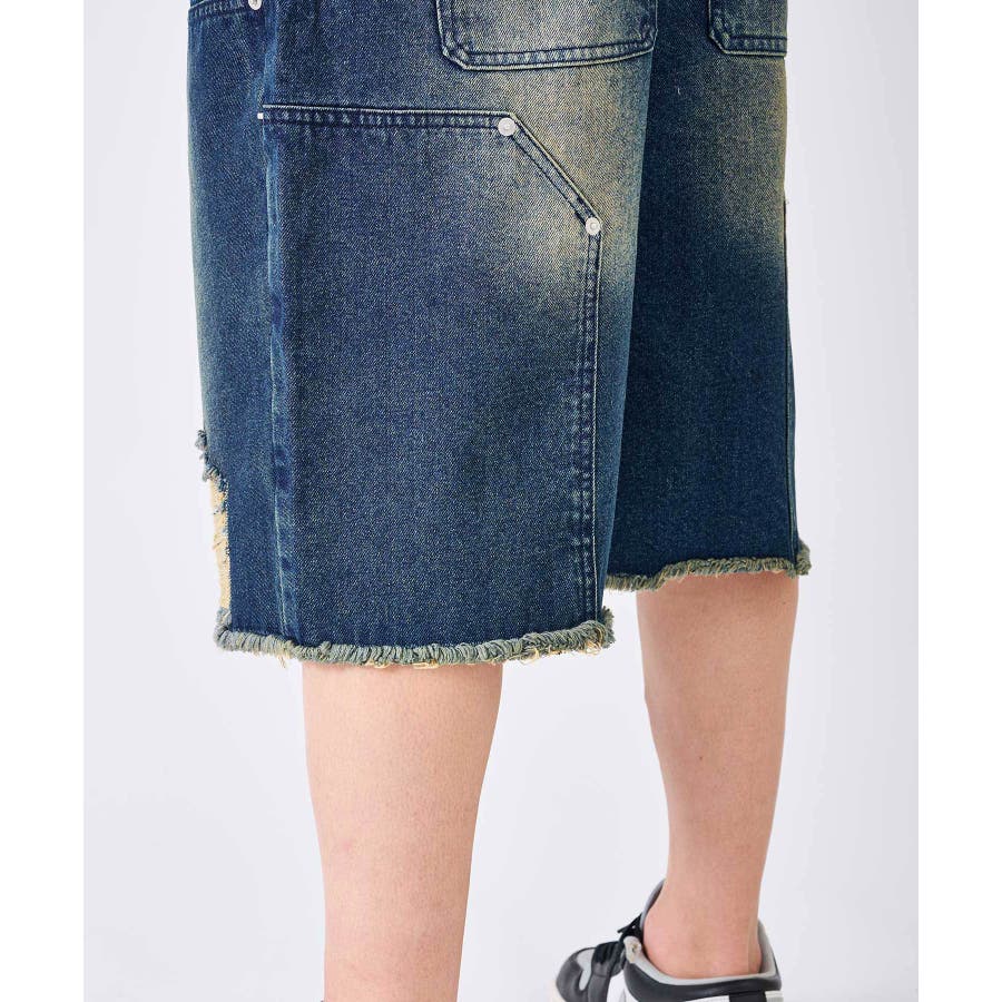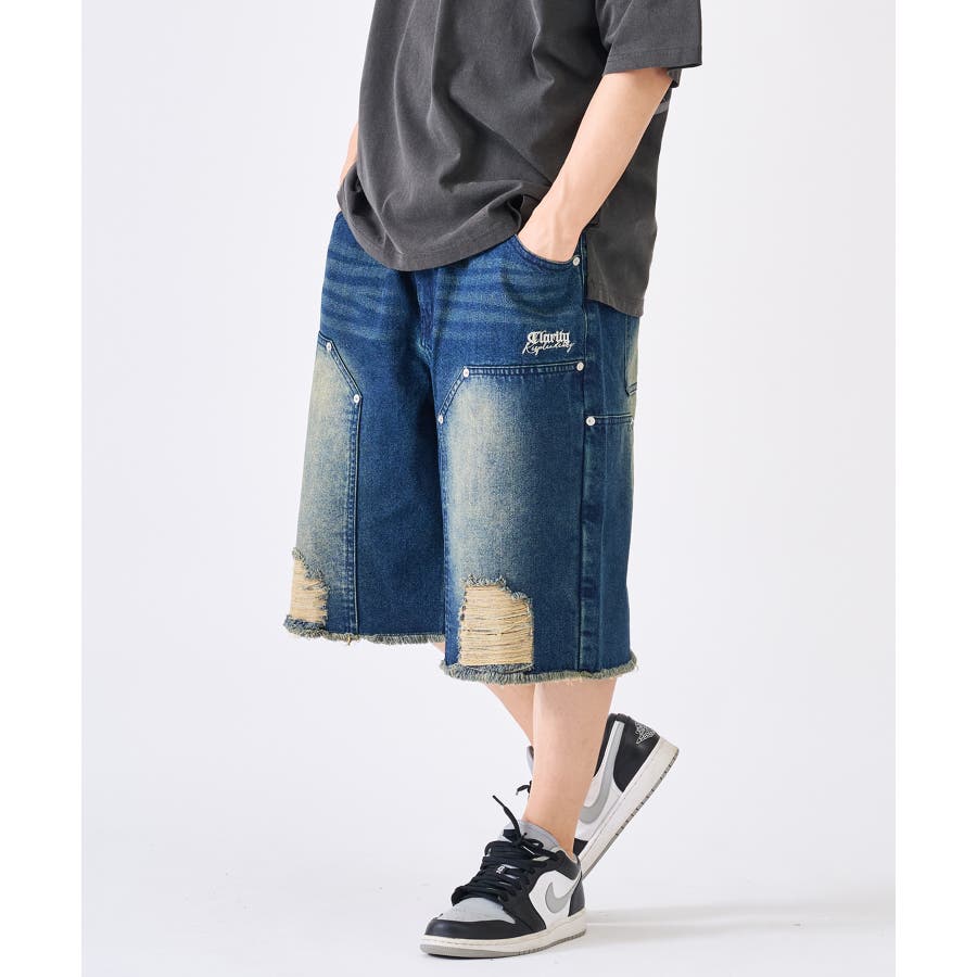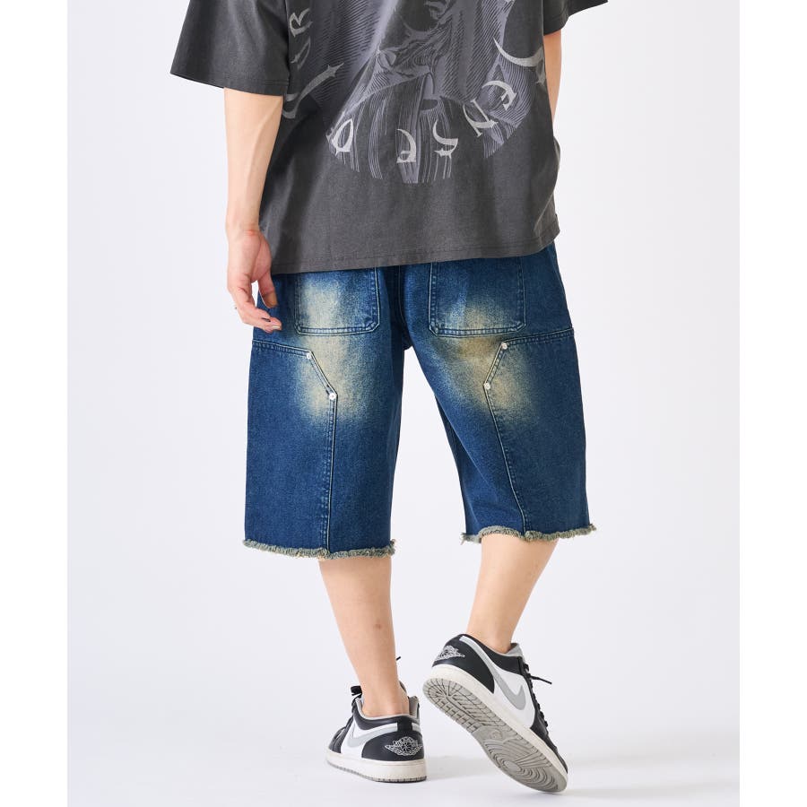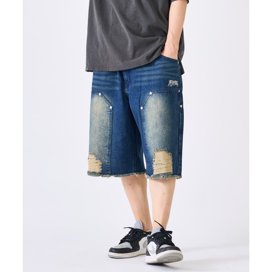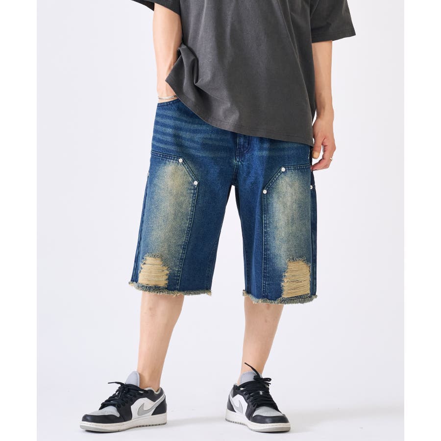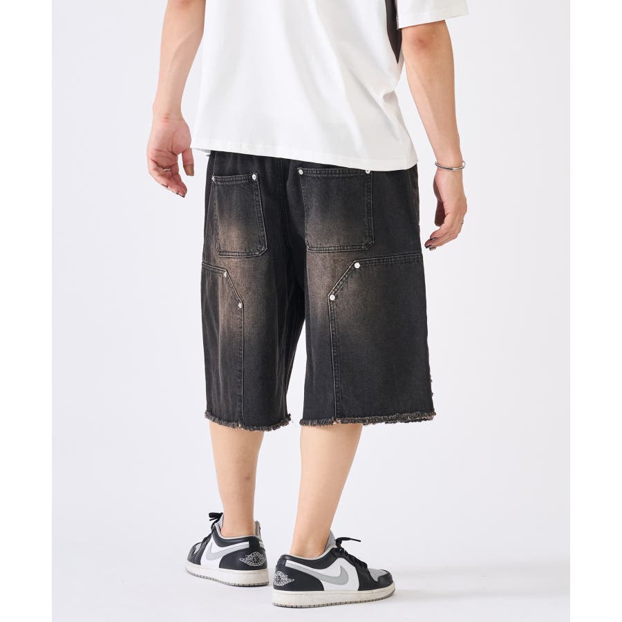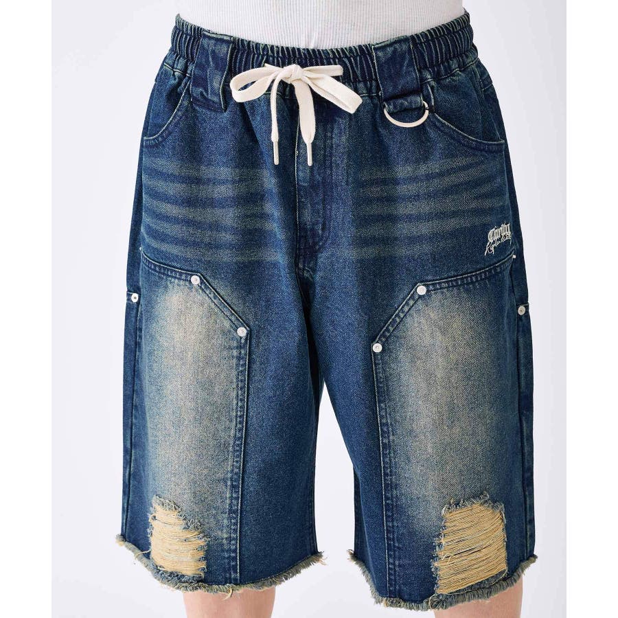 | ダブルニーのデニムショートパンツ☆ ■detail ウエストはシャーリング&ドローコードでサイズ調整ができるデザイン☆ 裾にダメージ加工した膝丈のオーバーサイズなシルエットで楽ちん☆ ■fabric やや軽めの11.5OZのデニムを使用しているので夏でも穿きやすい☆ ■styling ストリートスタイルではマストなかっこいいショートパンツ! ユニセックスに使えて、カップルコーデやペアコーデにピッタリなアイテムです | ||||||||||||||||||||