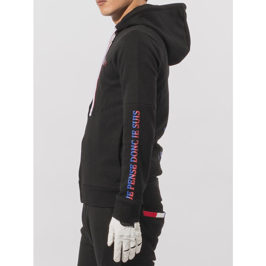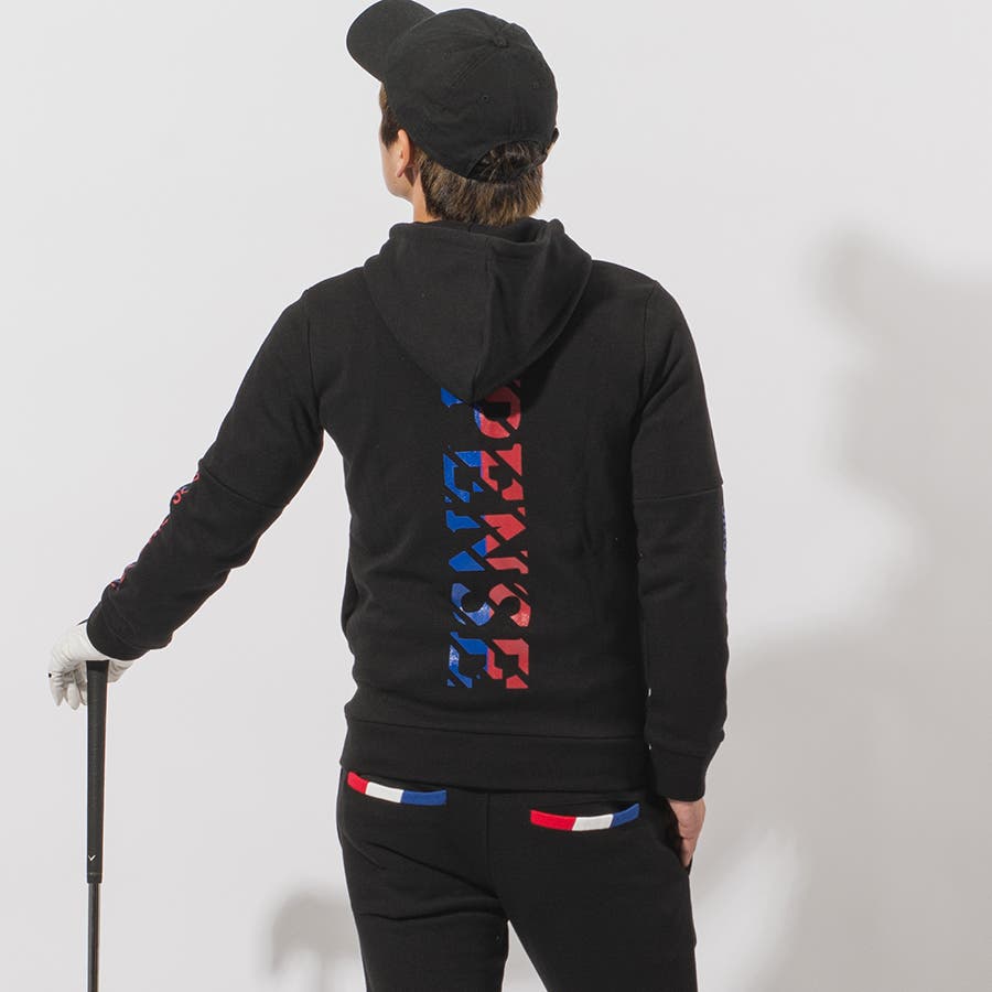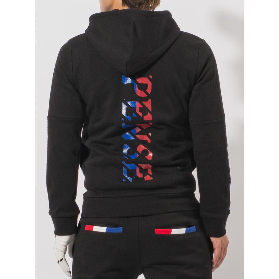 ジャストフィットのサイズ感でサイドにポケットを配置したフルジップパーカーは、Tシャツの上に気軽に羽織れる定番的アイテムですが、背中、両袖にトリコロールの配色でプリントされたロゴが印象的なデザインです。