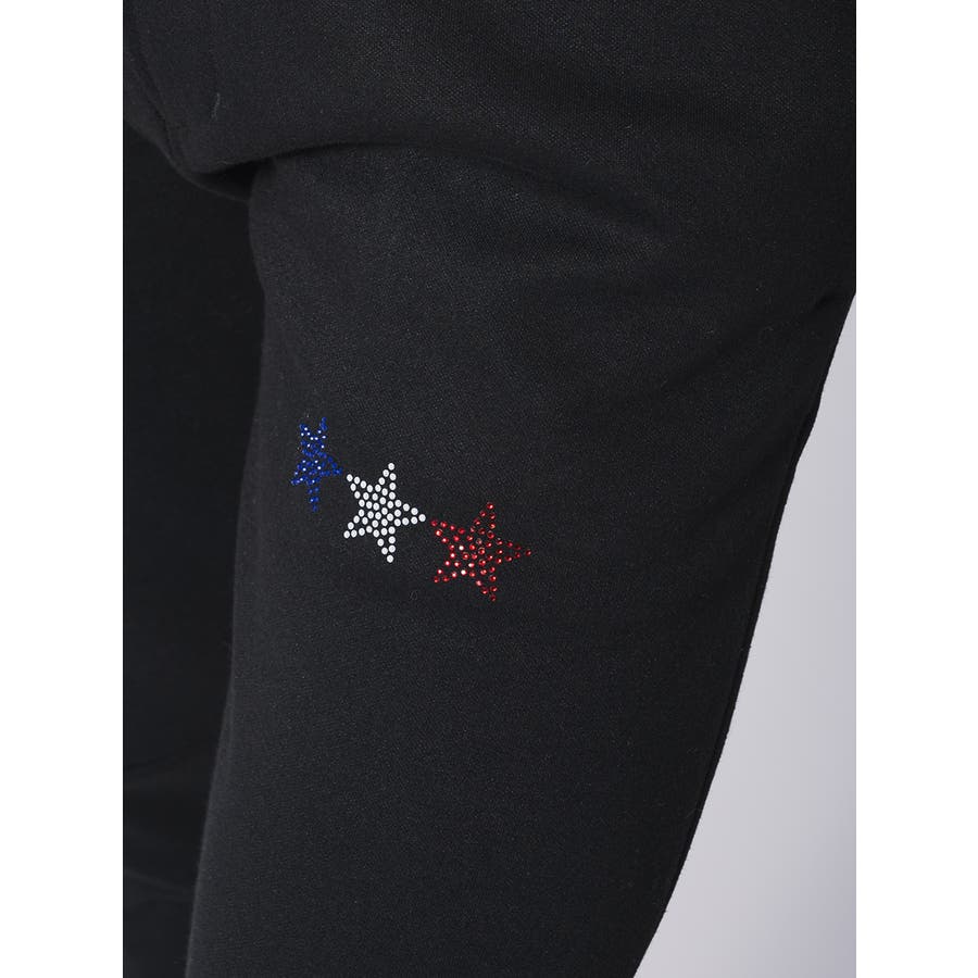 プリントカラーに合わせて配置した太腿部分のラインストーンの星が印象的で、ヒップポケットの縁を3色でトリミングした拘りは後ろ姿もクールに演出します。
