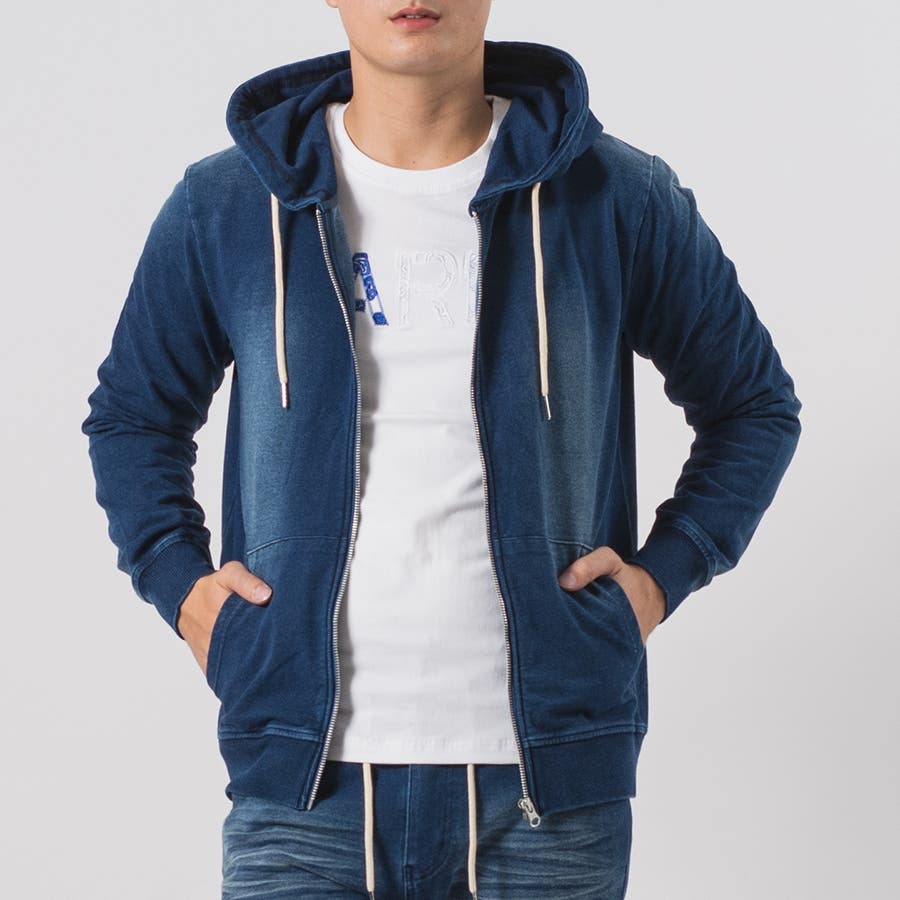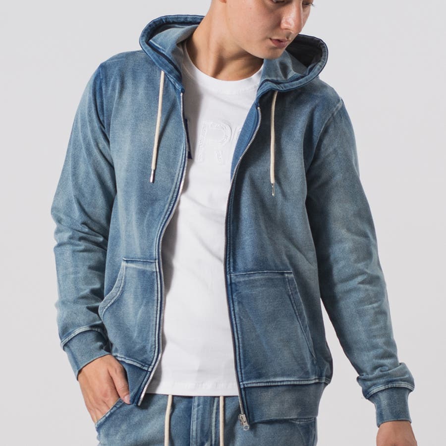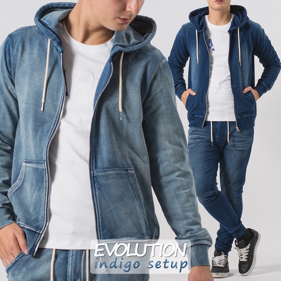 カットソーのデニム素材を使用したジップパーカーとジョガーパンツのセットアップです。