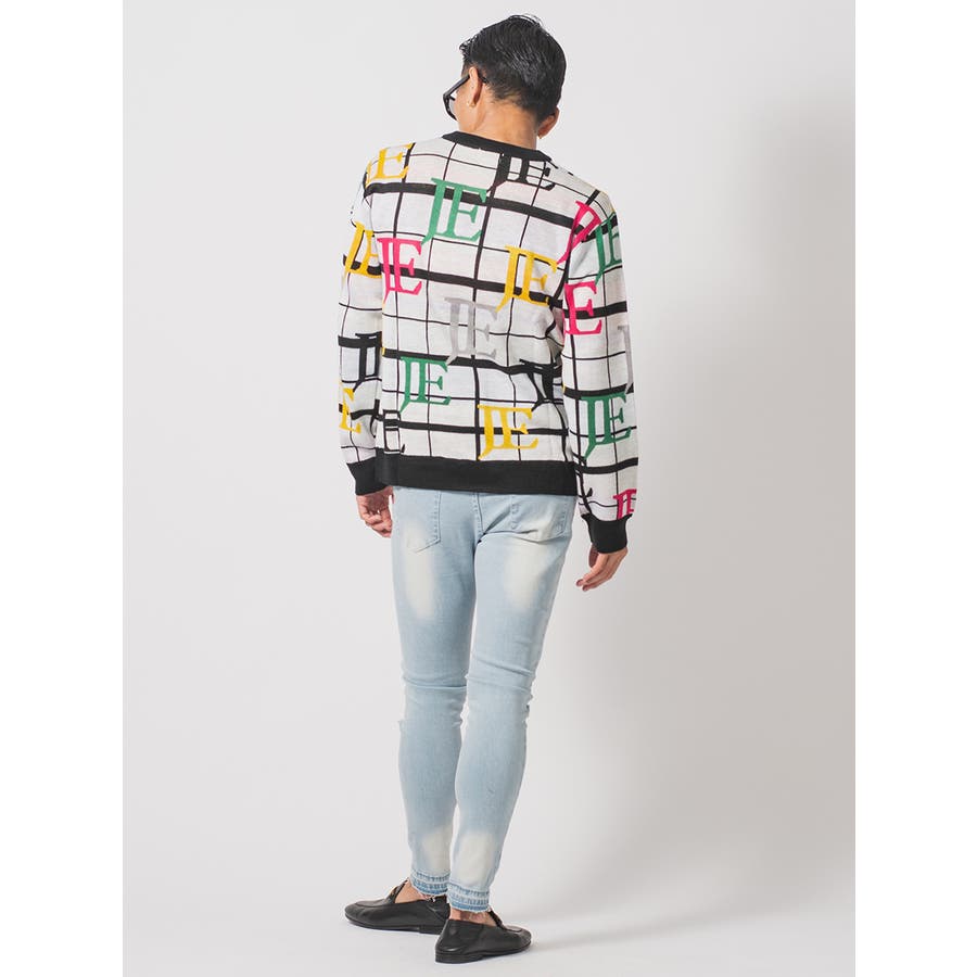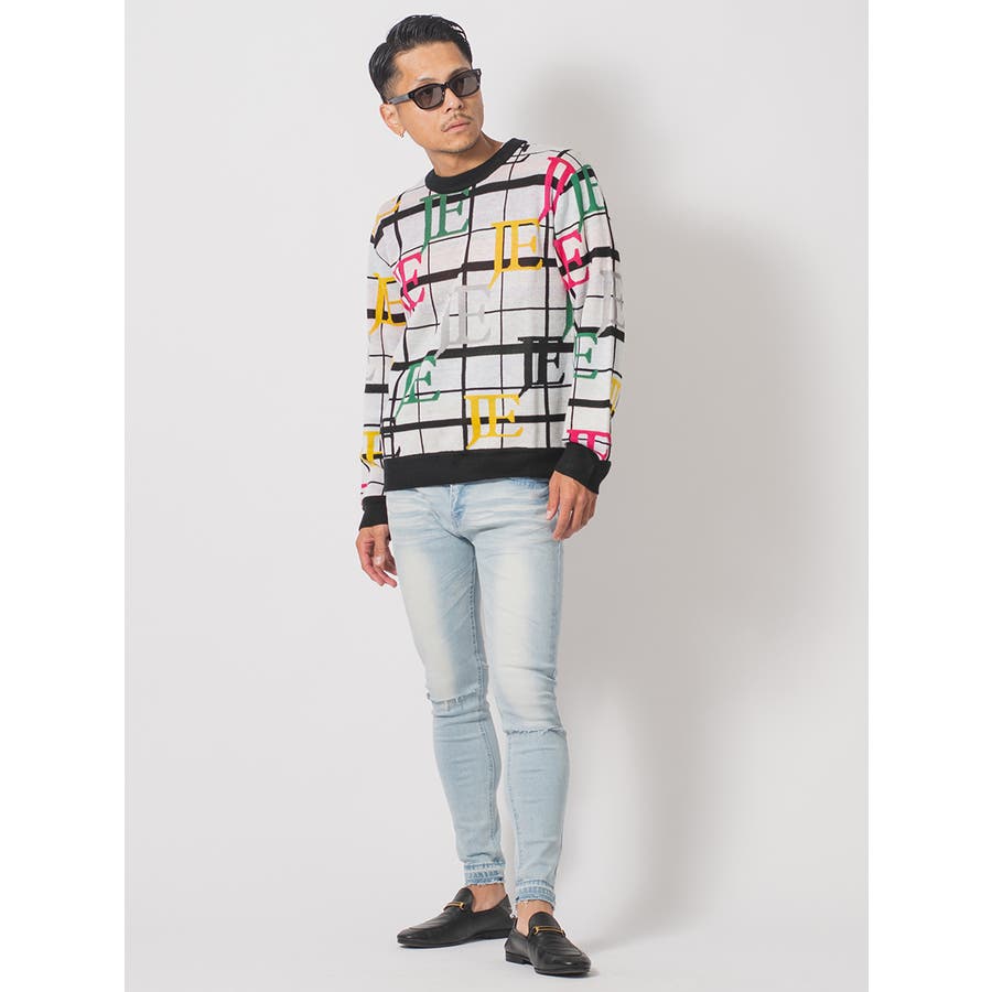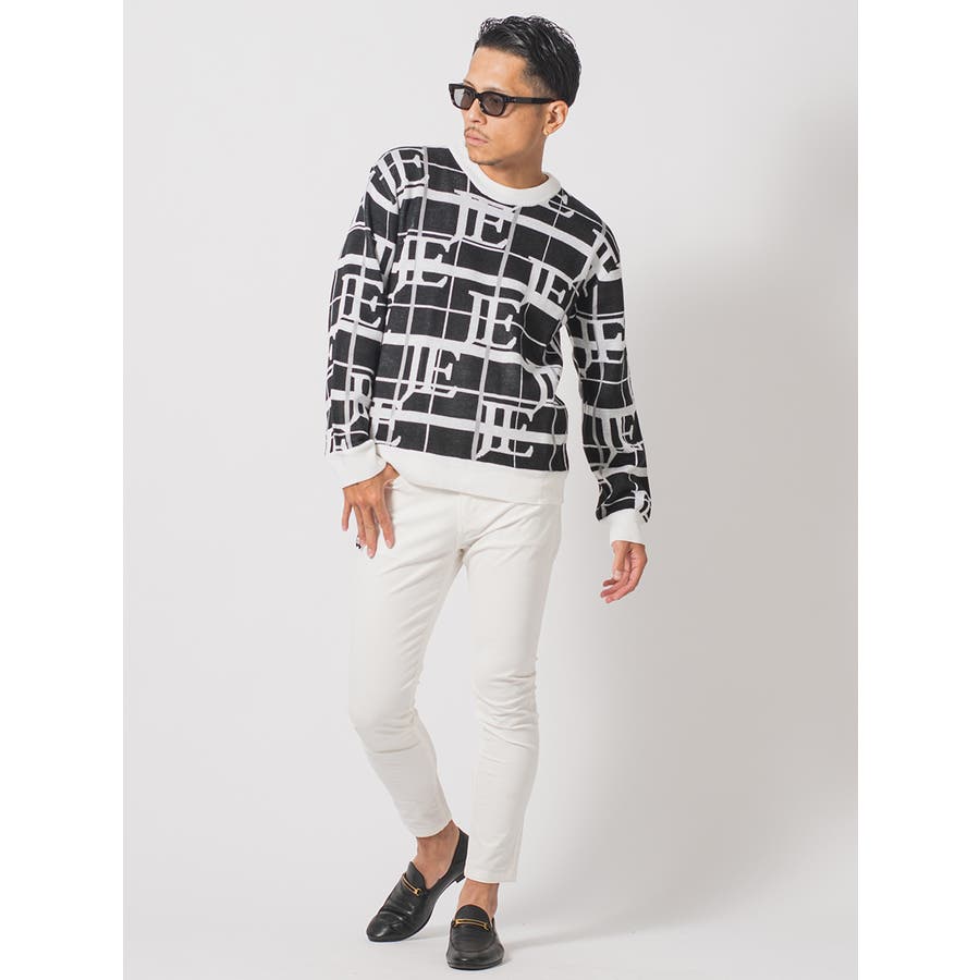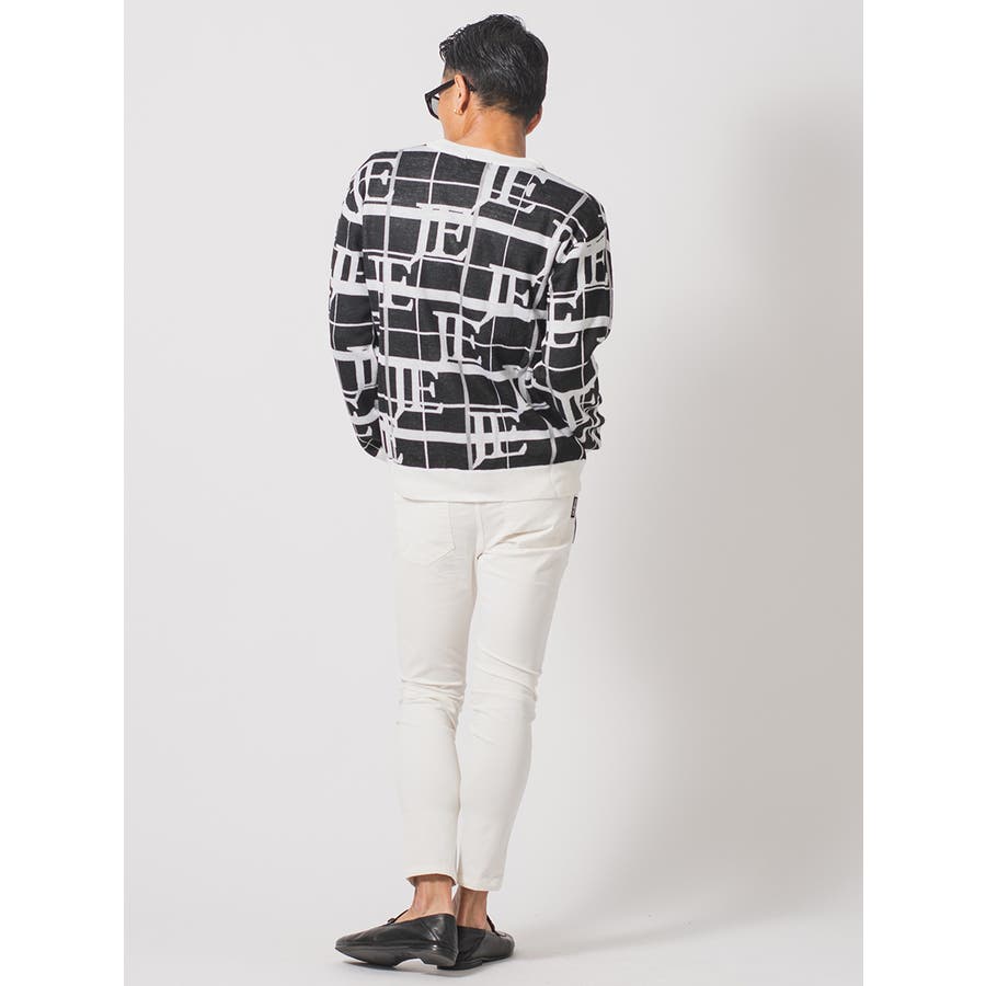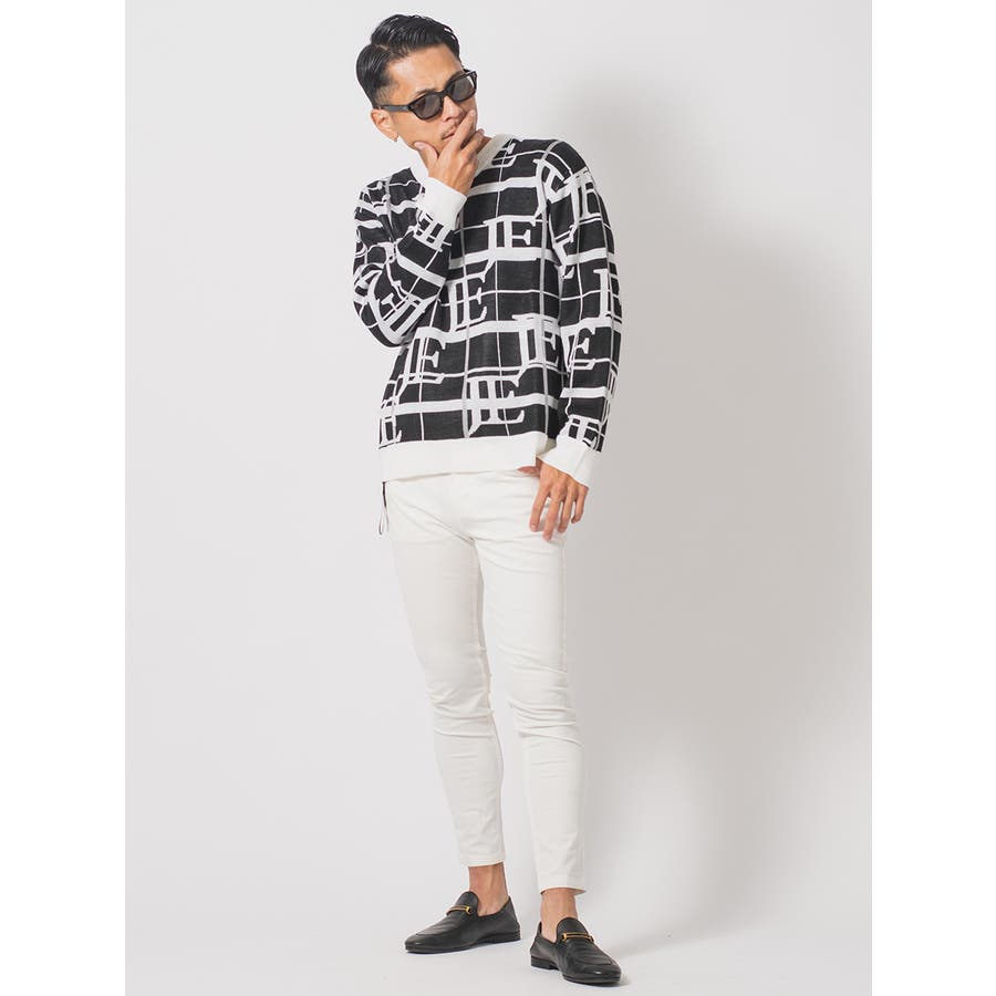 ジャカードの総柄ニットは、この所80年代のレトロなアイテムが復活している中の一つとして注目されています。一枚でも存在感があり、アウターの下で時折覗かせる柄がアクセントになりコーデを格上げしてくれます。また室内でアウターを脱いだ時にその存在感は一気に高まりセンスを感じさせるアイテムです。こちらはロゴとウィンドペーンを組み合わせたデザインでカラーパターンとモノトーンのタイプがあります。またチクチクしないソフトな肌触りでルーズすぎないシルエットはインナーとして着やすくイージーケアなアイテムです。