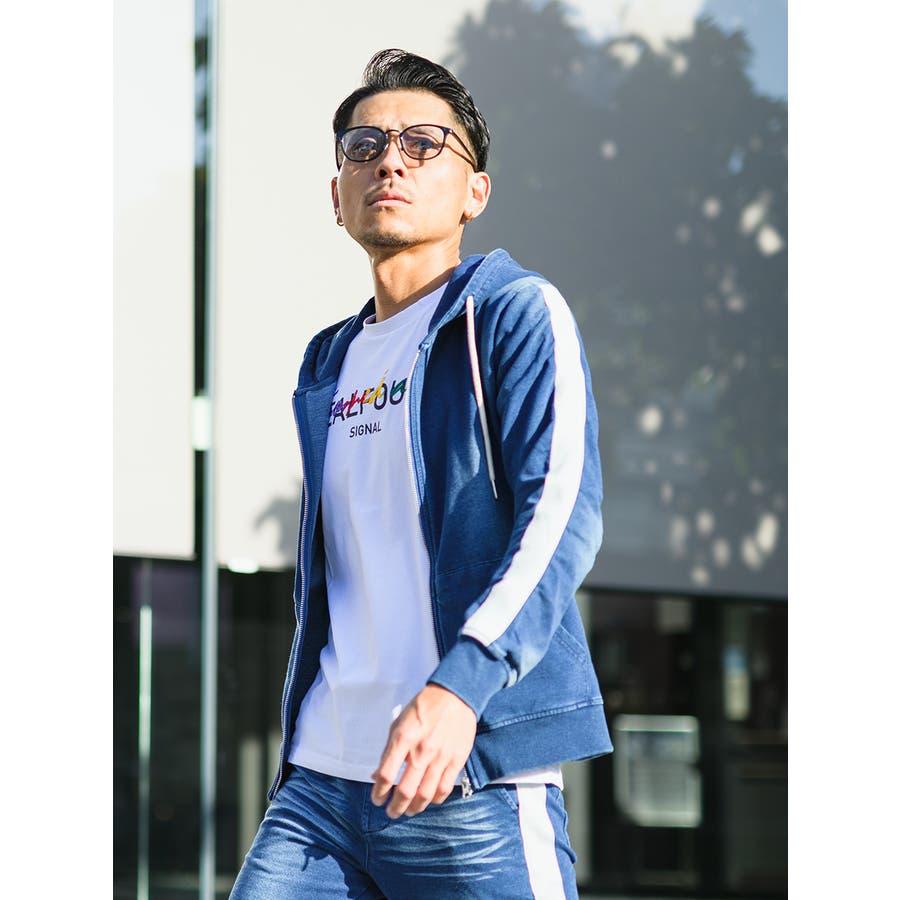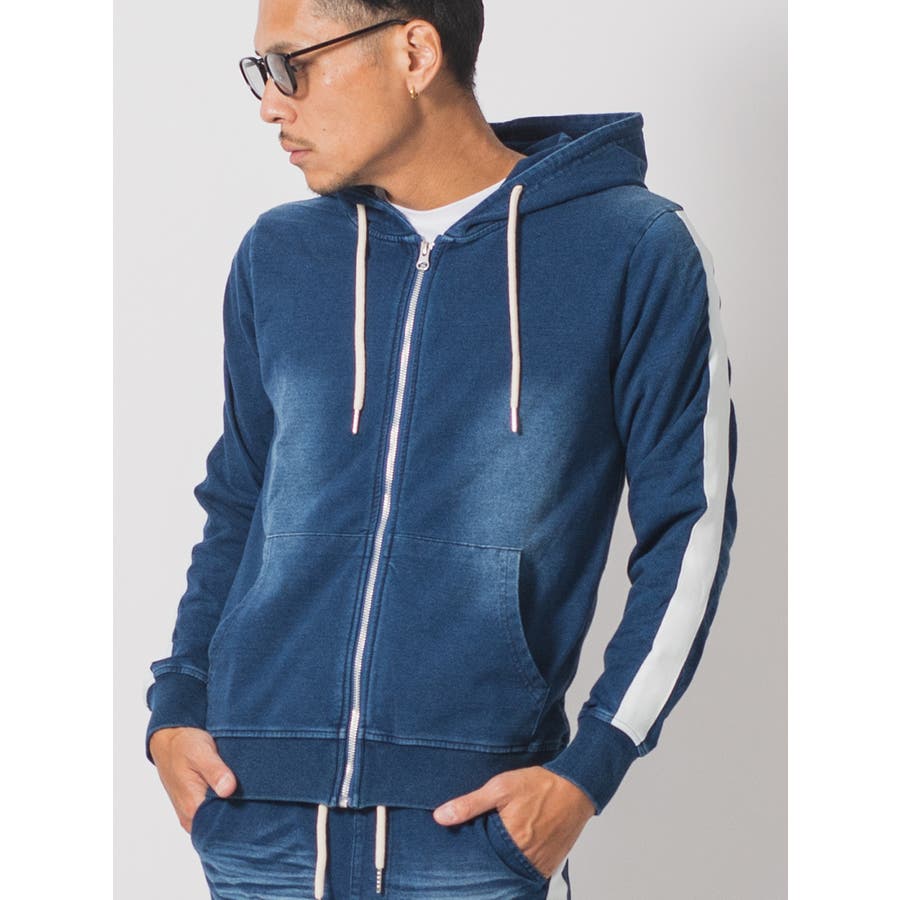 スウェット素材でありながらインディゴのブルーの色合い、そしてその色の落ち具合、擦れ具合がまるでデニムその物のような雰囲気です。サイドラインはテープの様な広い幅がアクセントになっていて全体を間延びさせずスマートなシルエットを印象付けます。セットアップではありますが、パーカーとジョガーパンツそれぞれでも様になるので一着で3通りの着こなしができるだけでなく、シーズン長く着られてヘビロテできるアイテムです。