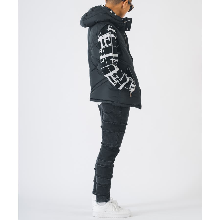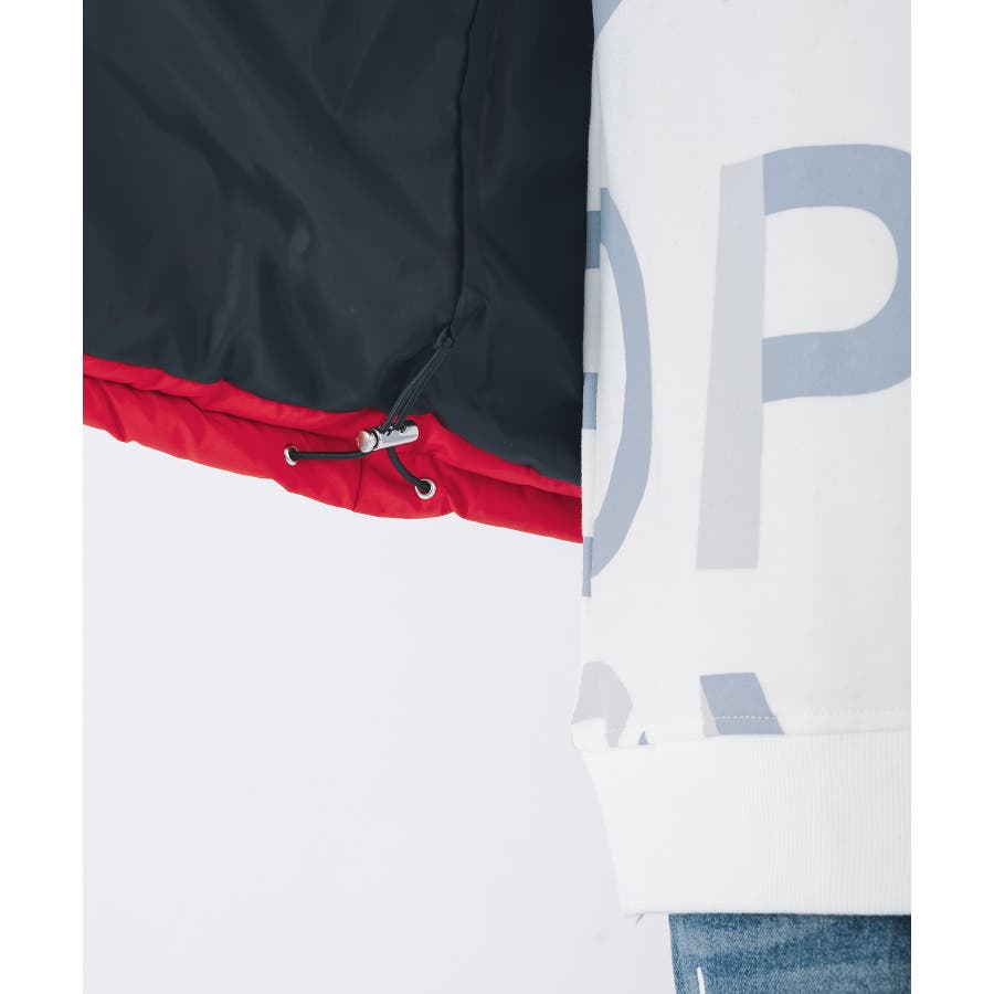 フードが脱着できるタイプで2WAYの着回しができ、襟周りに配置したロゴがアクセントになっています。